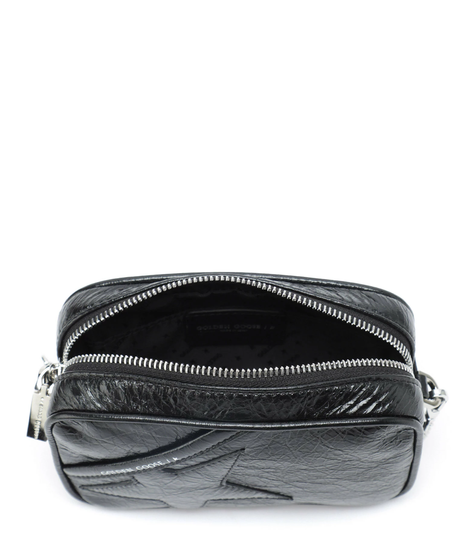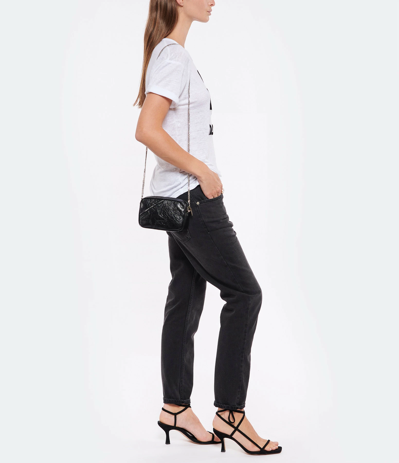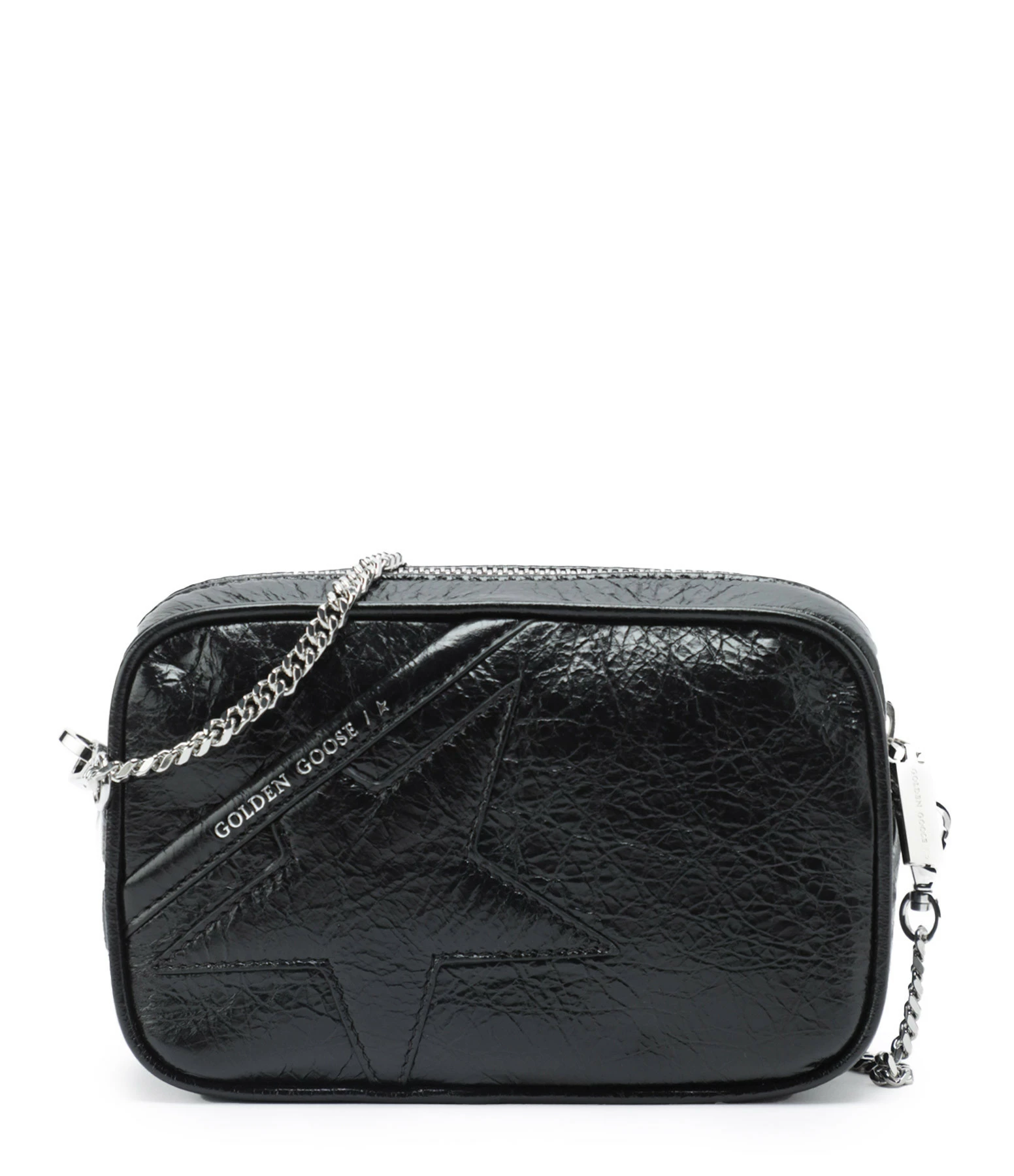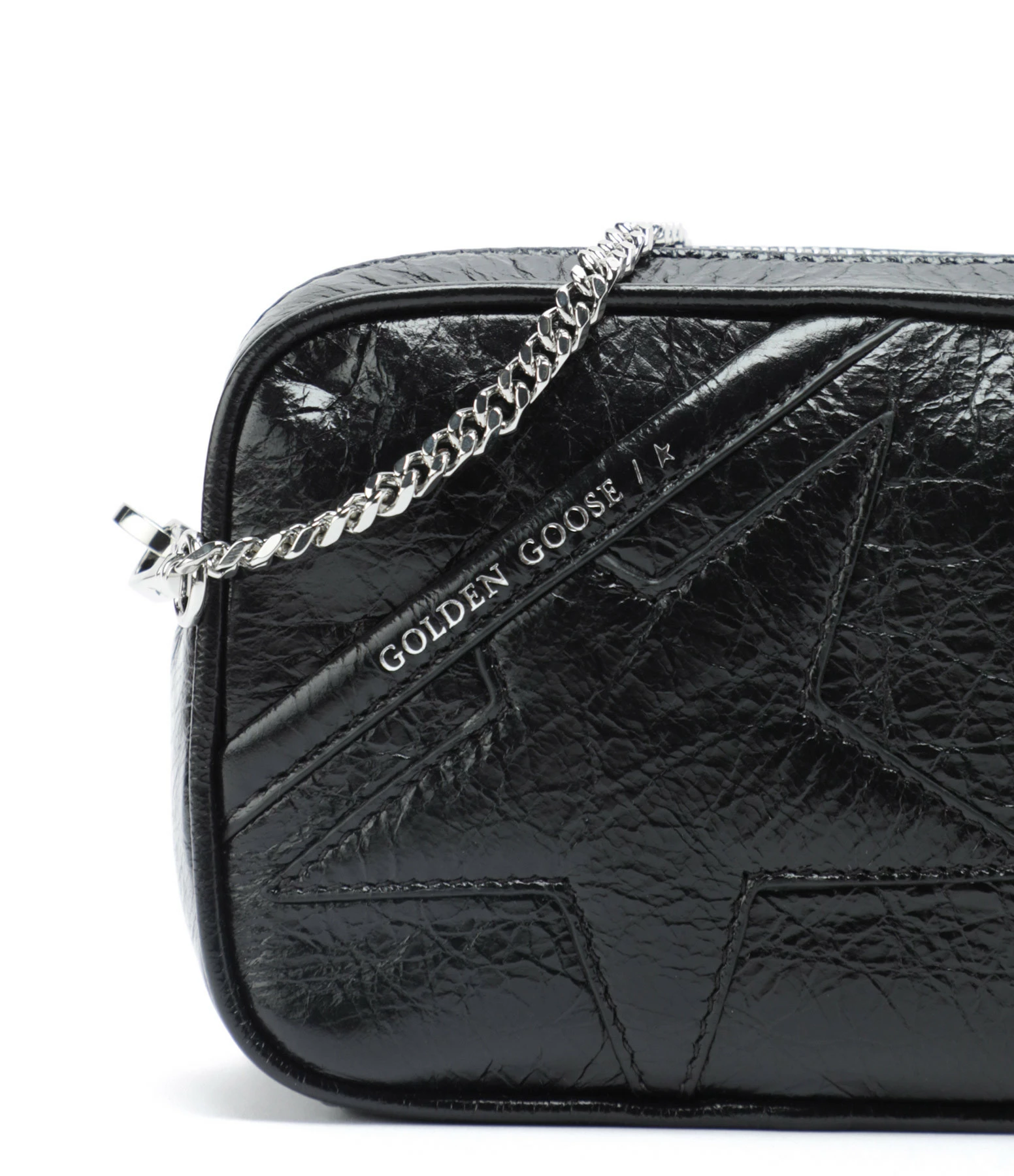 Petit sac bandoulière en cuir froissé noir avec étoile cousue sur l’avant. Bandoulière chaîne argentée amovible par mousquetons. Intérieur doublé en tissu avec une poche plaquée.