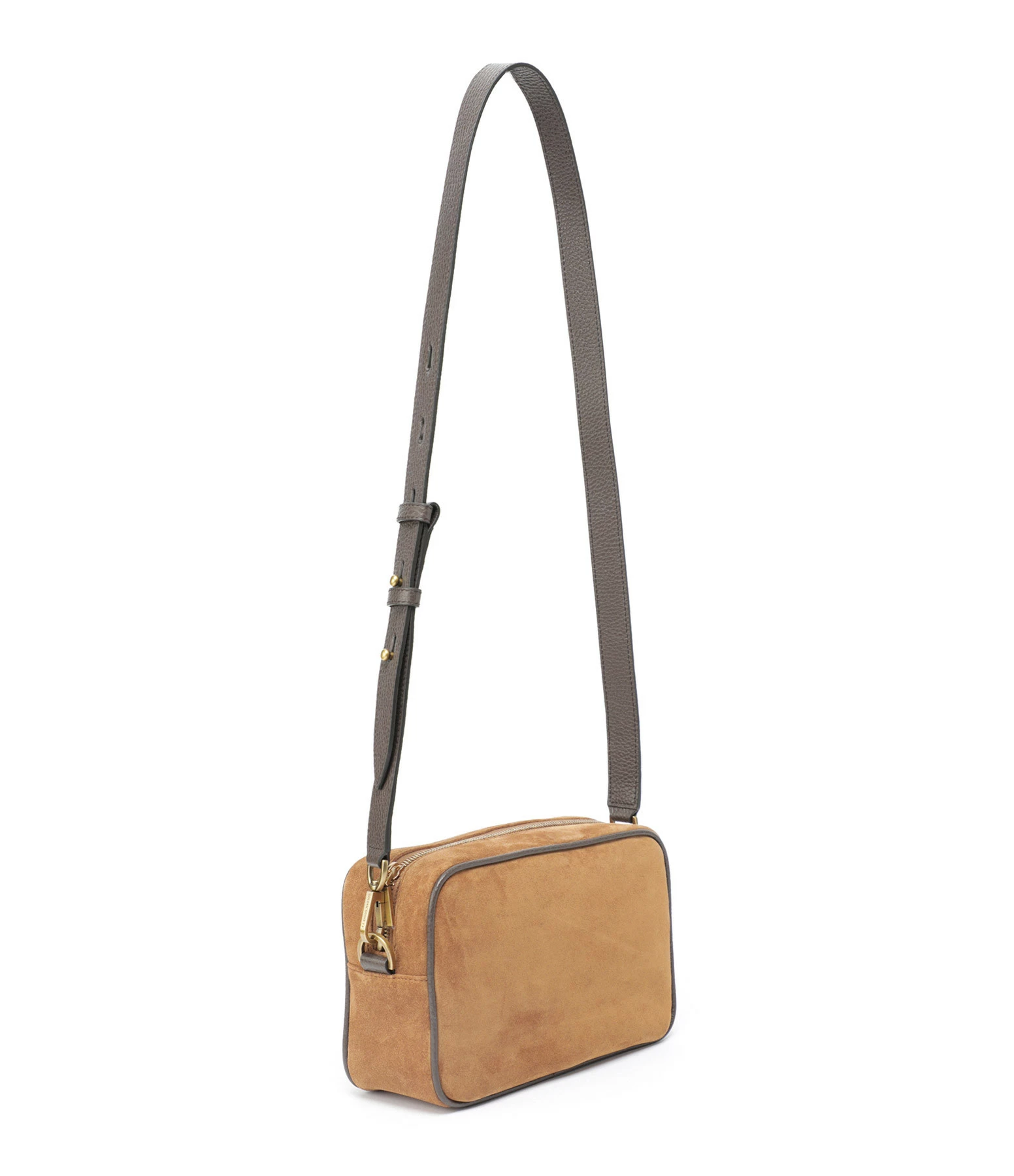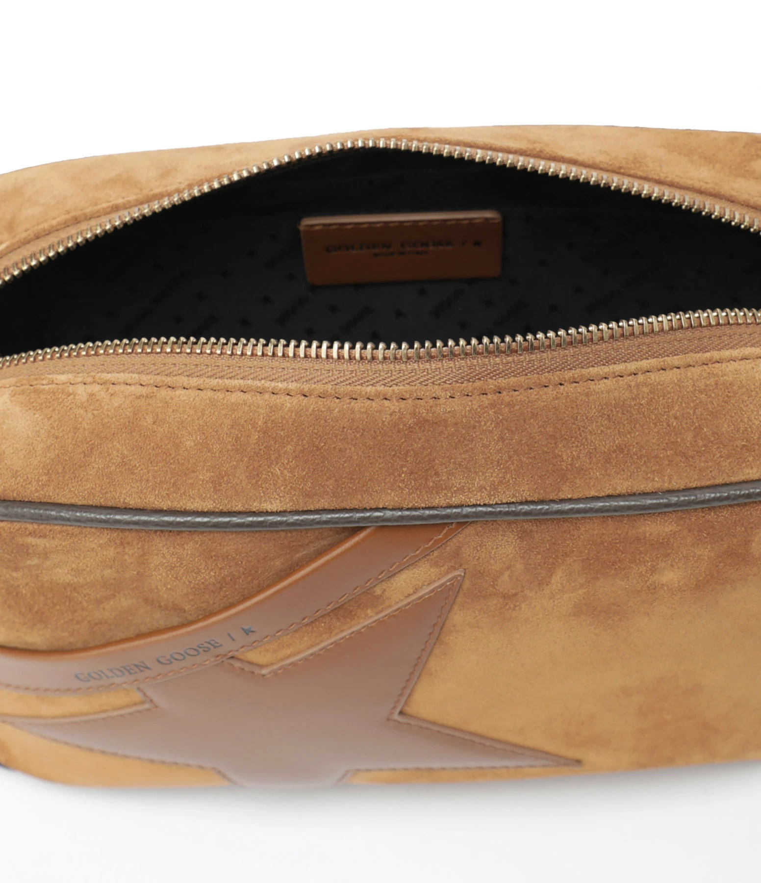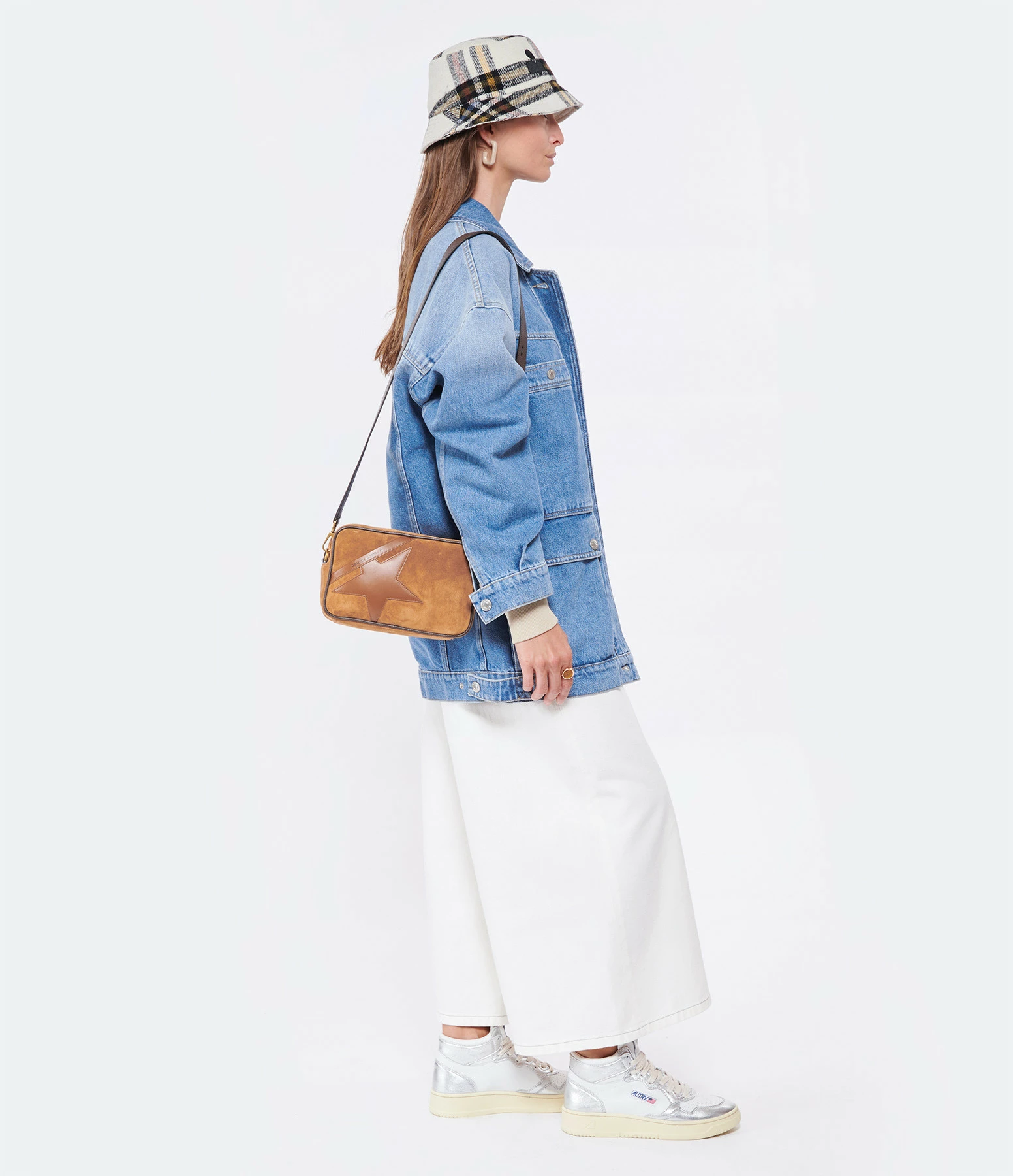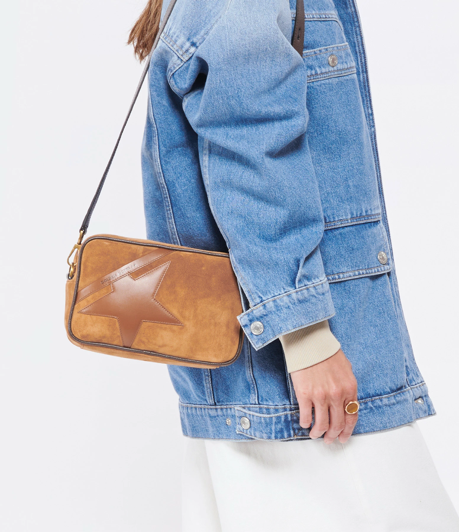 Sac bandoulière en cuir suédé marron. Une poche plaquée à l’avant avec étoile en cuir cousue dessus. Bandoulière amovible par mousquetons réglable sur six longueurs. Intérieur doublé en tissu avec une poche plaquée.