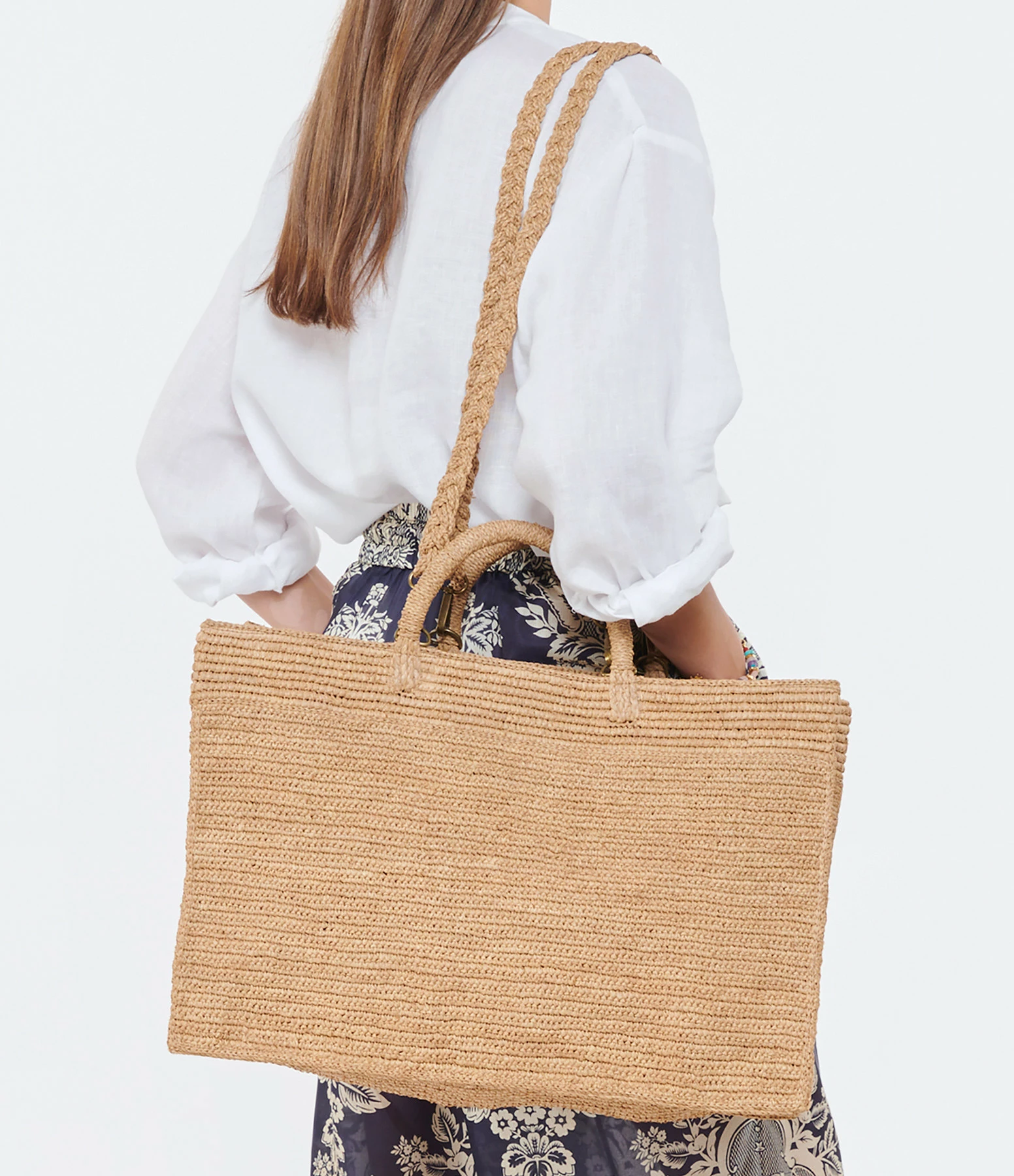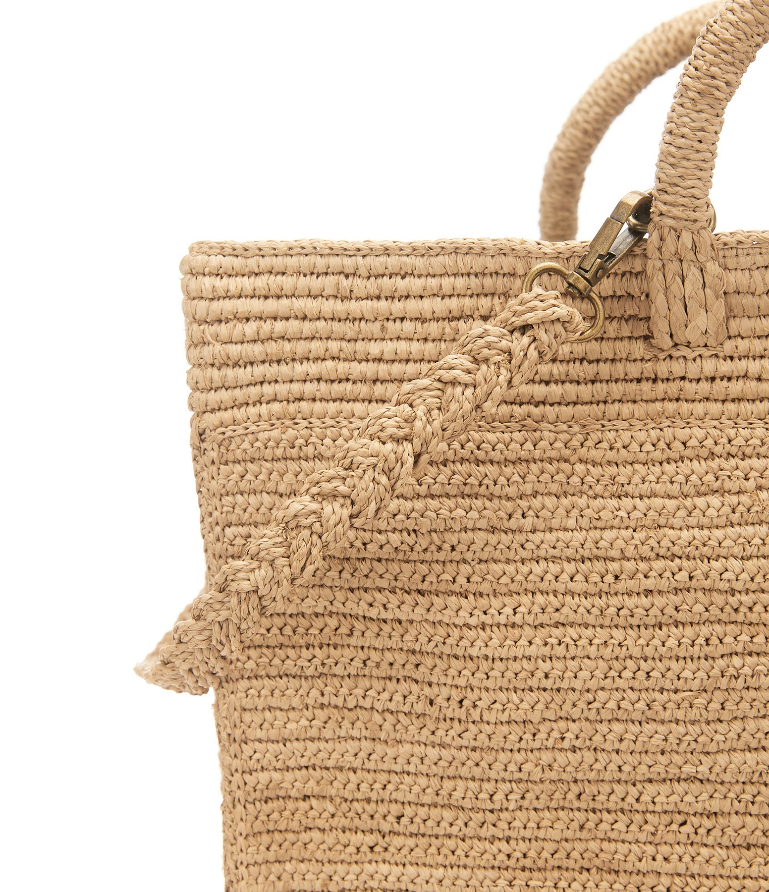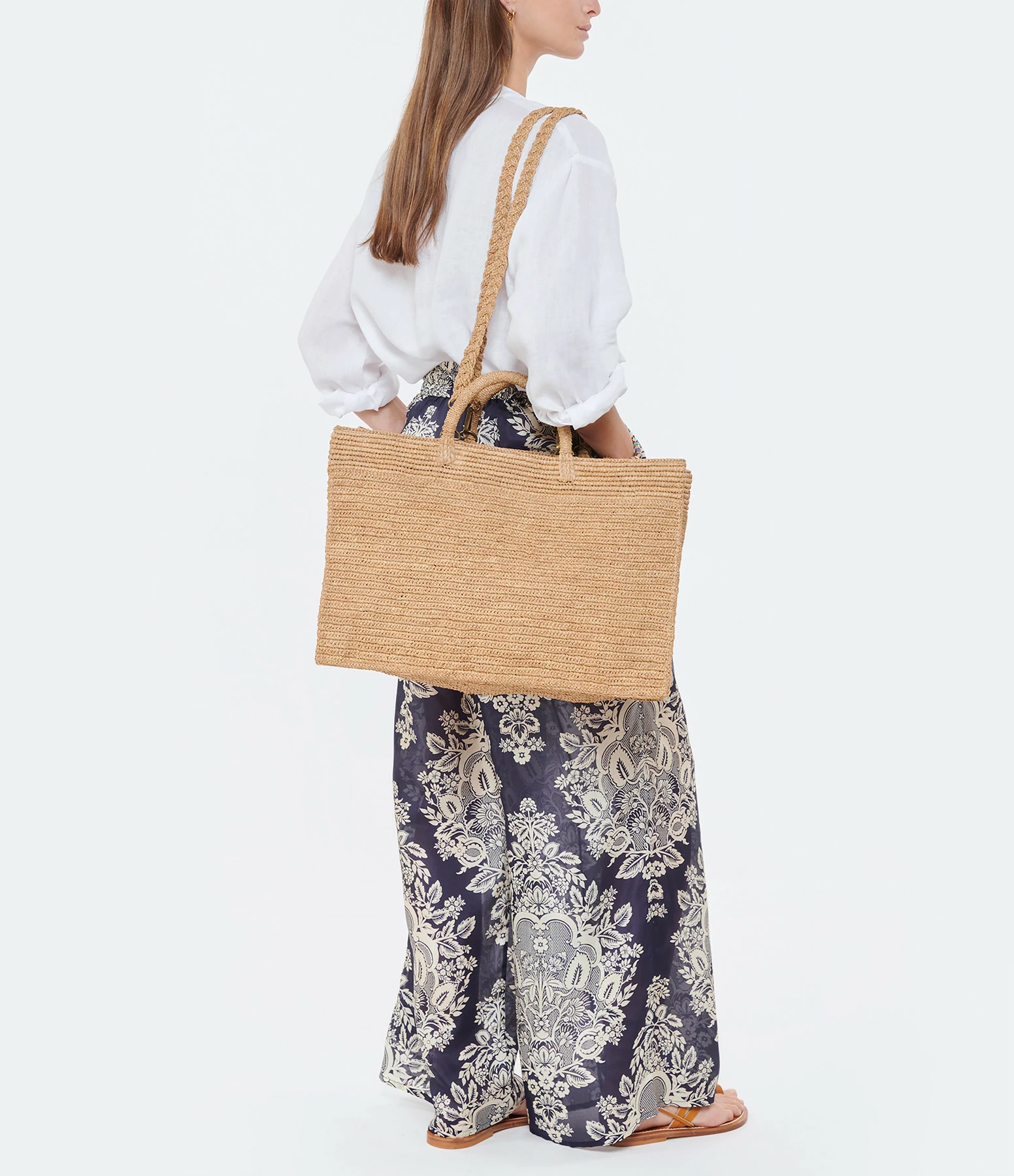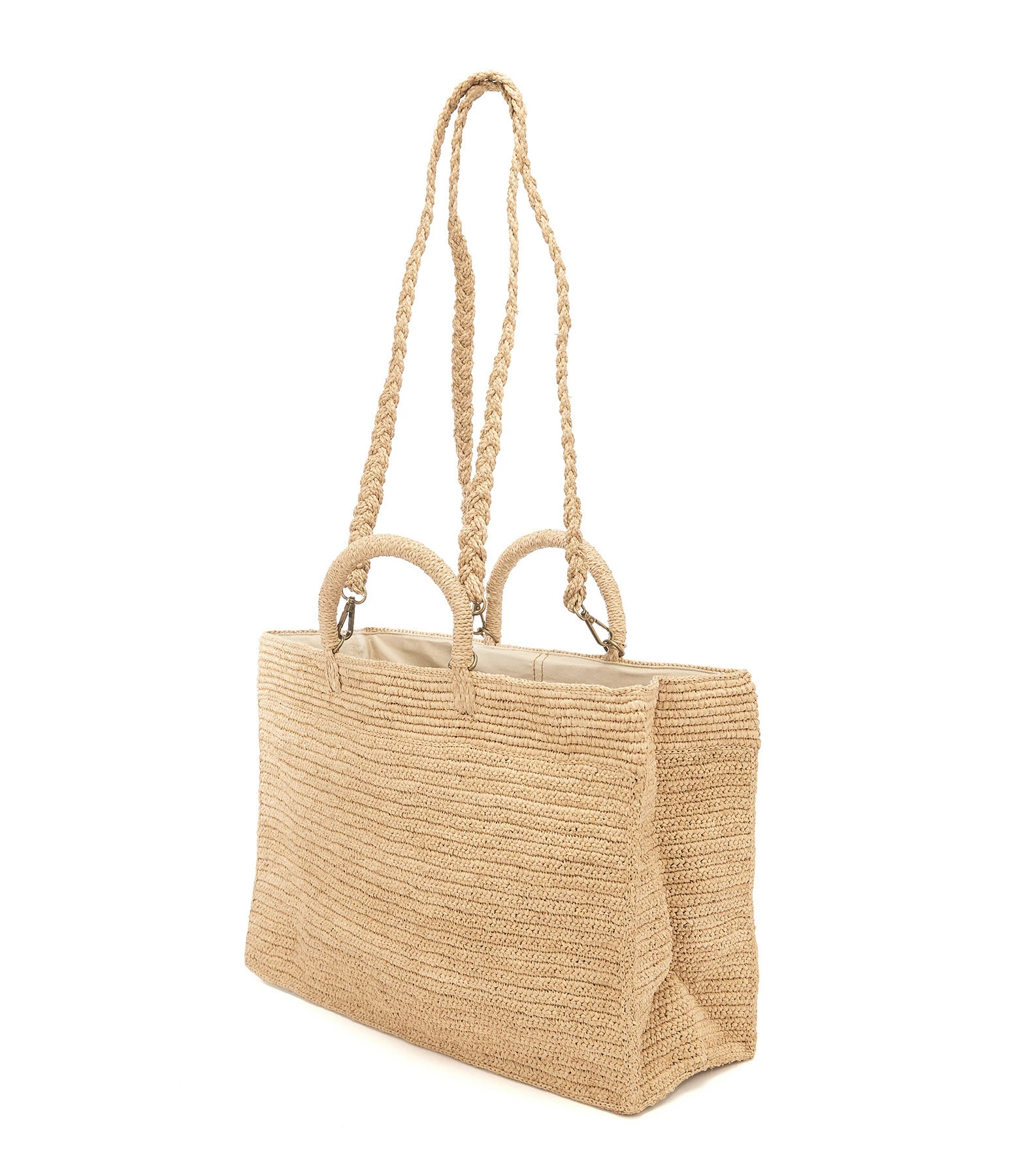 Sac cabas noir Anjara en raphia beige. Deux anses et deux bandoulières tressées amovibles par mousquetons. Fermeture bouton aimanté dissimulé. Doublure en coton avec deux poches plaquées et deux poches passepoilées.
