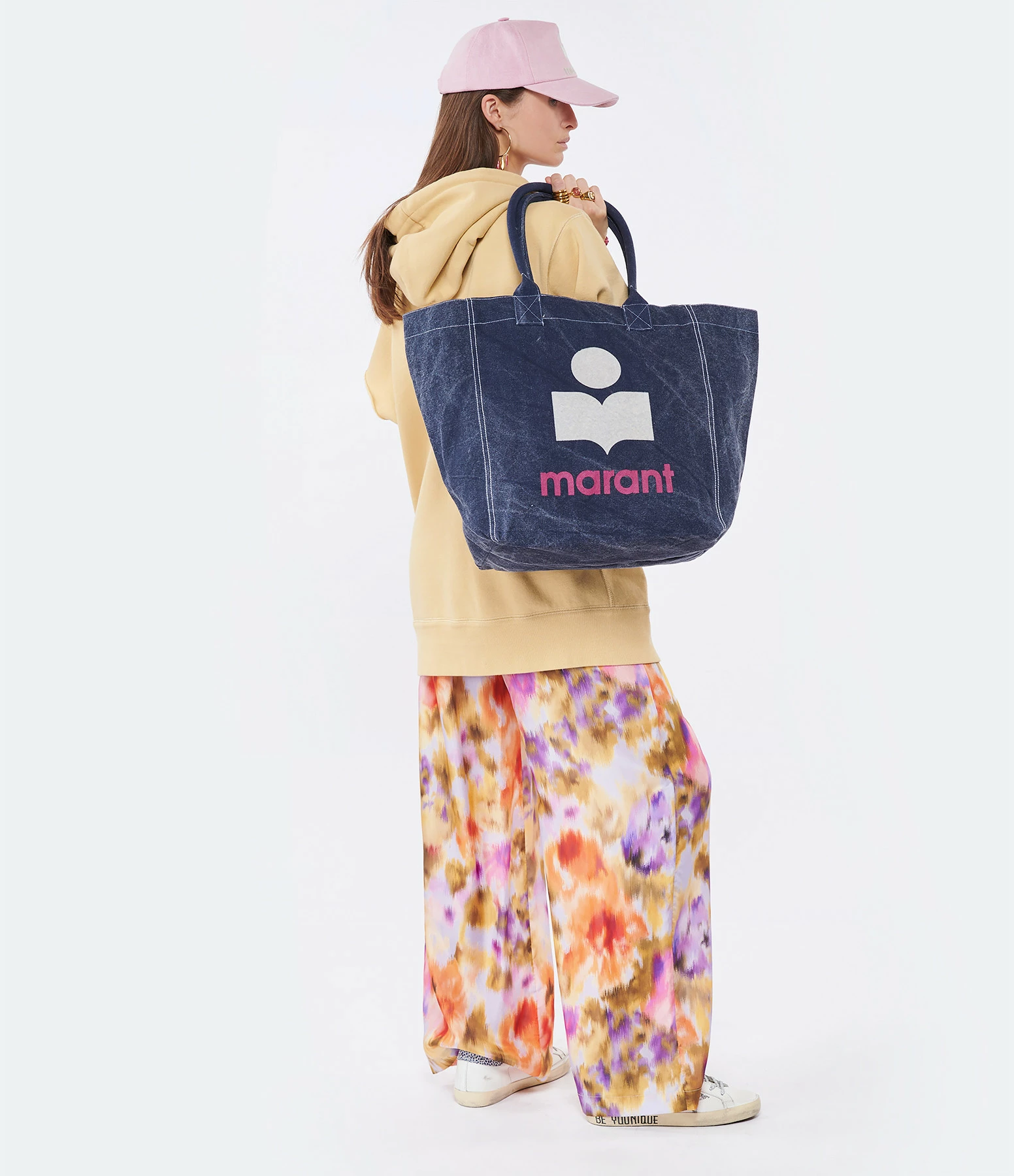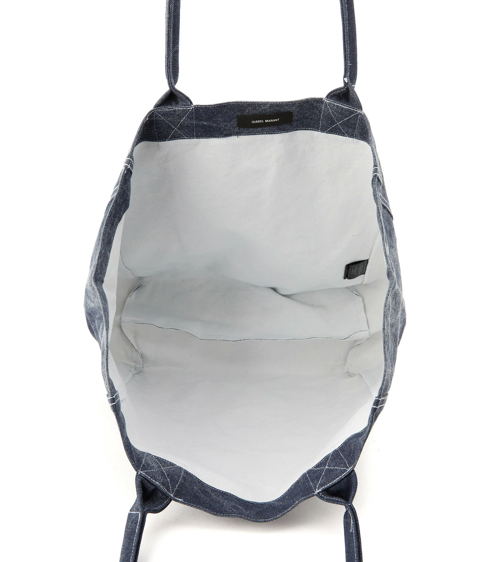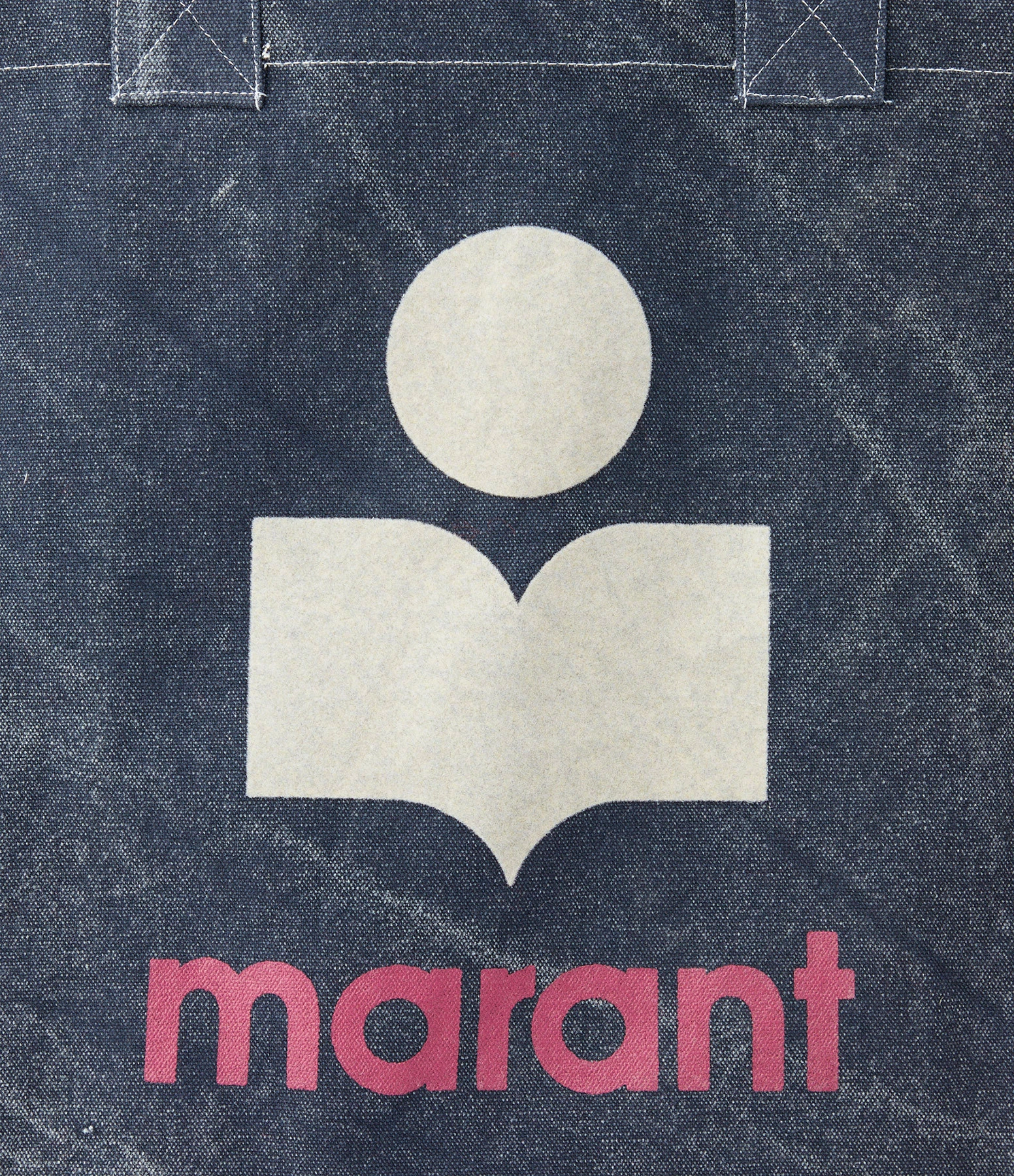 Cabas en coton denim bleu. Logo “Isabel Marant” en velours écru floqué sur l’avant et “marant” écrit en rose. Grandes anses.