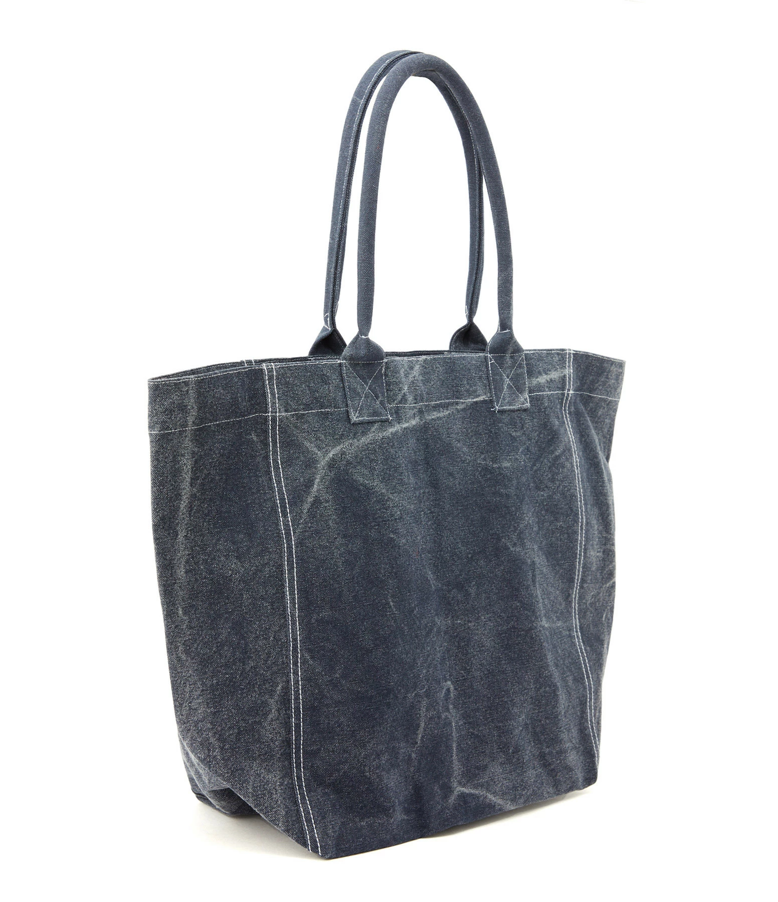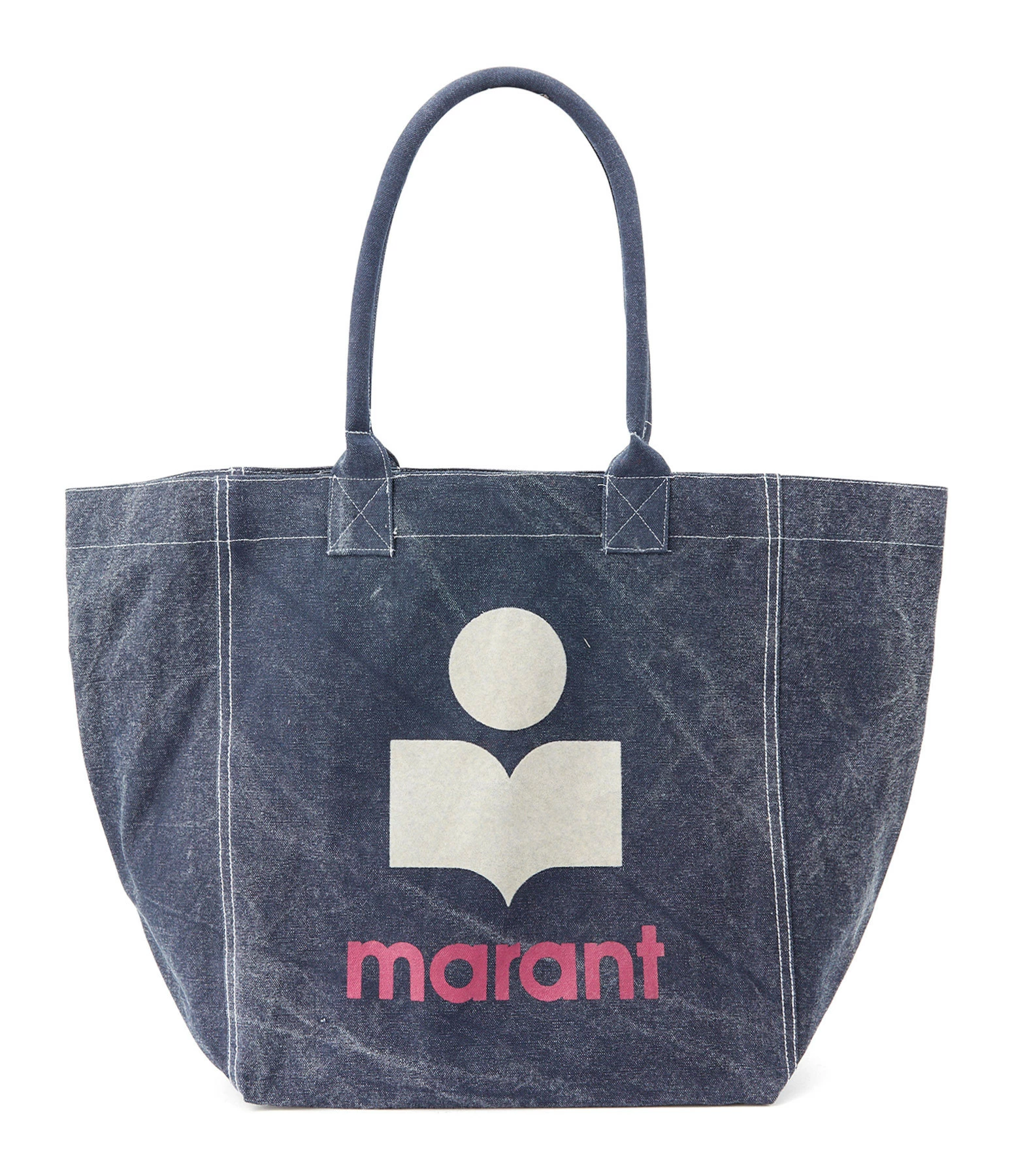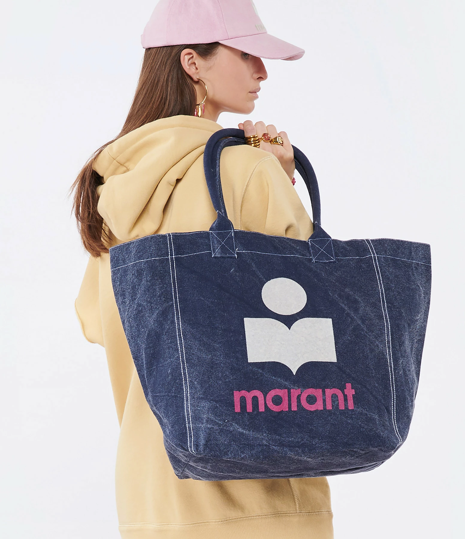Cabas en coton denim bleu. Logo “Isabel Marant” en velours écru floqué sur l’avant et “marant” écrit en rose. Grandes anses.