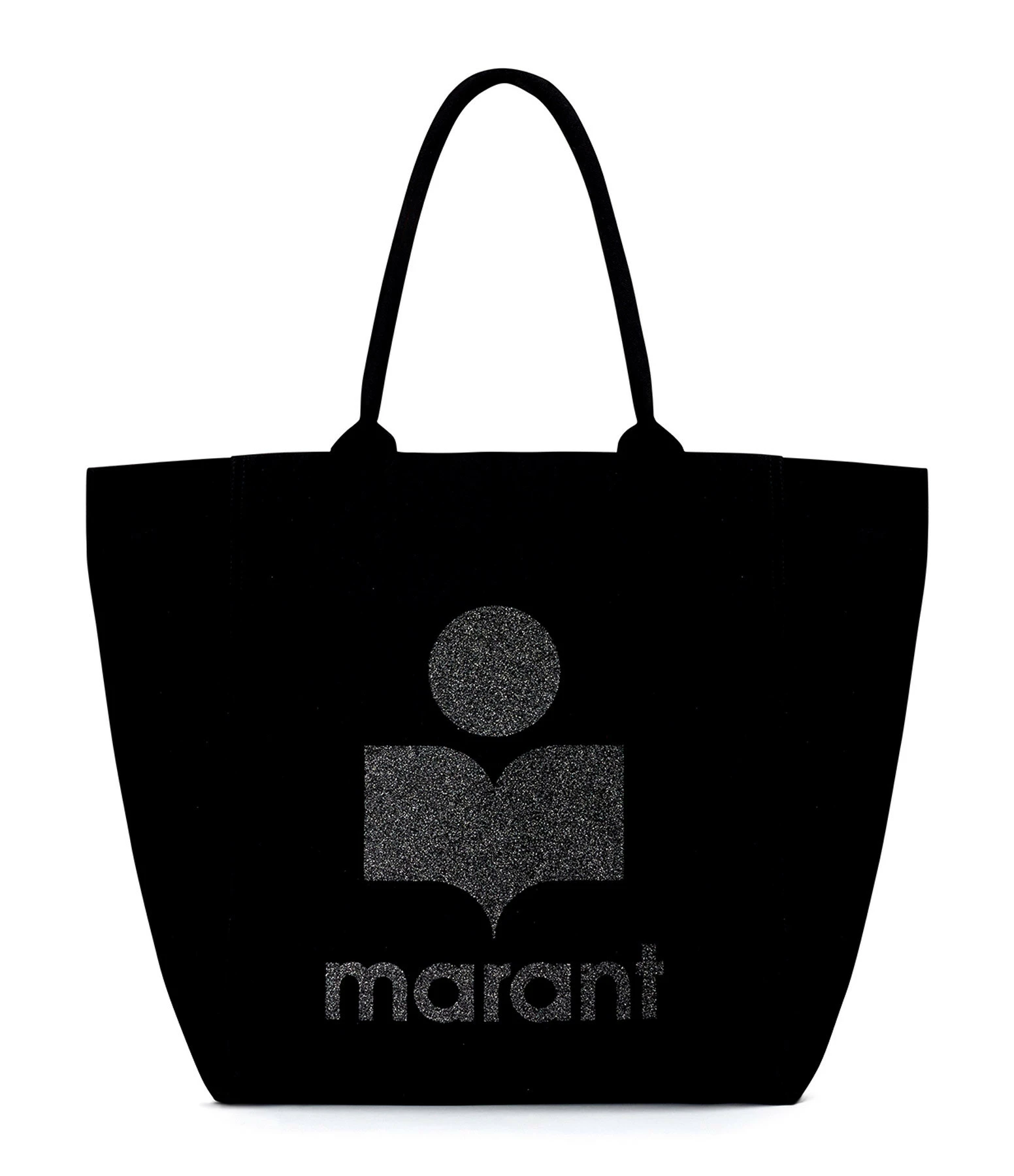 Sac cabas en toile de coton noir rĂ©haussĂ© du logo “Marant” flockĂ© sur le devant en paillettes noires. Deux anses pour portĂ© main ou Ă©paule.