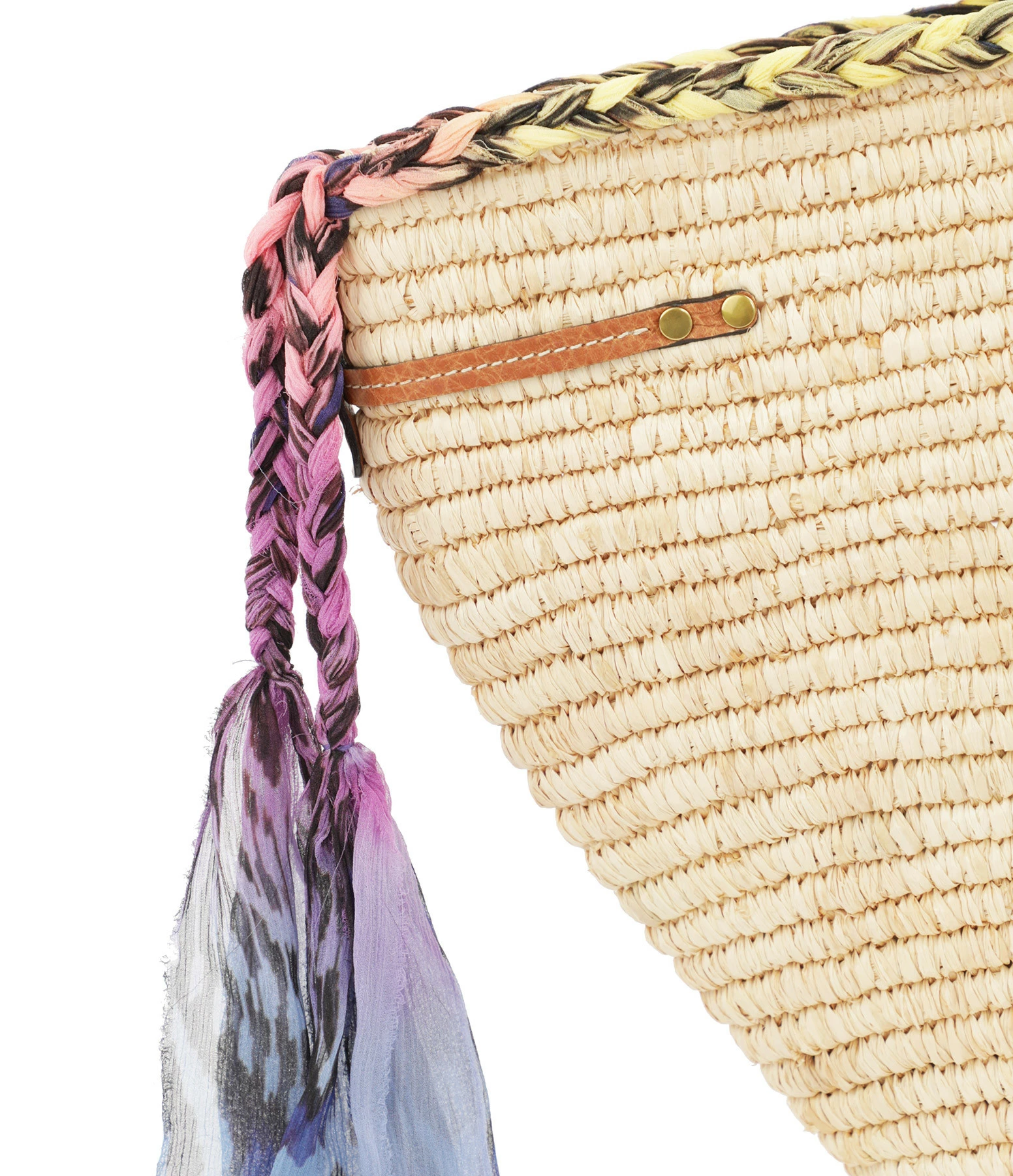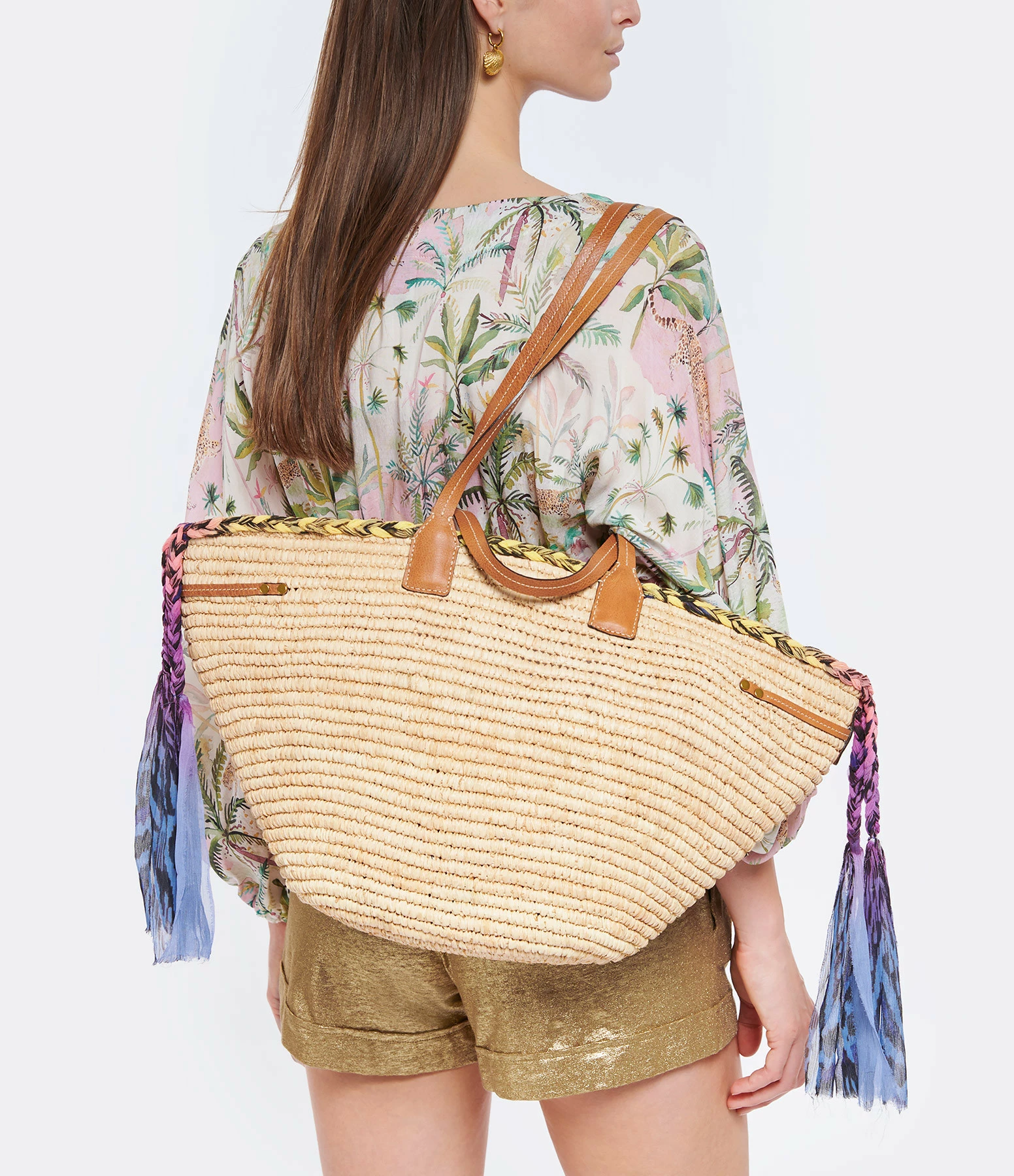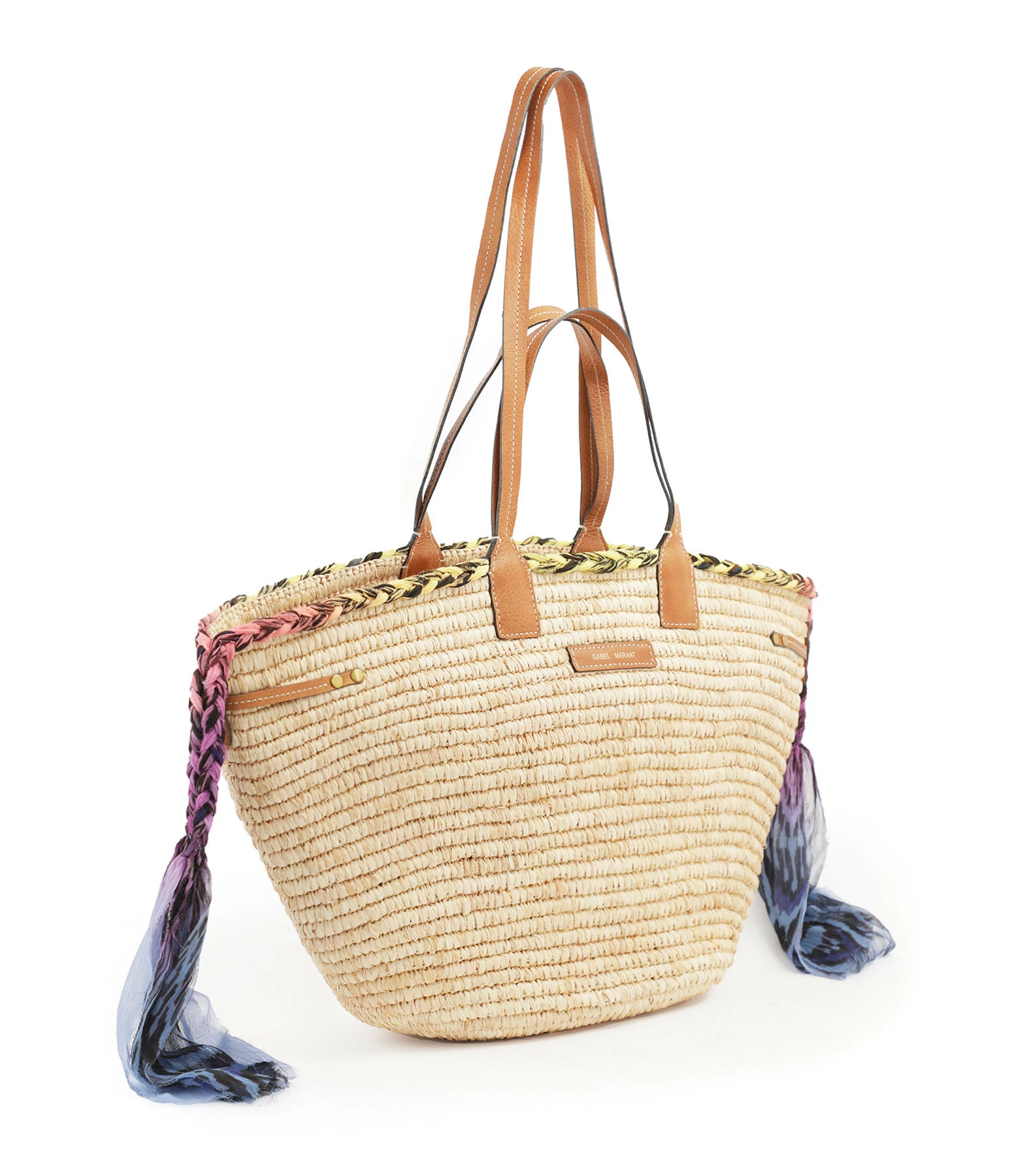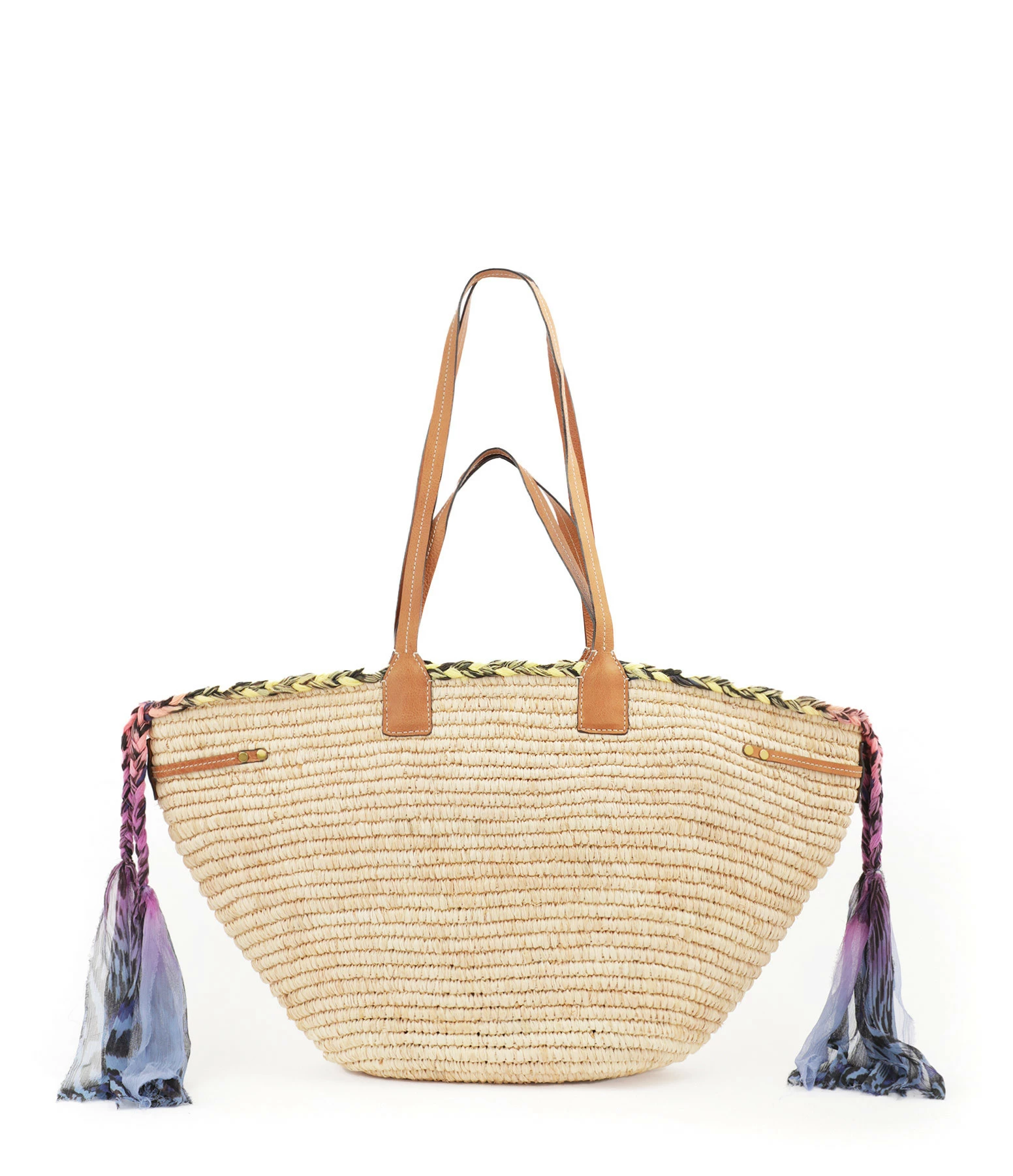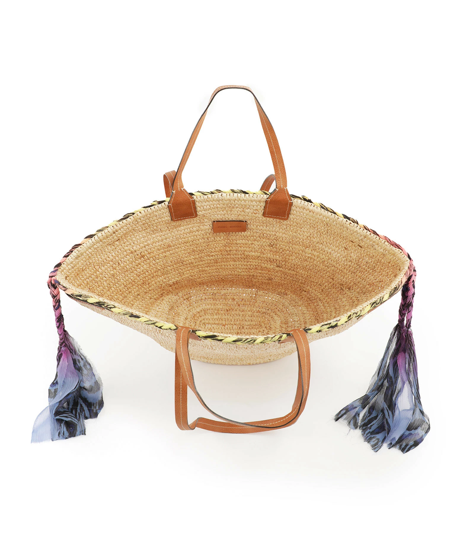 Panier en raphia naturel avec détails en cuir marron et bordures en tissu tressé multicolore et pompons sur les côtés. Deux petites anses et deux grandes anses en cuir marron. Etiquette en cuir gravée “Isabel Marant”. Un grand compartiment, non doublé.