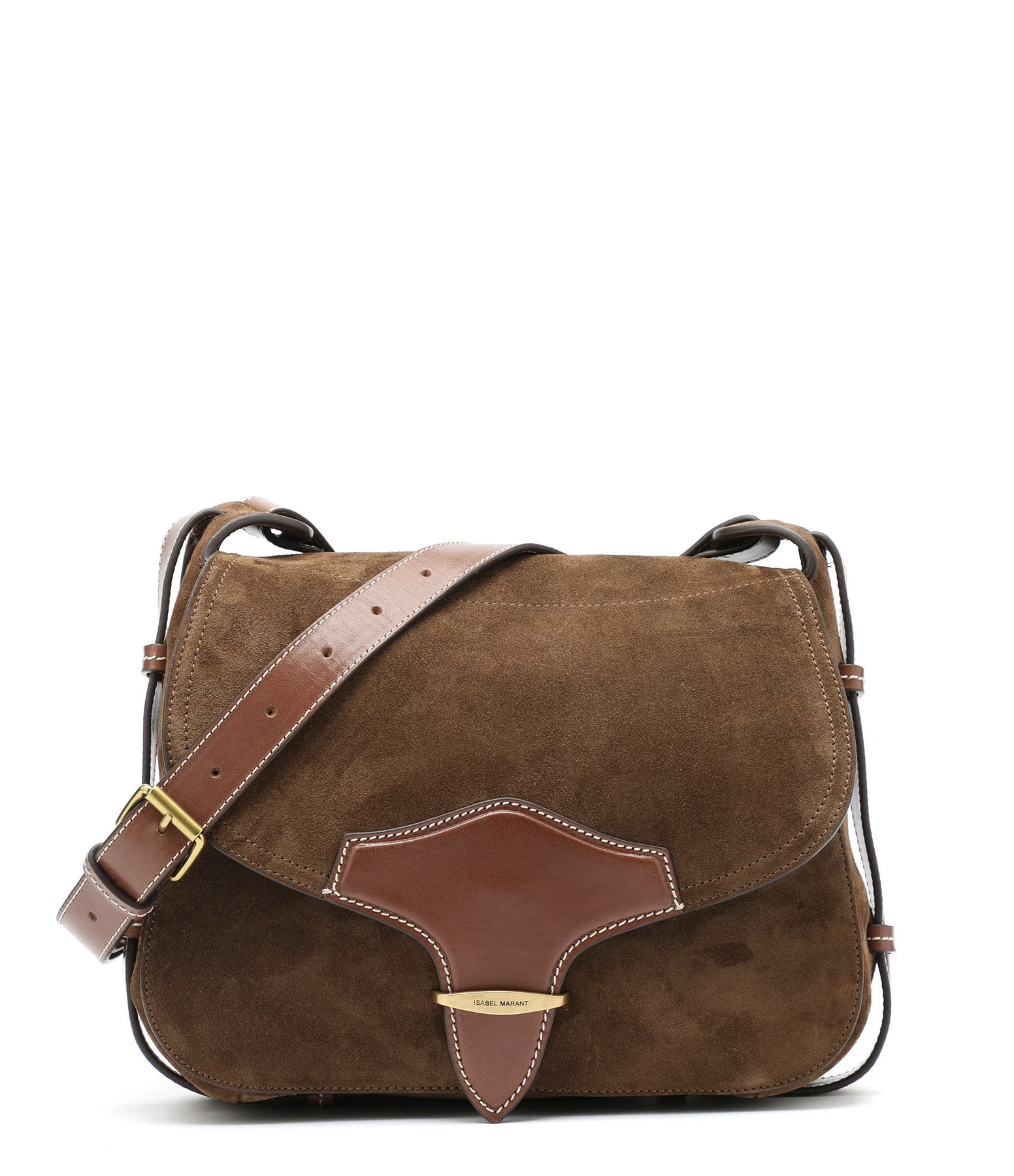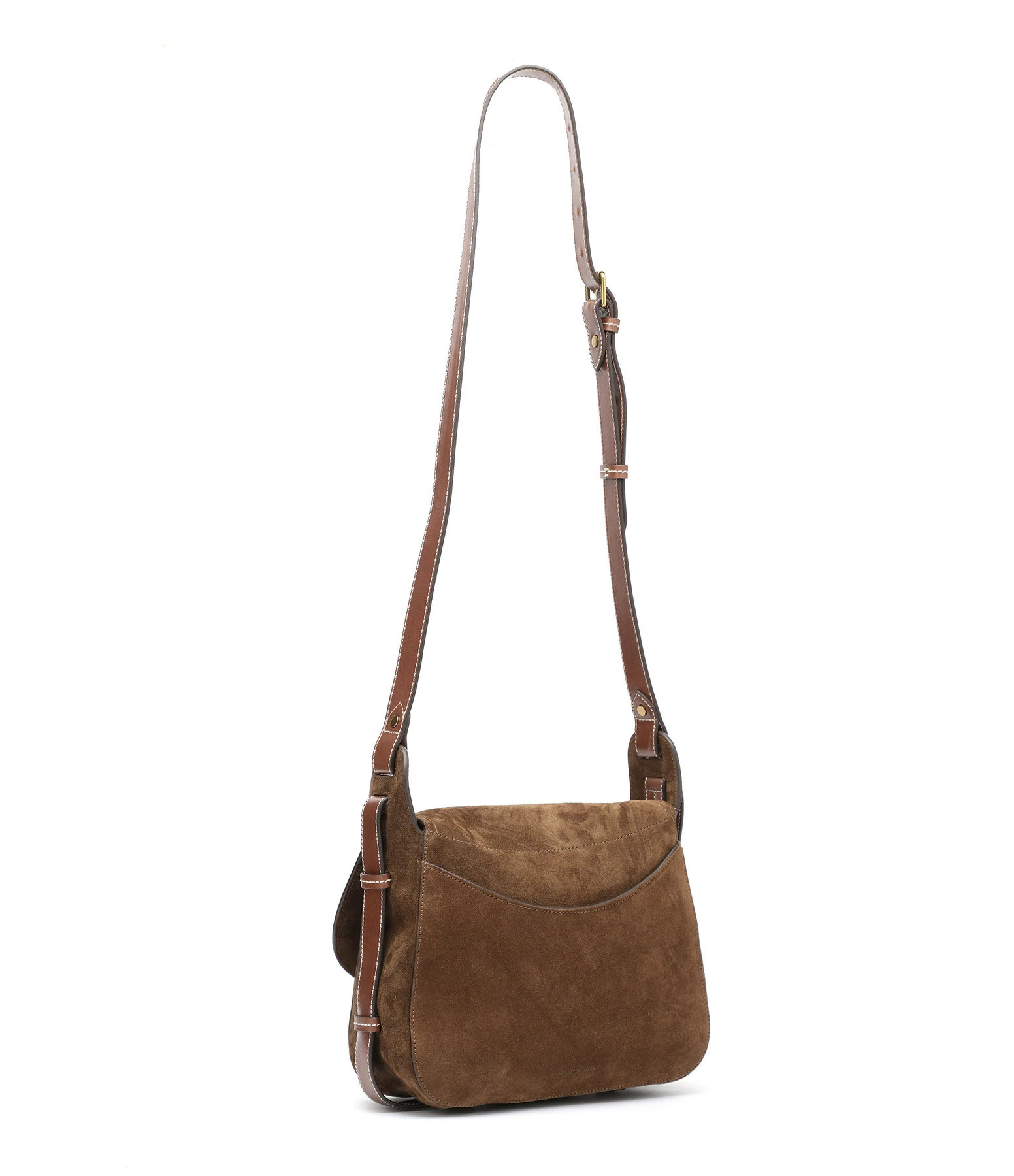 Sac bandoulière en cuir suédé marron. Fermeture par rabat aimantée. Empiècement en cuir lisse marron sur le rabat. Bandoulière en cuir lisse marron réglable. Une grande poche plaquée à l’arrière. Intérieur doublé en coton avec une poche plaquée.