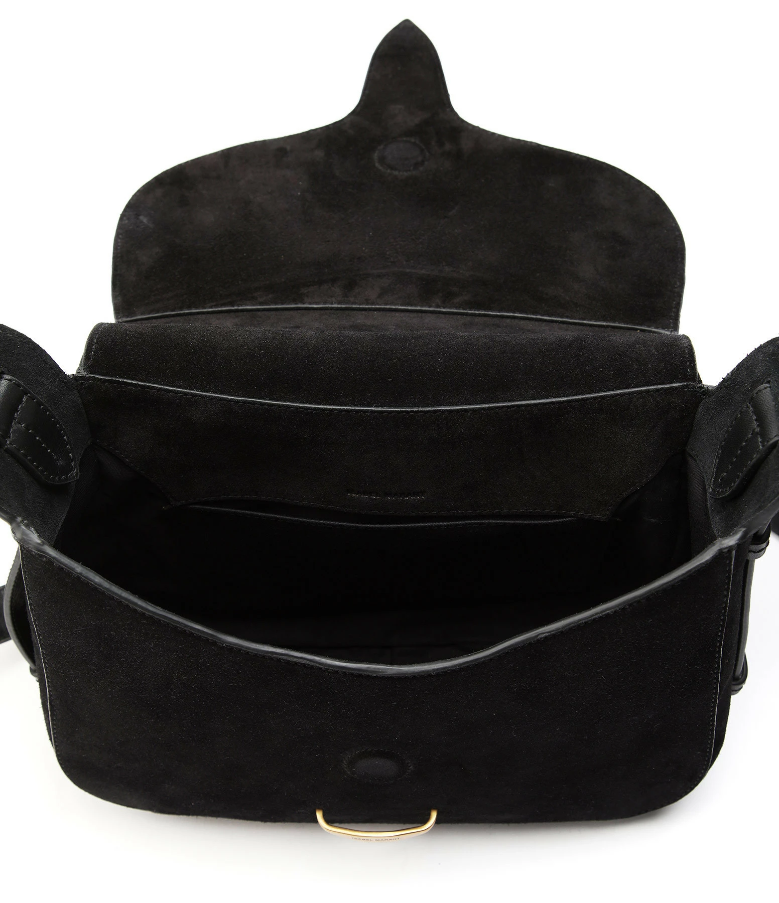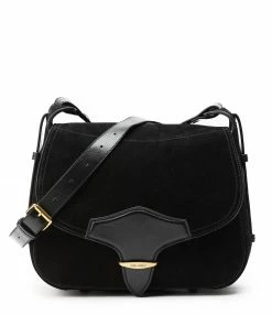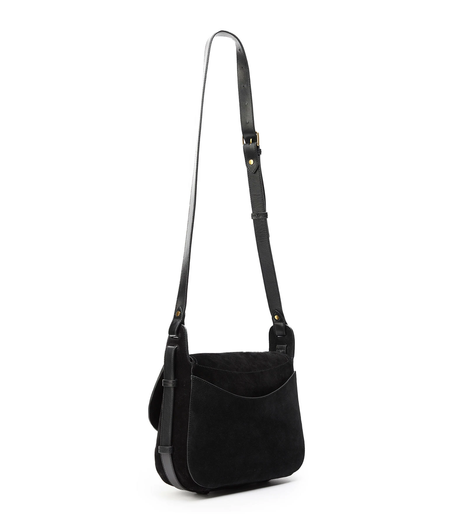Sac bandoulière en cuir suédé noir. Fermeture par rabat aimantée. Empiècement en cuir lisse noir sur le rabat. Bandoulière en cuir lisse noir réglable. Une grande poche plaquée à l’arrière. Intérieur doublé en coton noir avec une poche plaquée.
