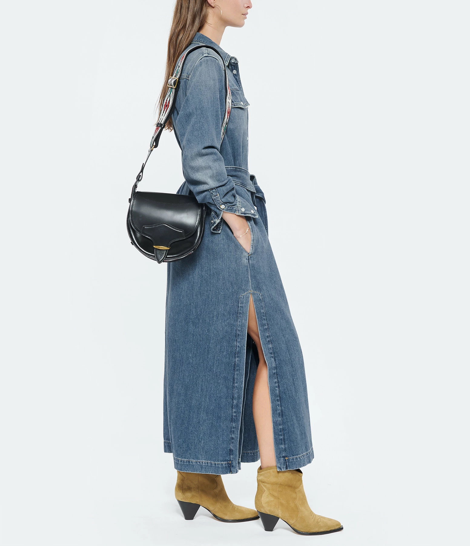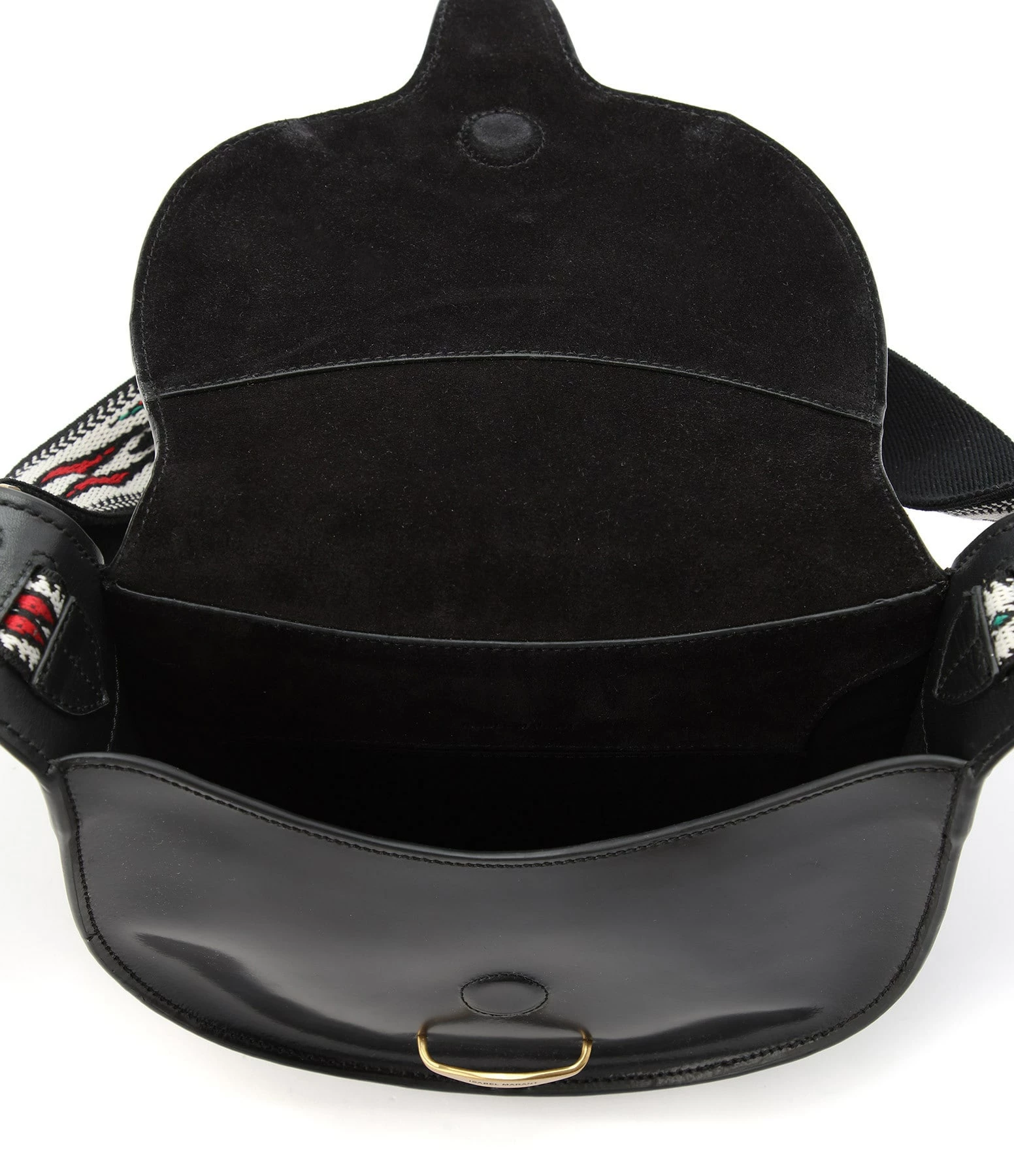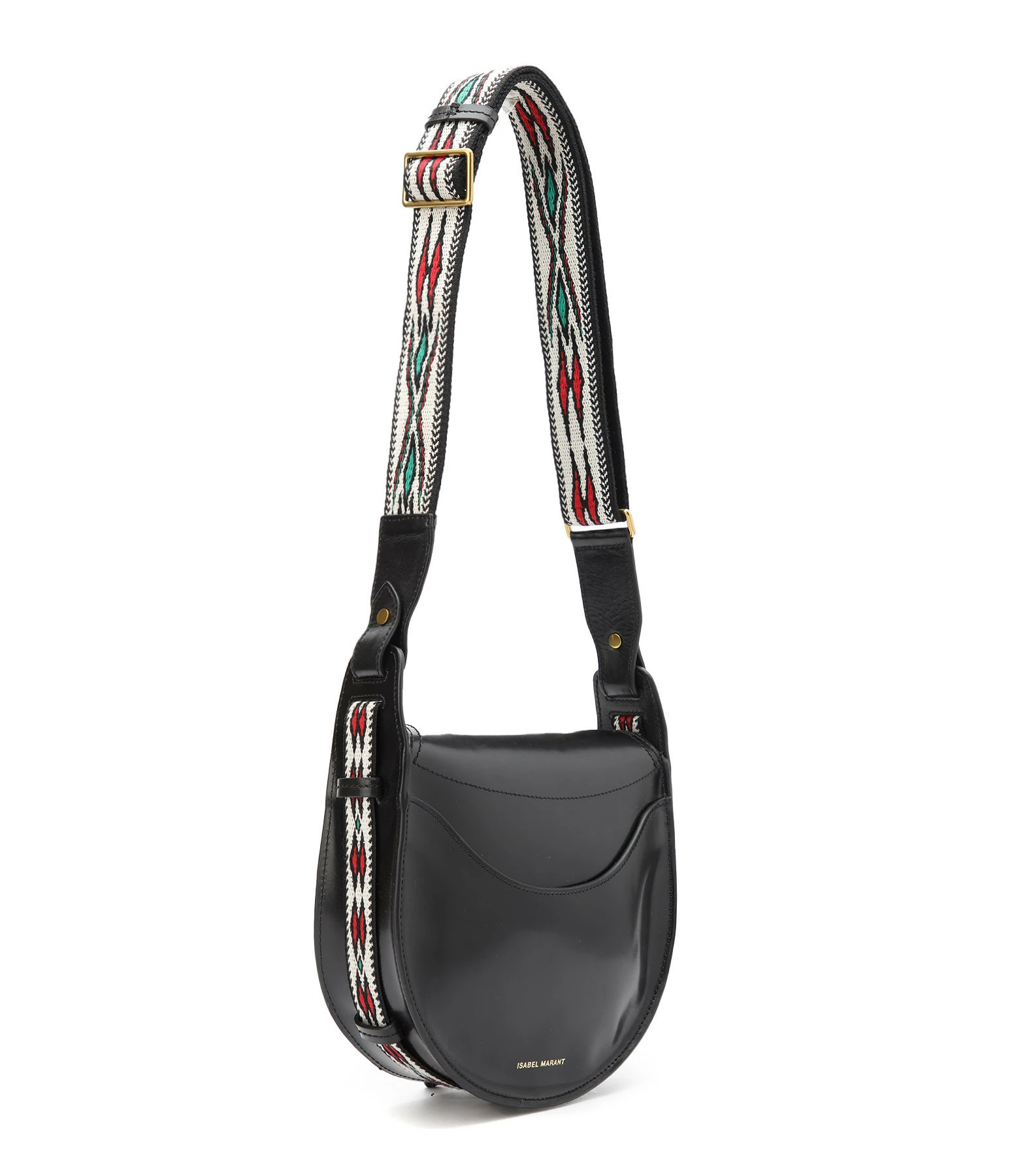 Sac bandoulière en cuir lisse noir avec bandoulière réglable tissées multicolore. Une poche plaquée à l’arrière. Fermeture par rabat aimantée.