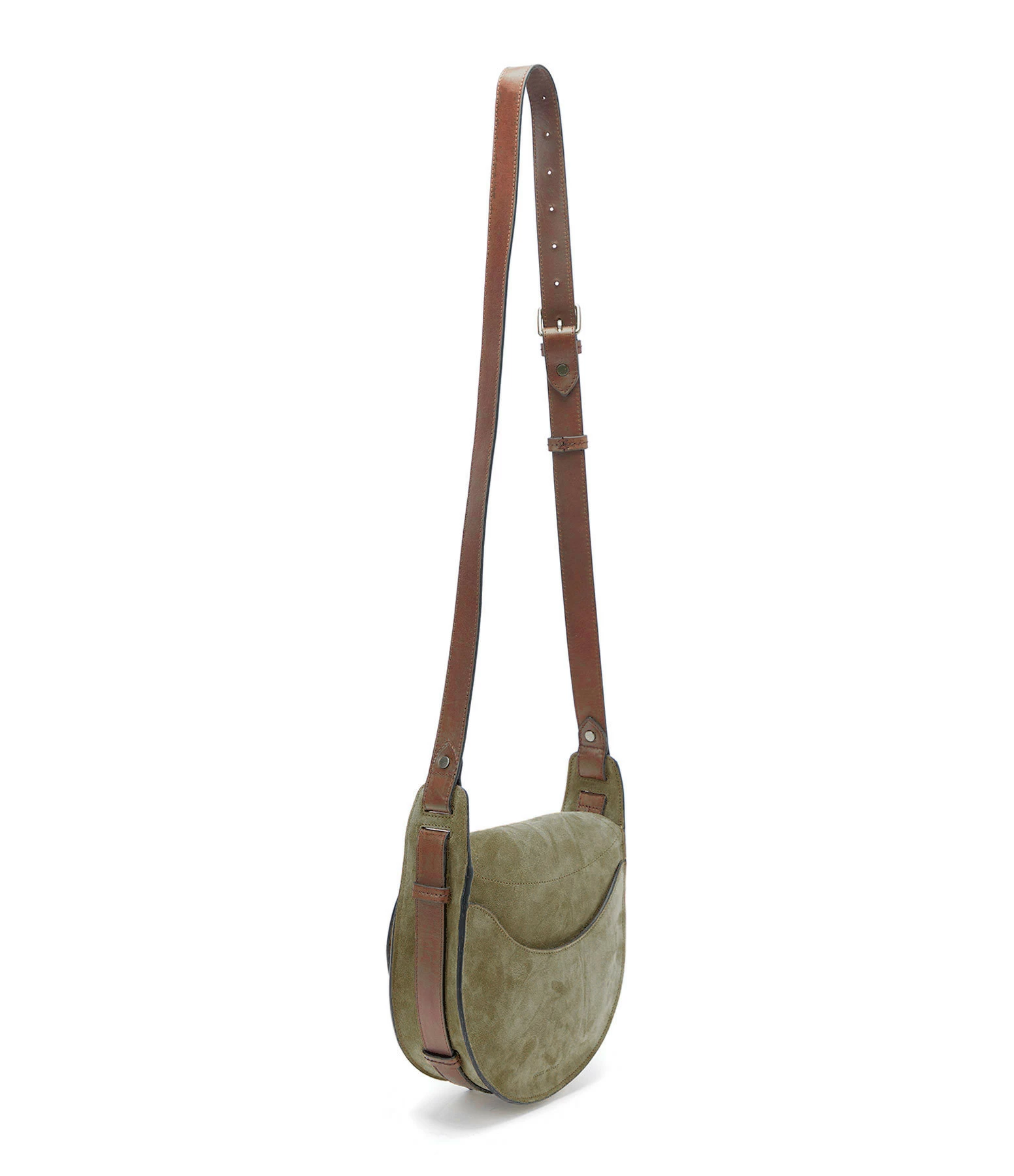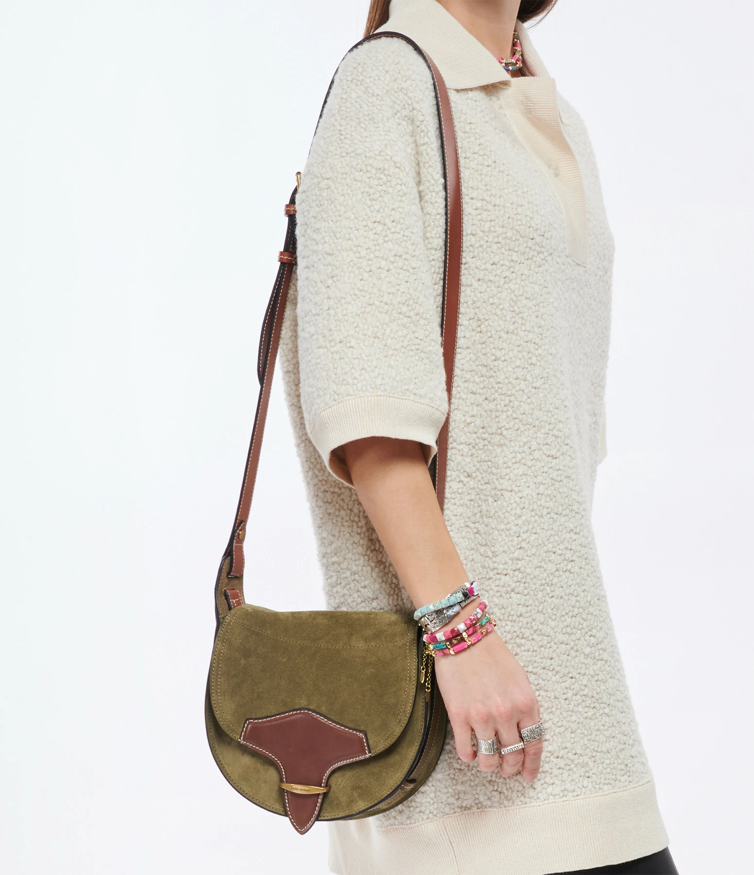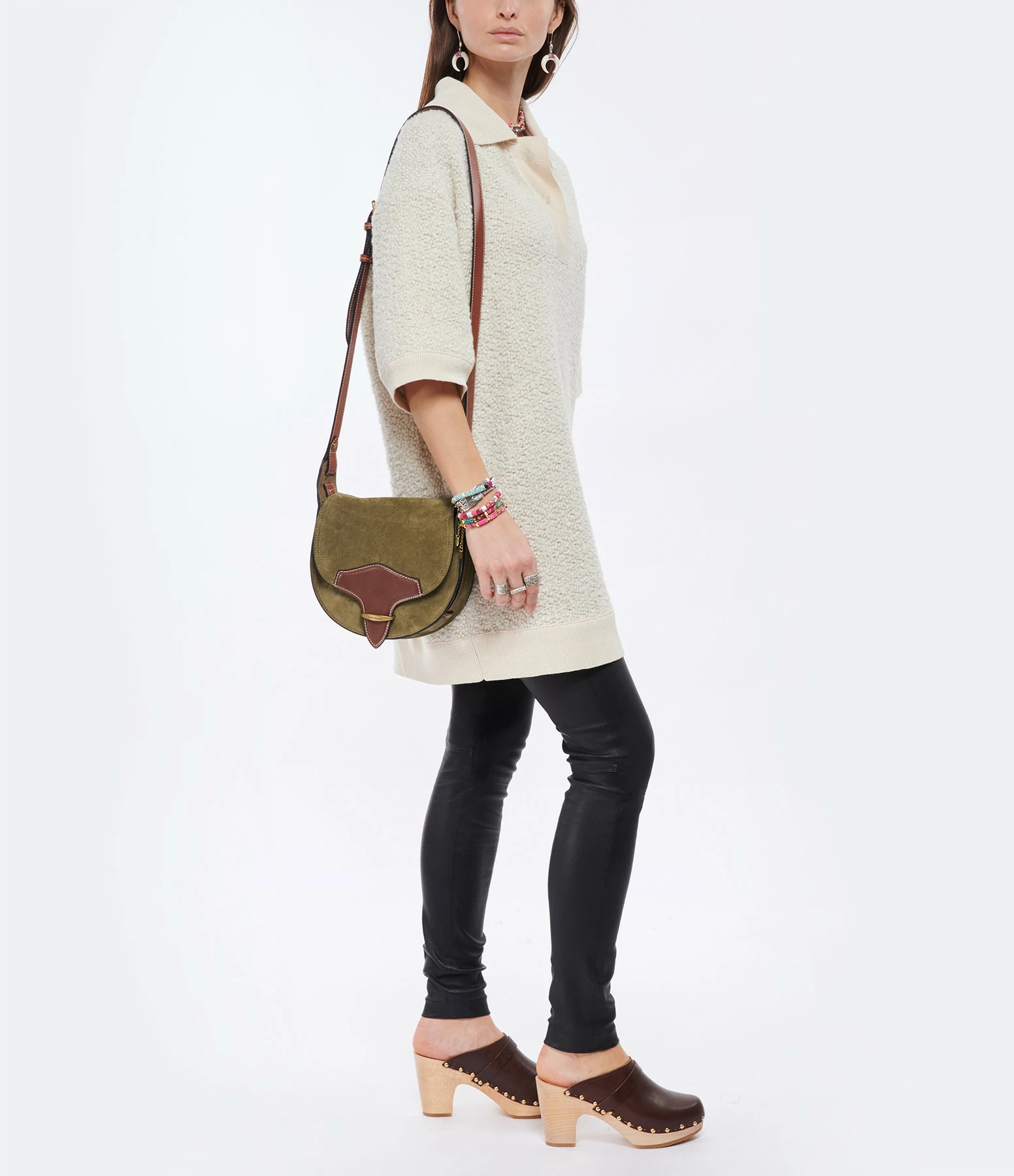 Sac bandoulière en cuir suédé kaki, empiècements en cuir lisse avec fermoir. Bandoulière réglable. Une poche plaquée à l’arrière. Intérieur doublé avec une poche plaquée. Fermeture par rabat aimantée.