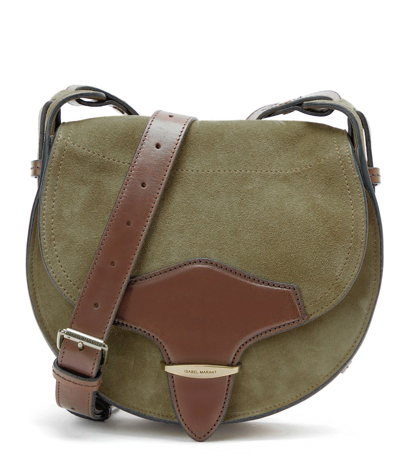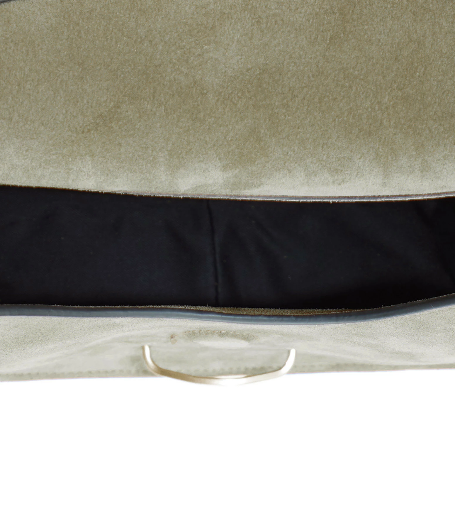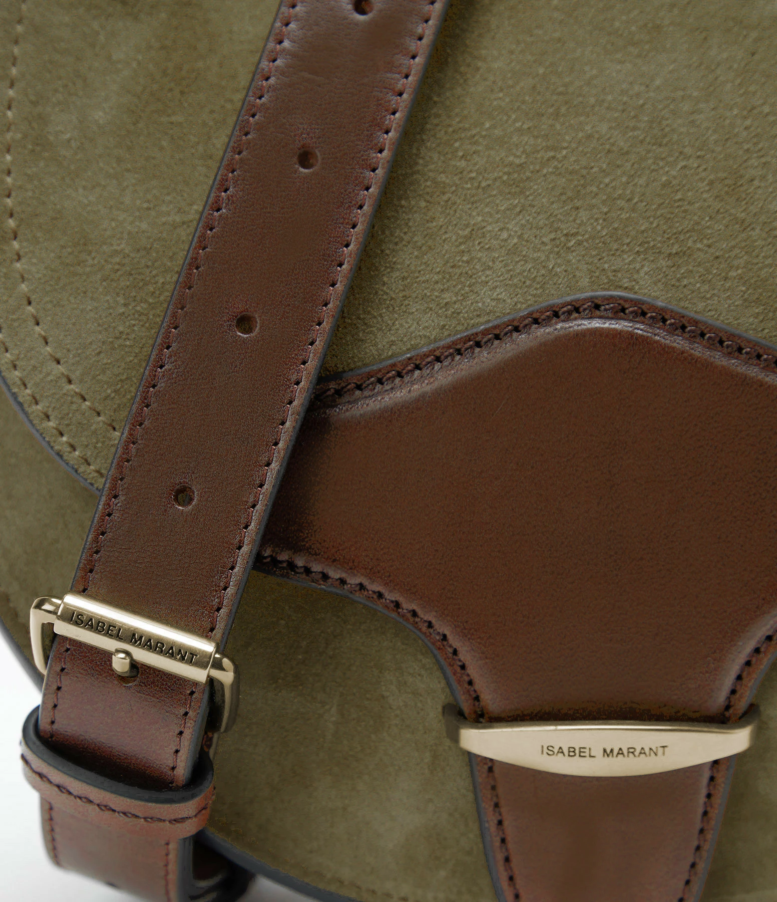 Sac bandoulière en cuir suédé kaki, empiècements en cuir lisse avec fermoir. Bandoulière réglable. Une poche plaquée à l’arrière. Intérieur doublé avec une poche plaquée. Fermeture par rabat aimantée.