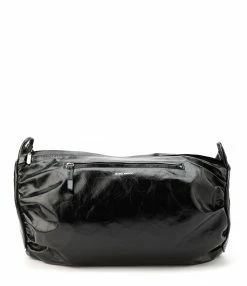 Sac bowling grand format en cuir noir vernis. Porté épaule. Fermeture zippée argentée avec inscription “ISABEL MARANT” gravée sur le curseur. Une poche extérieure zippée. Inscription “ISABEL MARANT” sérigraphiée en argenté sous la poche extérieure. Bandoulière en cuir ajustable. Intérieur doublé. Deux poches intérieures : une poche plaquée et une poche zippée avec inscription “ISABEL MARANT” sérigraphiée dessous.