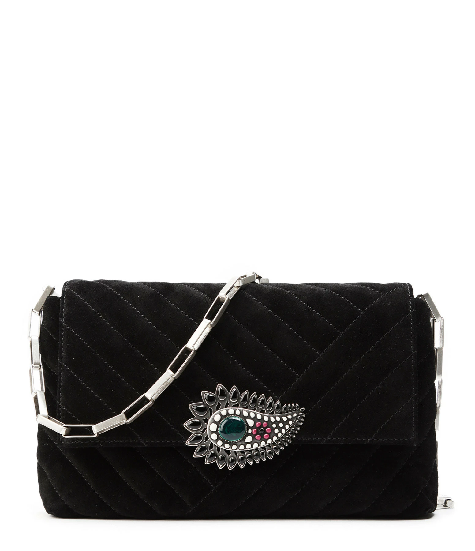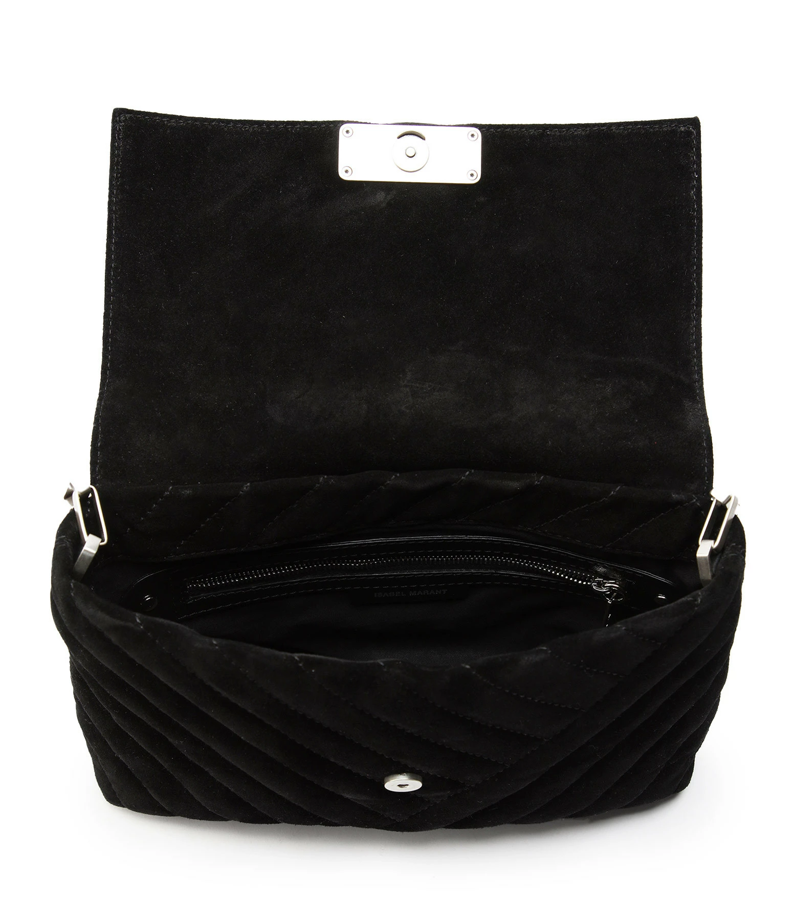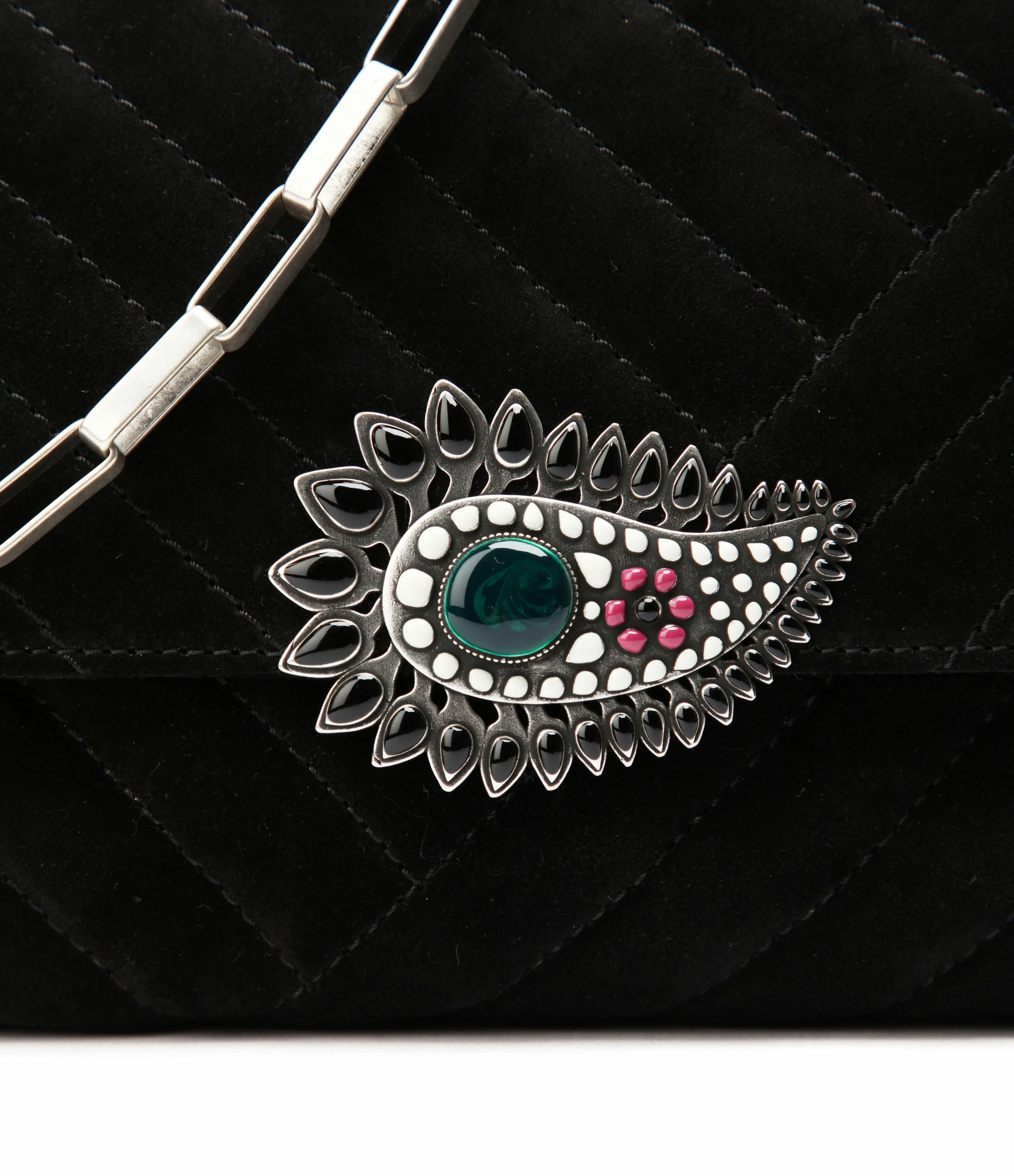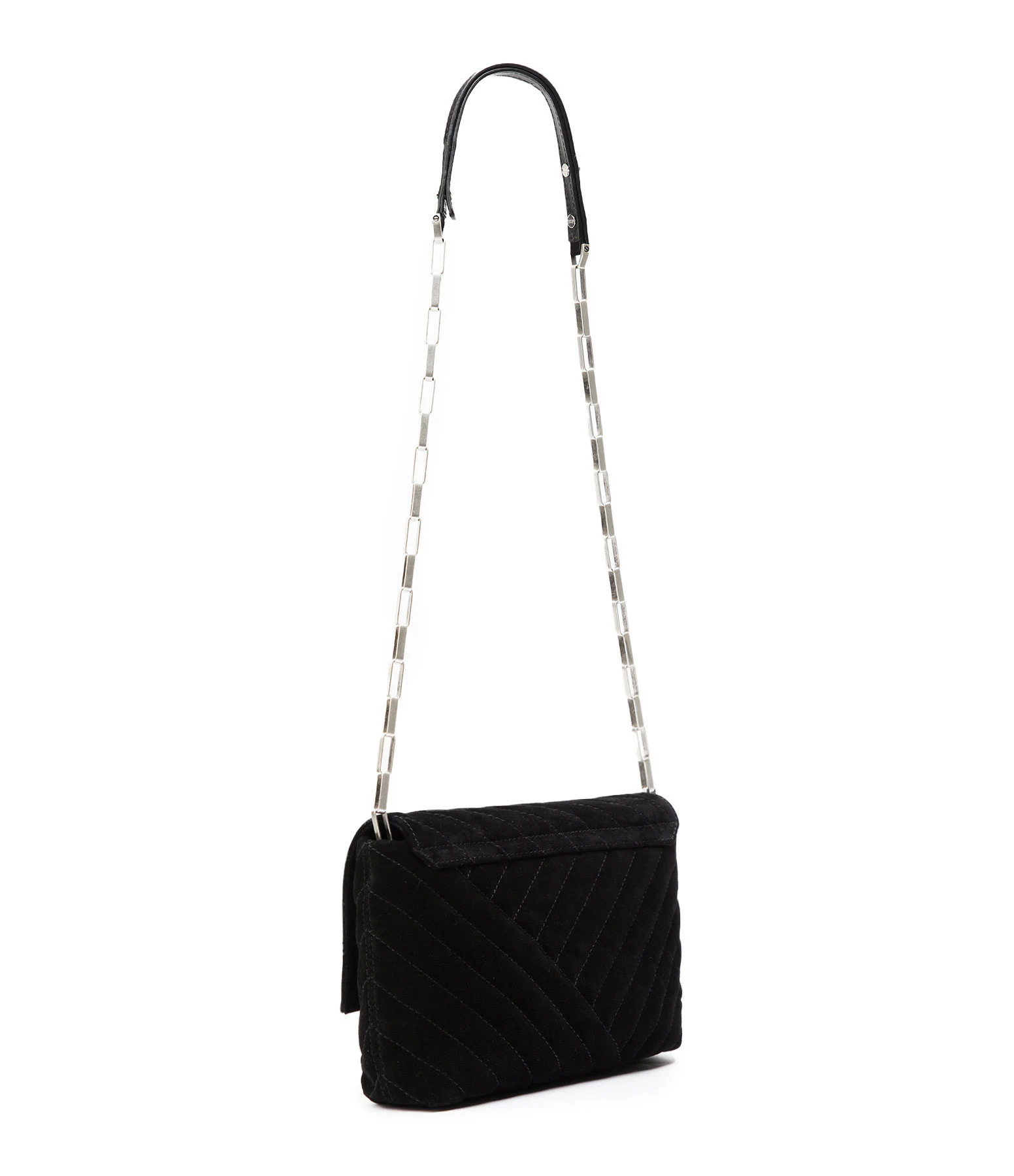 Sac bandoulière matelassé en cuir suédé noir. Fermeture à rabat aimanté avec boucle ornée de pierres. Bandoulière en chaine métallique argentée et renfort épaule en cuir suédé noir. Intérieur doublé coton en noir avec une poche plaquée et une poche zippée.