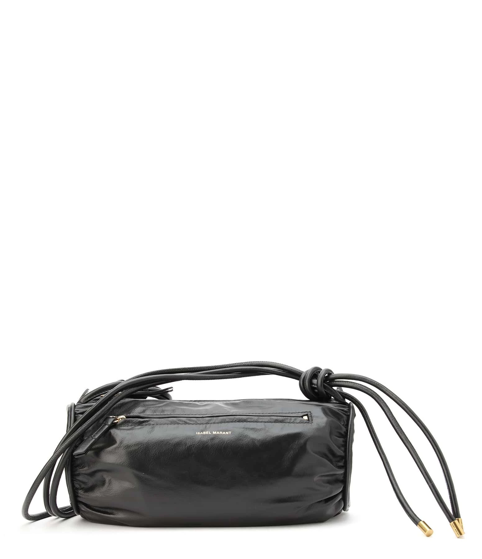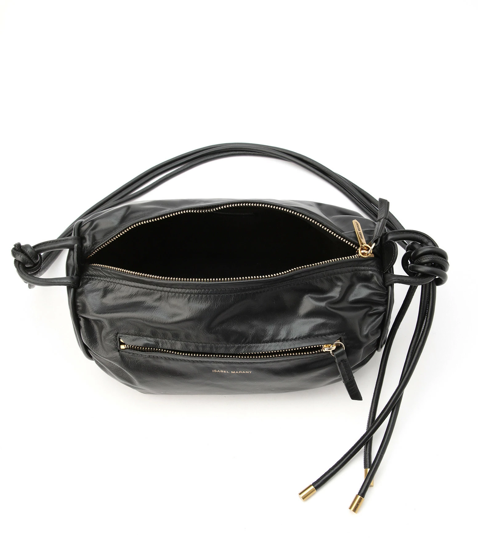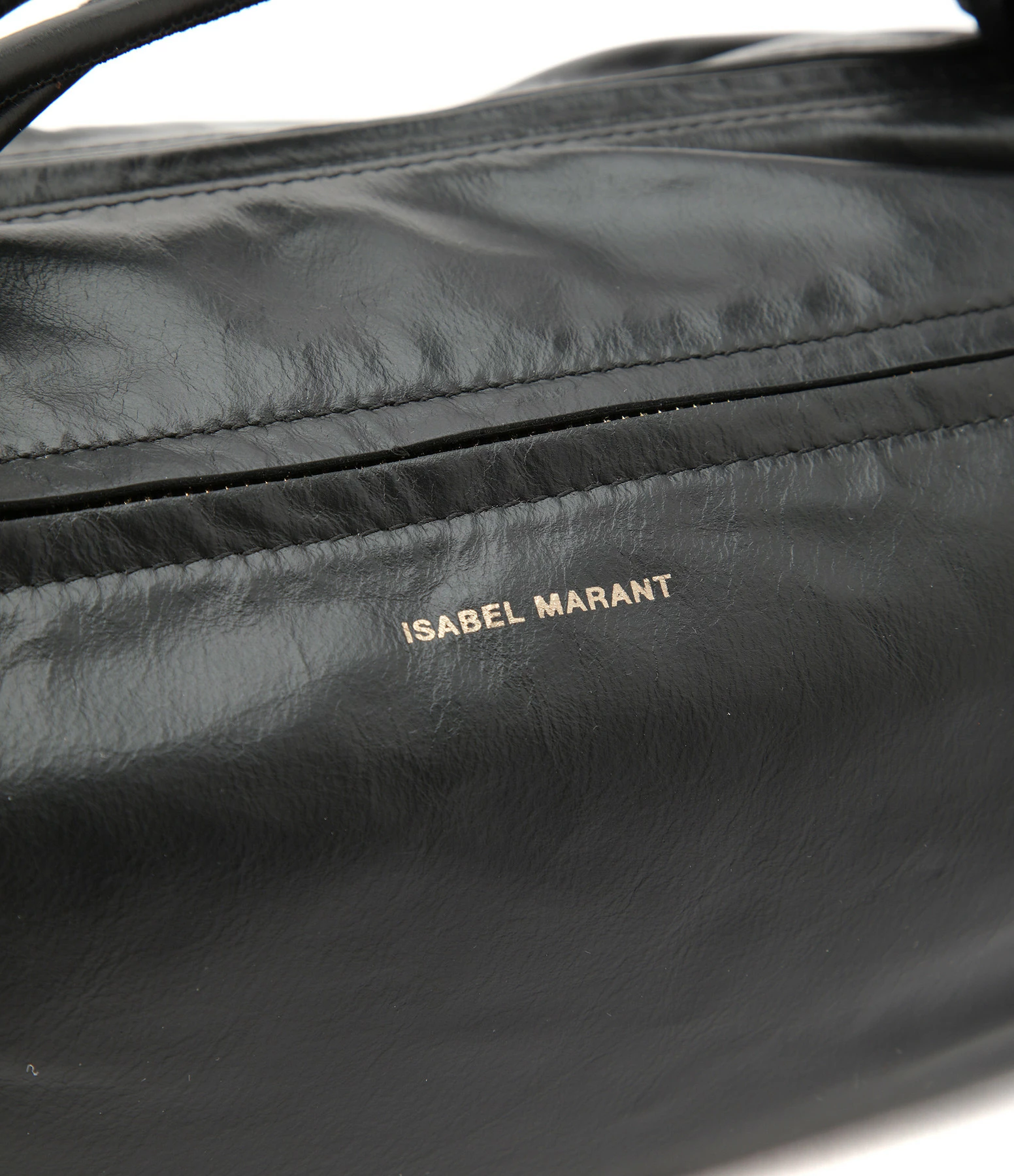 Sac bowling en cuir noir. Porté épaule. Fermeture zippée dorée. Une poche extérieure zippée. Inscription “ISABEL MARANT” sérigraphiée en doré sous la poche extérieure. Bandoulière en cuir nouée autour de deux petites anses avec embout métallique doré. Intérieur doublé.