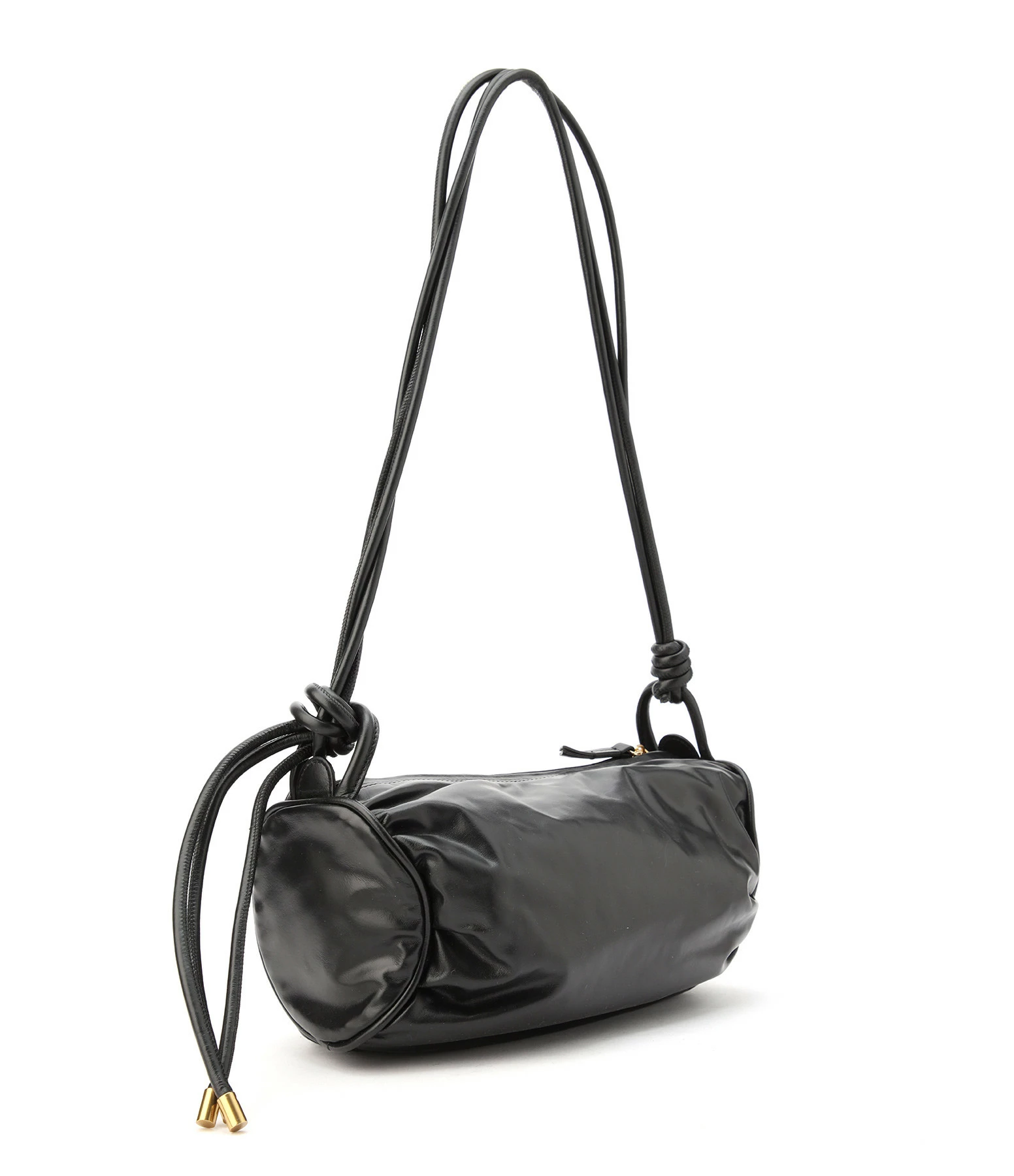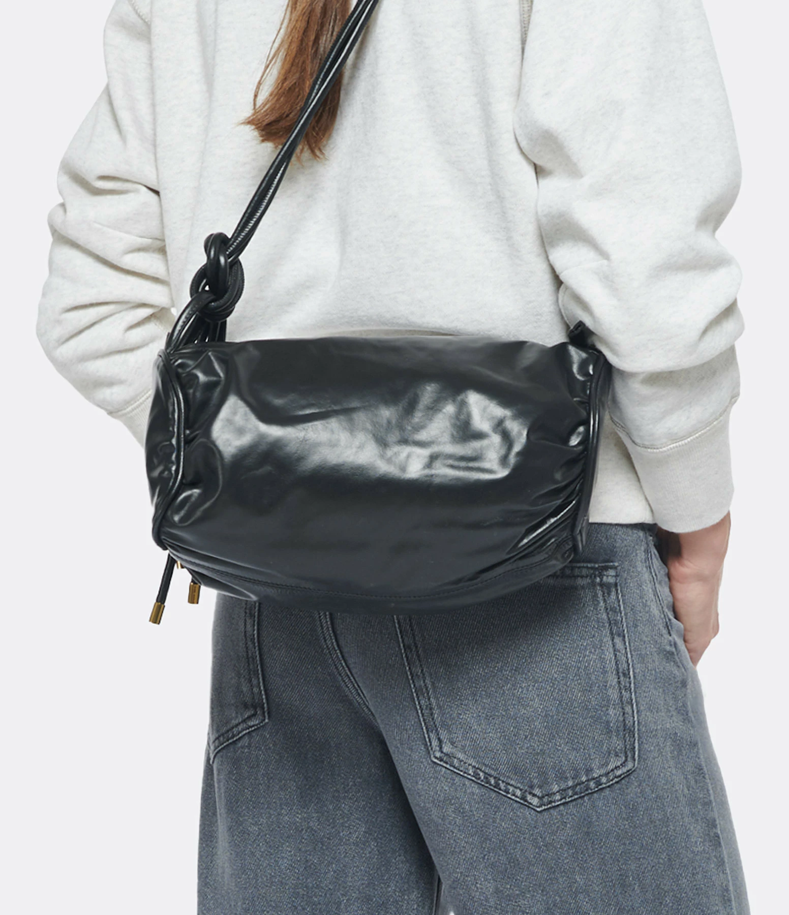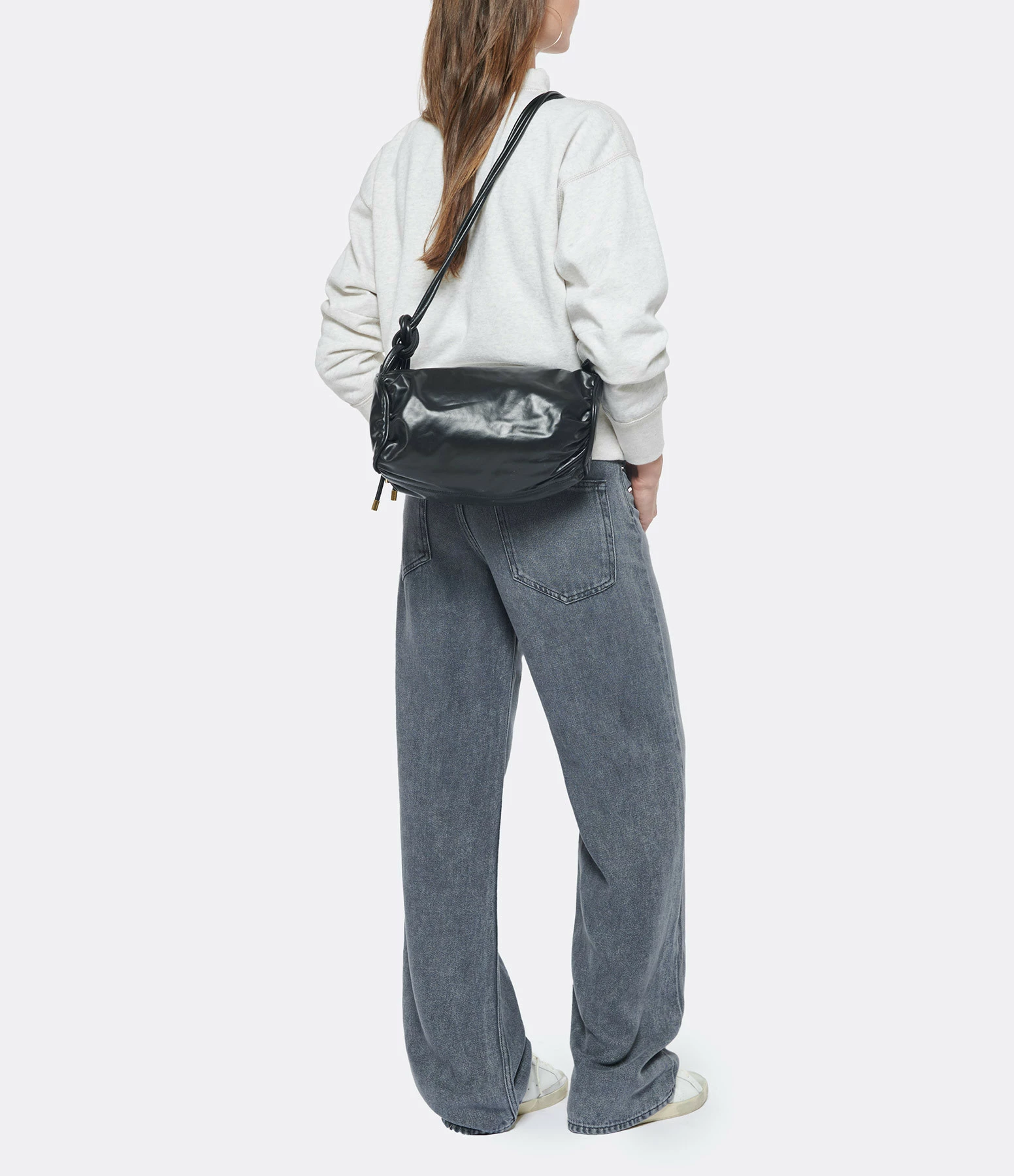 Sac bowling en cuir noir. Porté épaule. Fermeture zippée dorée. Une poche extérieure zippée. Inscription “ISABEL MARANT” sérigraphiée en doré sous la poche extérieure. Bandoulière en cuir nouée autour de deux petites anses avec embout métallique doré. Intérieur doublé.