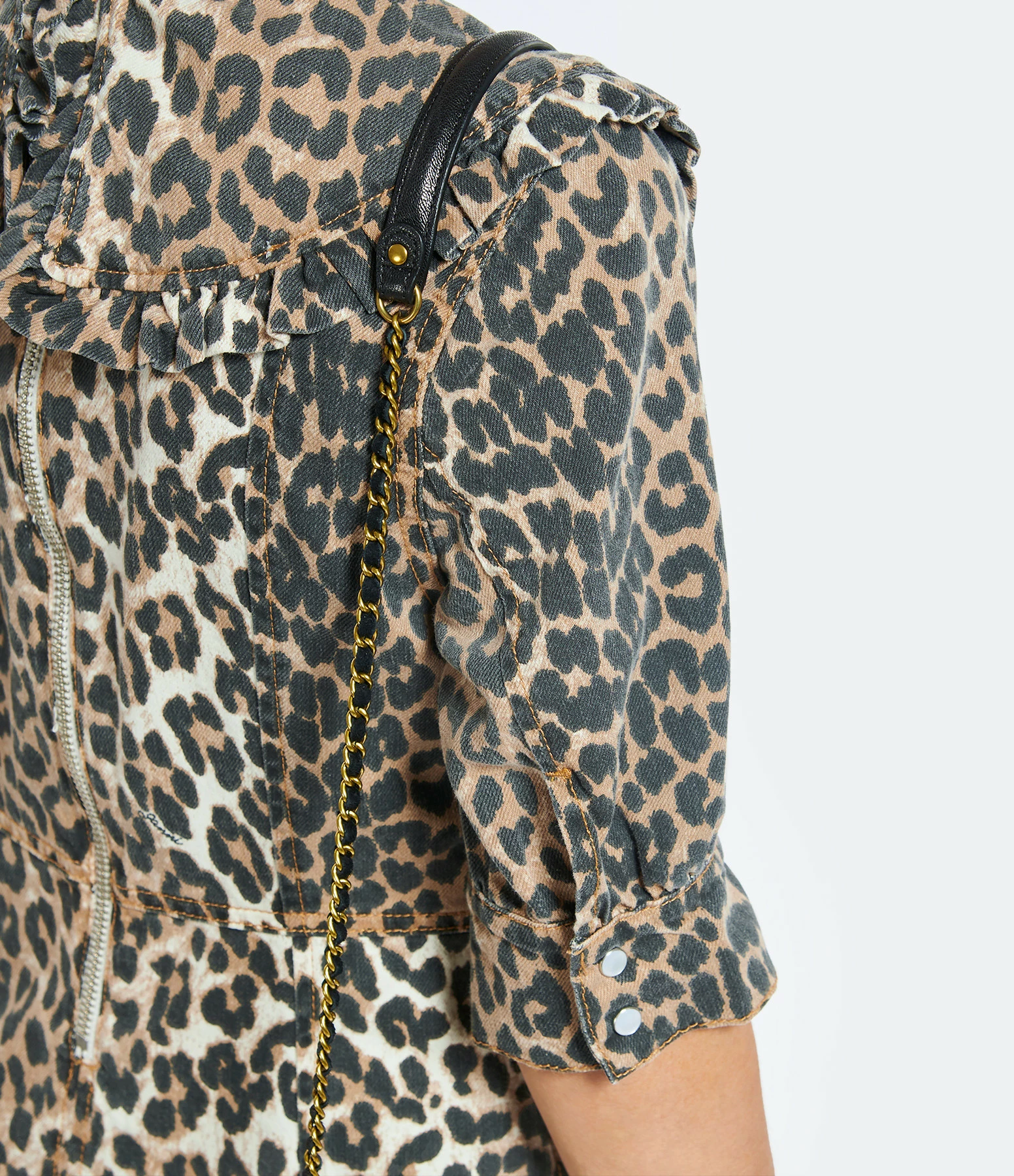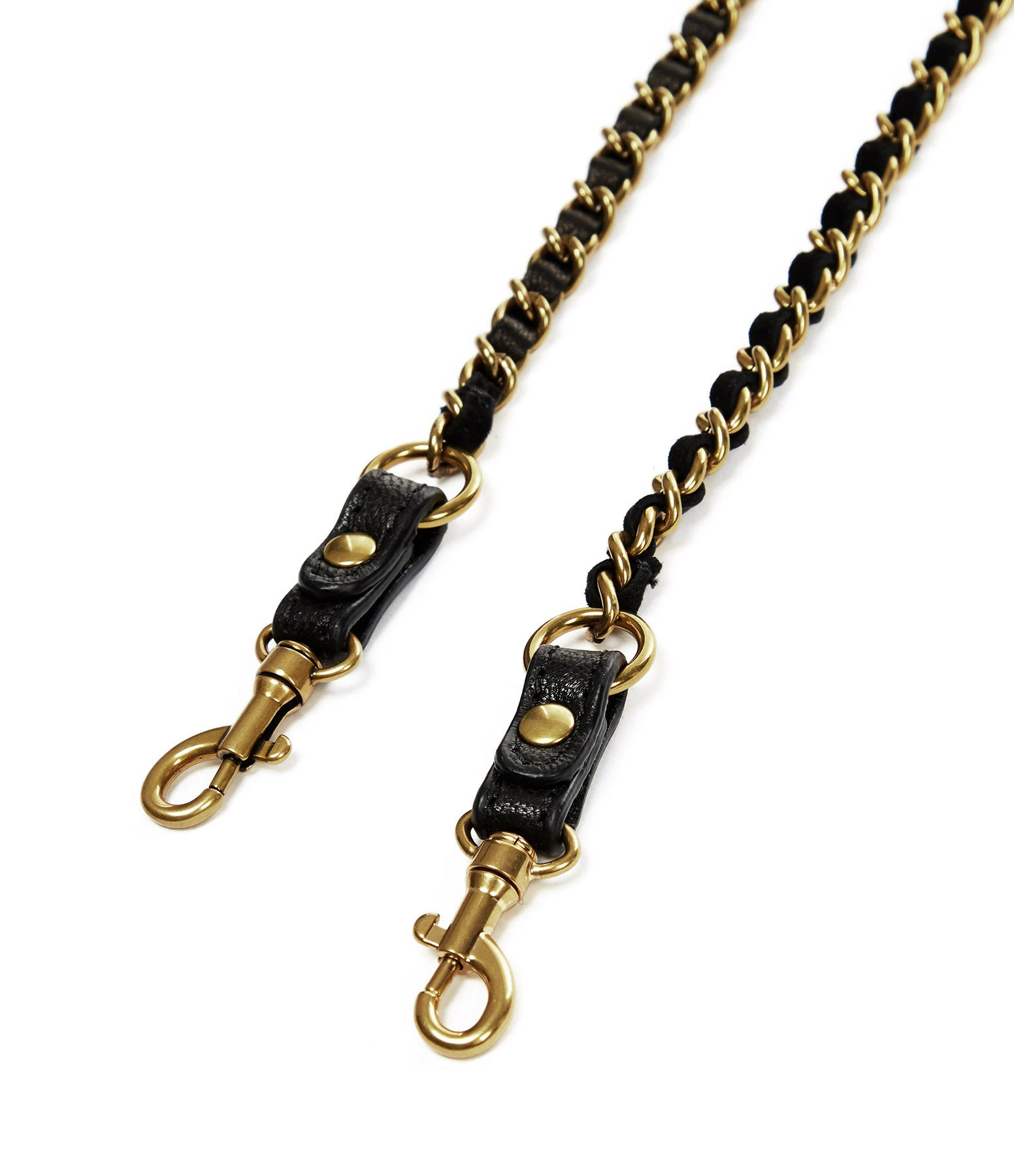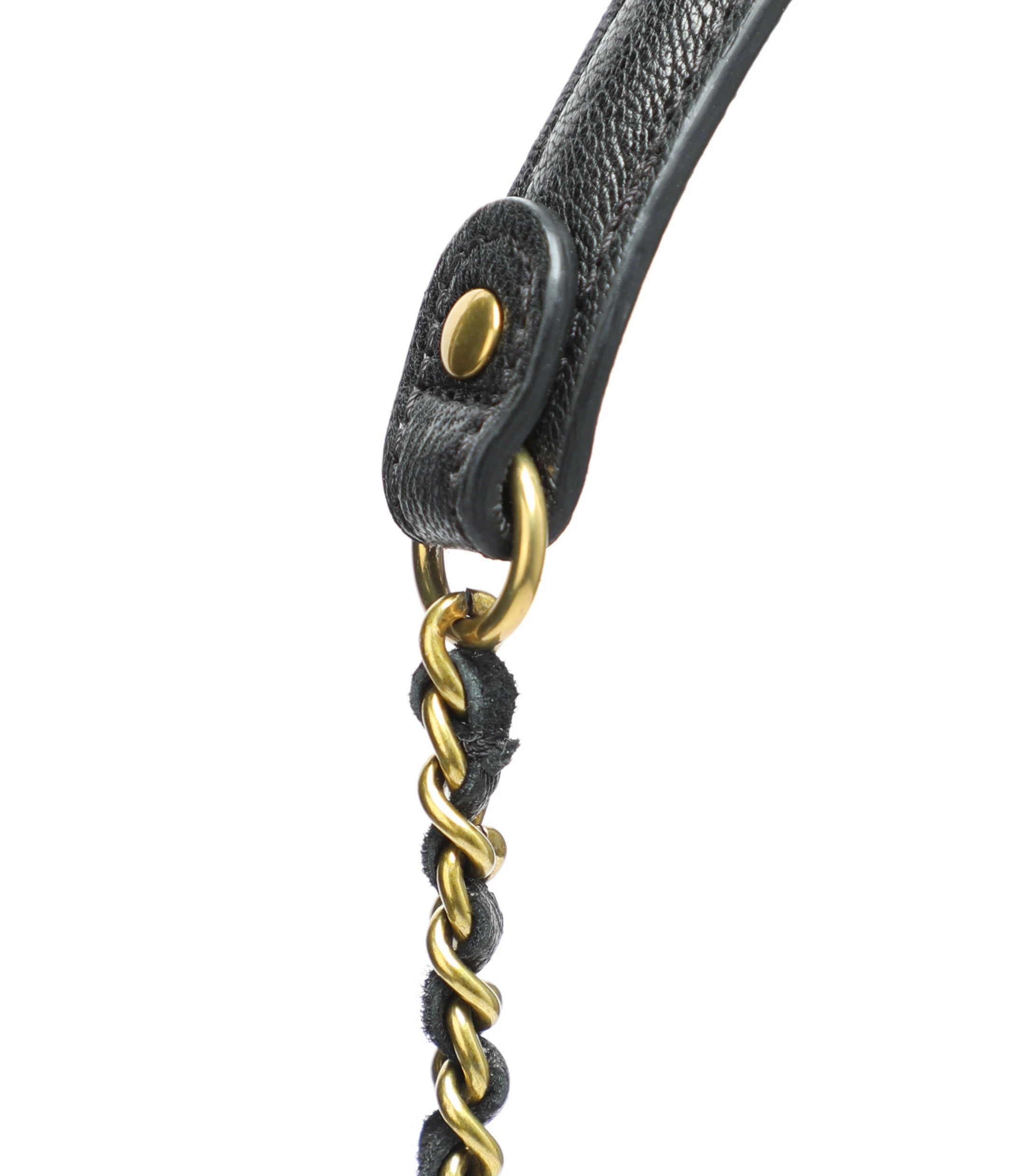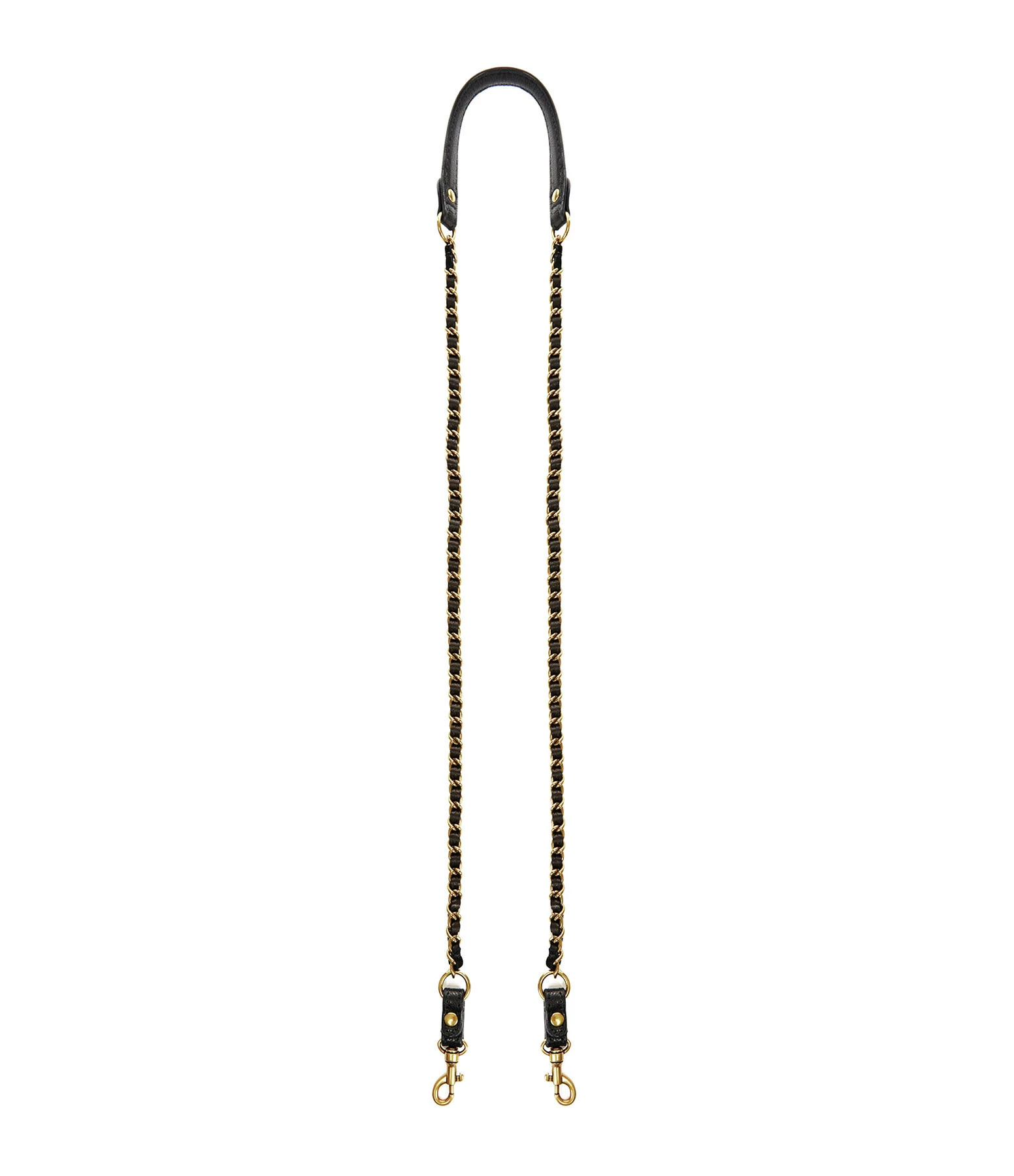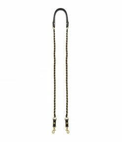 Bandoulière en chaîne dorée et cuir noir. Attaches mousquetons dorés.