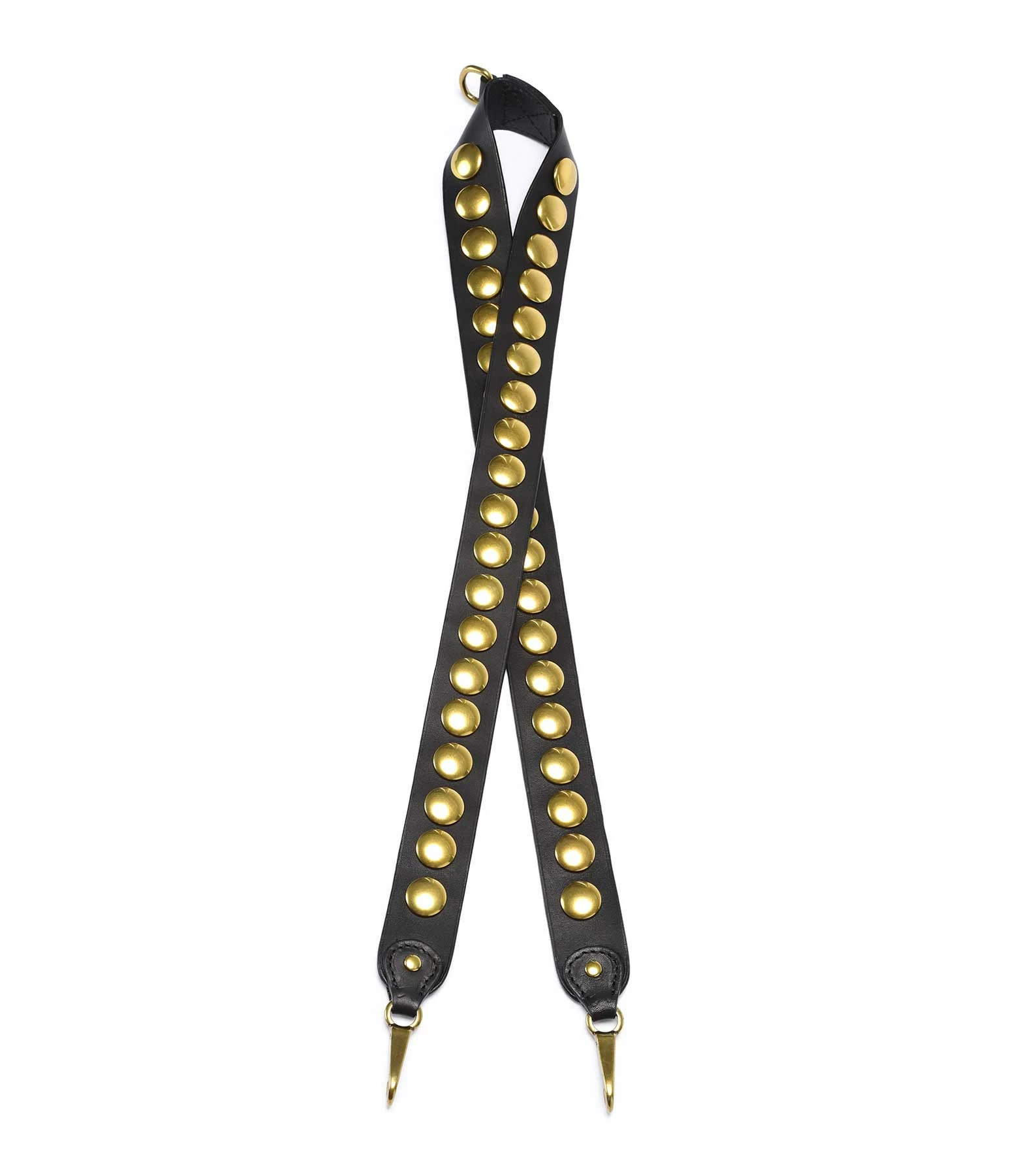 Bandoulière plate en cuir noir avec rivets dorés. Attaches mousqueton. Réglable sur deux longueurs.