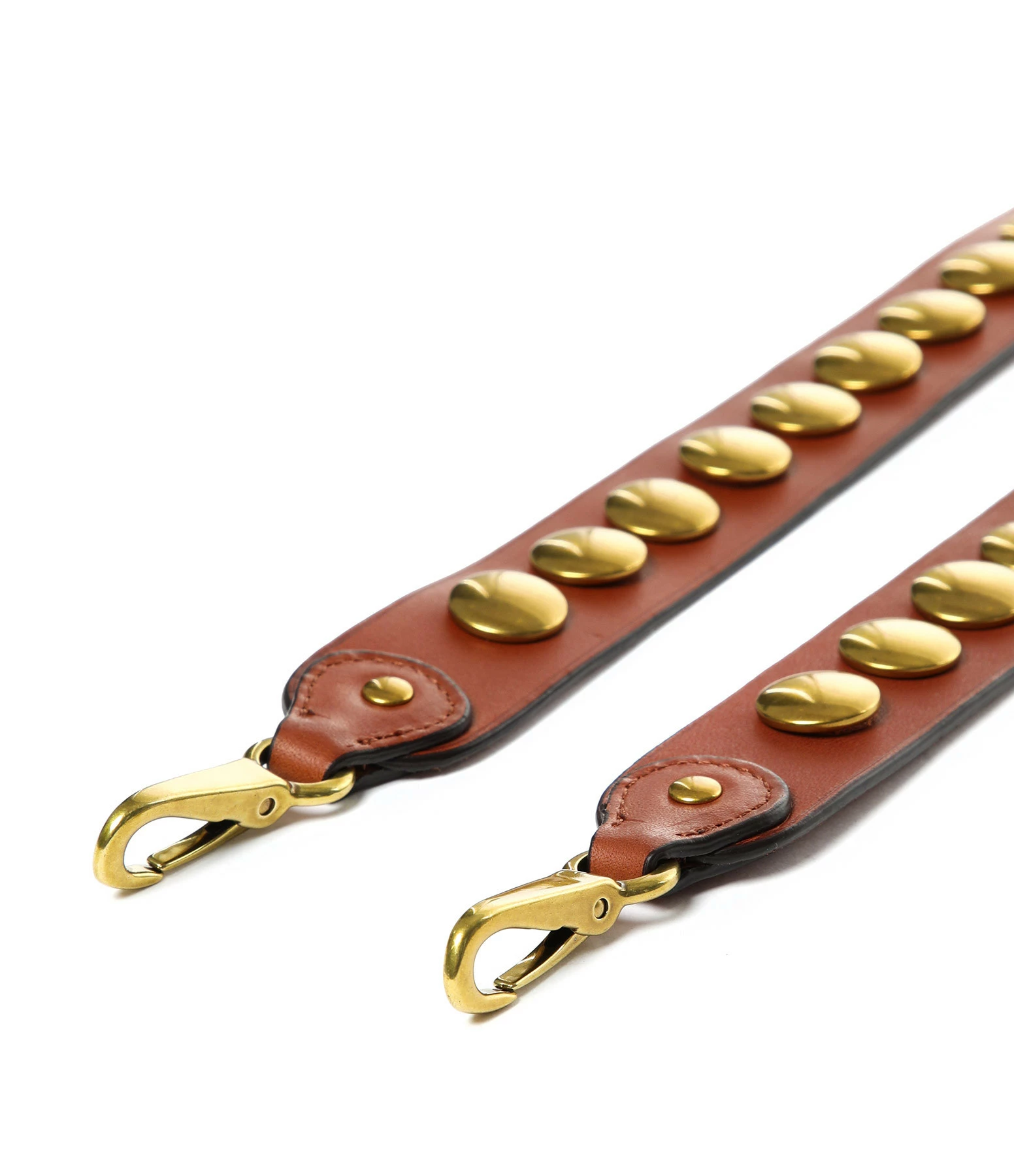 Bandoulière plate en cuir marron avec rivets dorés. Attaches mousqueton. Réglable sur deux longueurs.