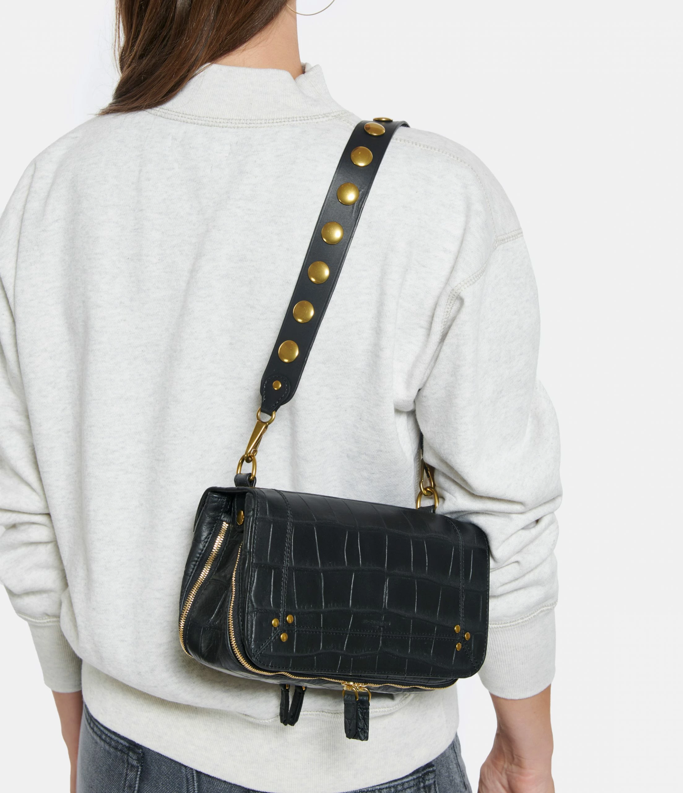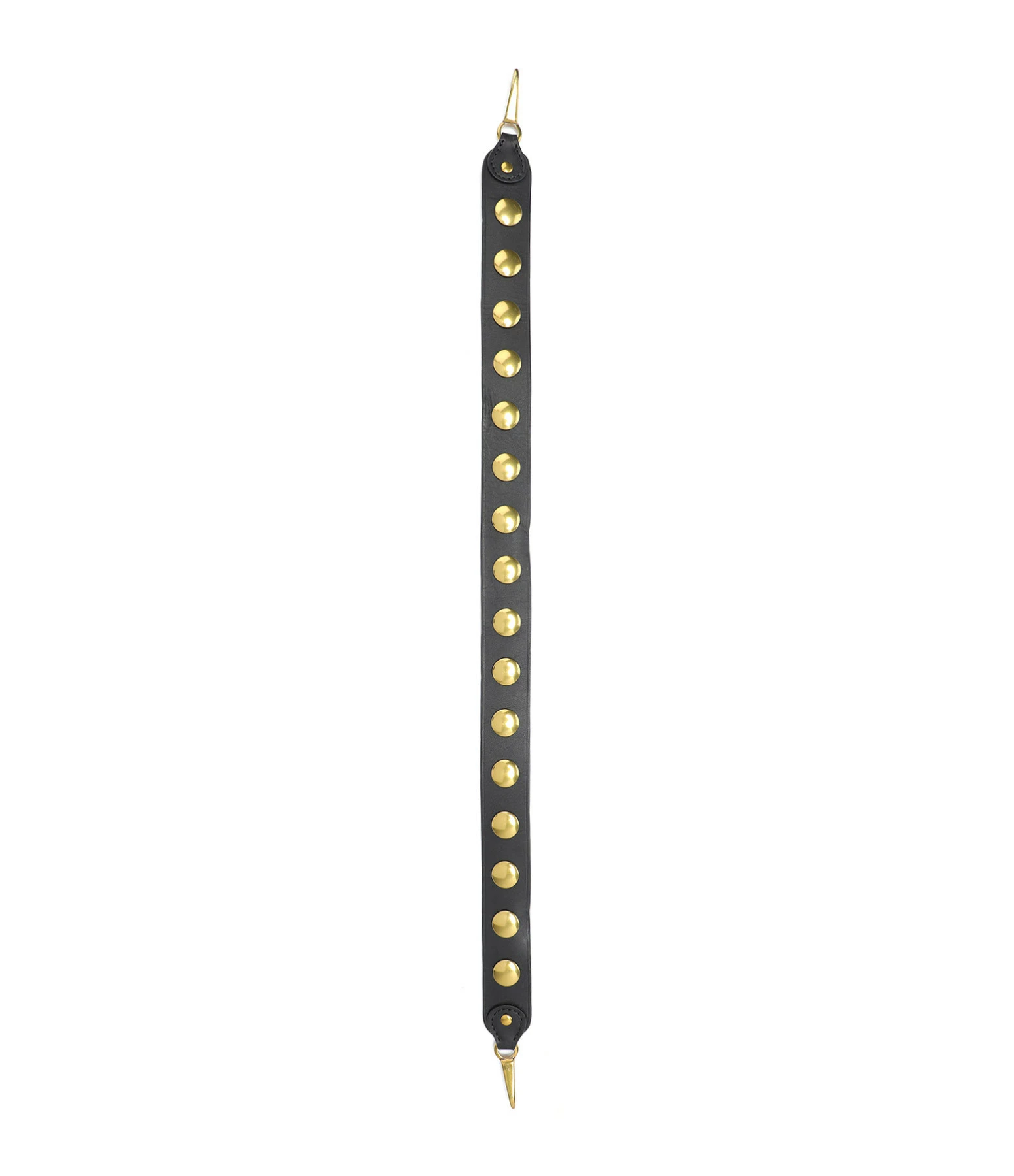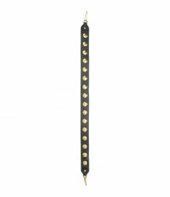 Anse plate en cuir noir avec rivets dorés. Attaches mousqueton.
