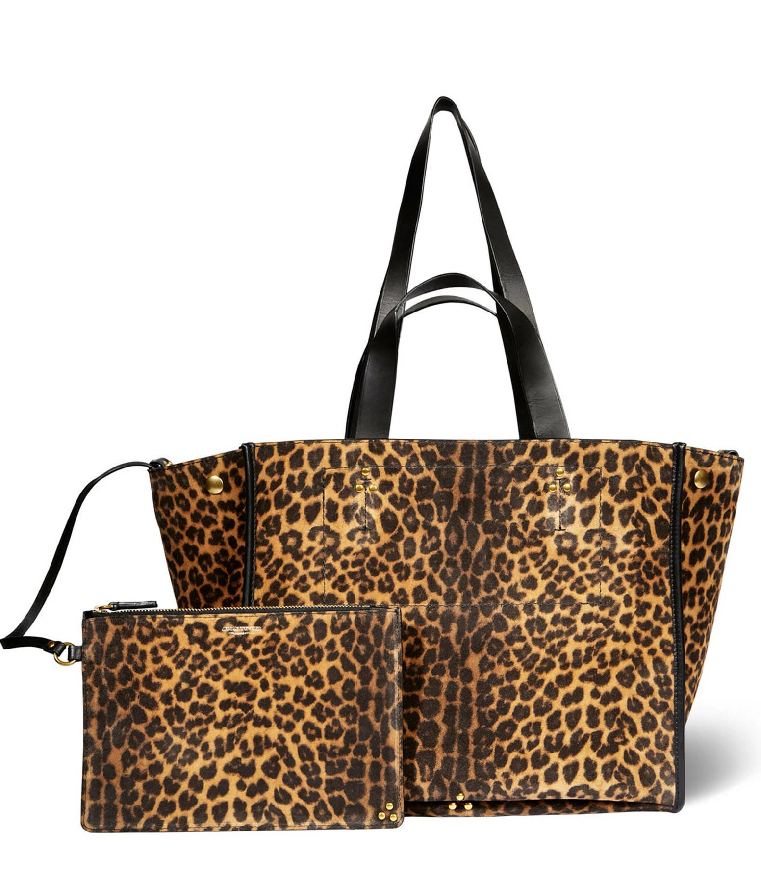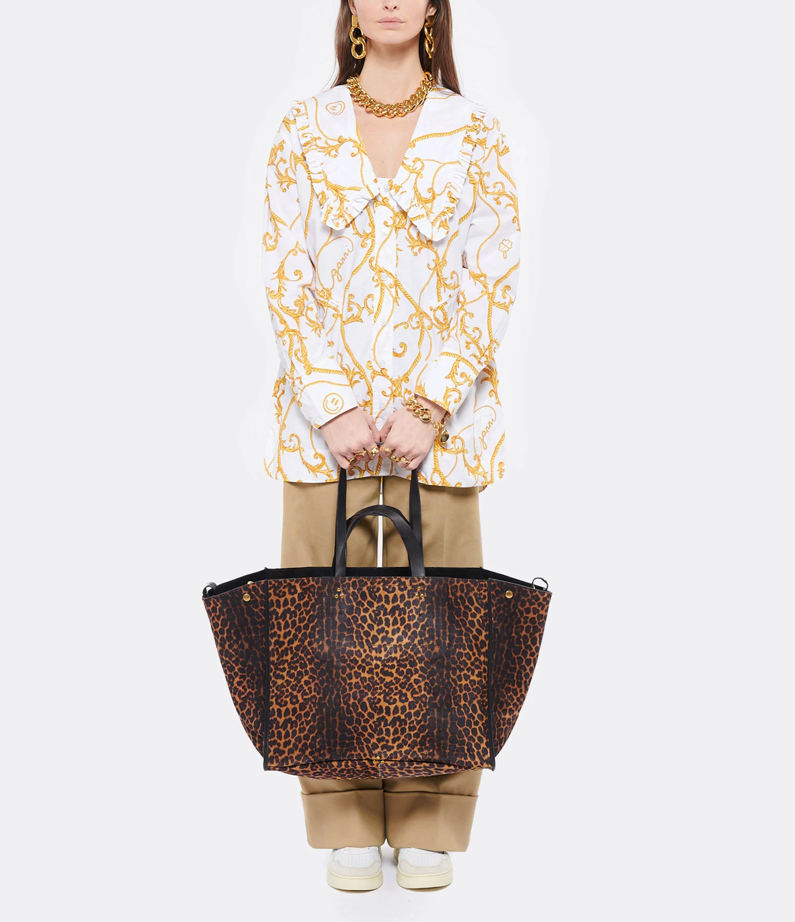 Sac cabas en cuir suédé imprimé léopard. Quatre anses de deux tailles différentes. Volume ajustable par deux soufflets zippés. Intérieur en cuir avec une pochette zippée. Fermeture par boutons pressions.