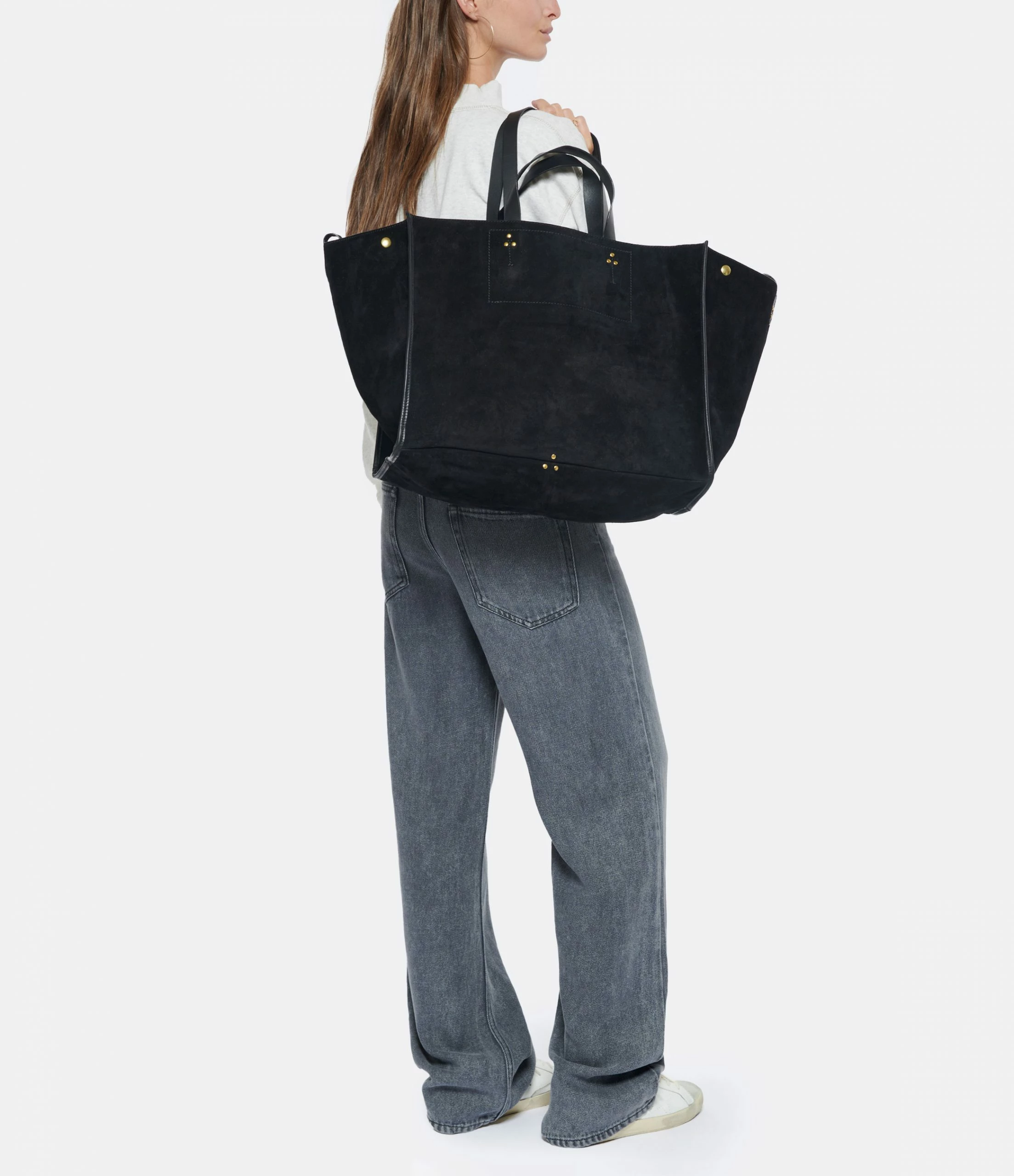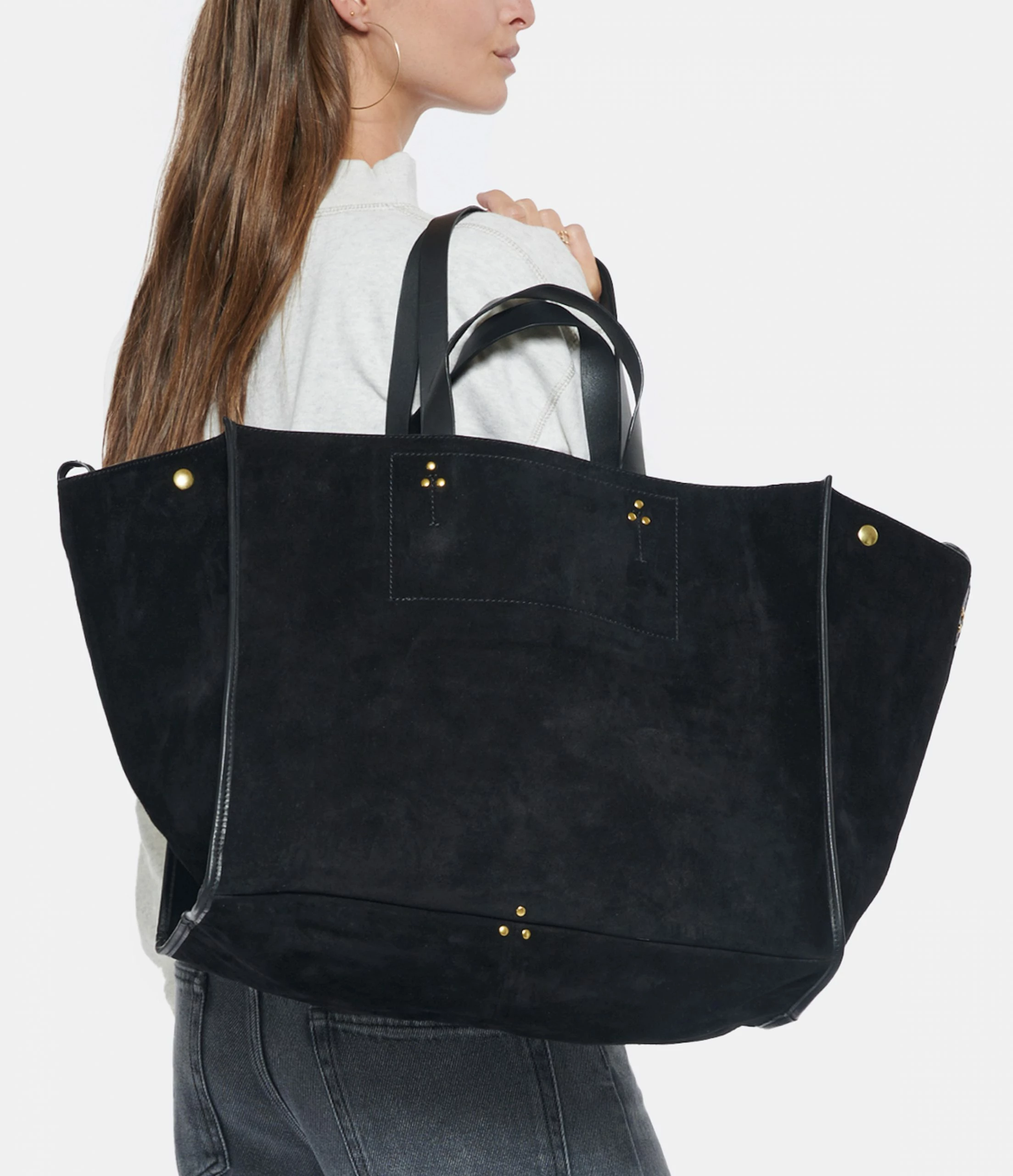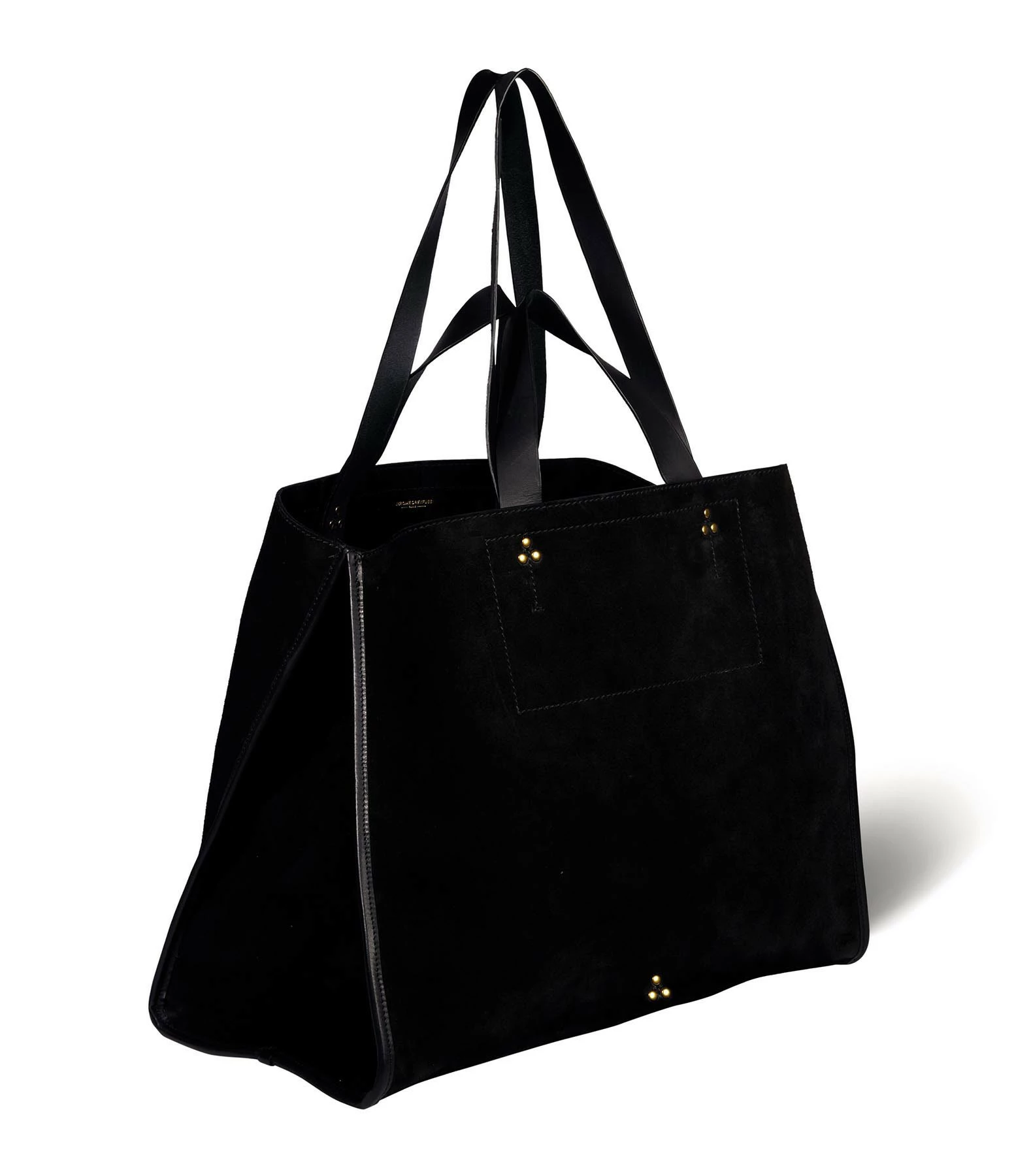 Sac cabas en cuir suédé noir. Quatre anses de deux tailles différentes. Volume ajustable par deux soufflets zippés. Intérieur en cuir avec une pochette zippée. Fermeture par boutons pressions.