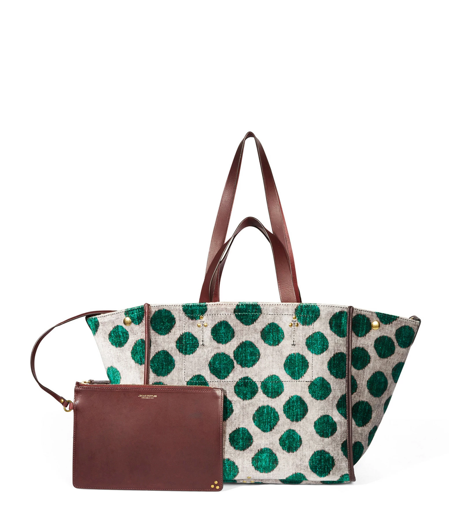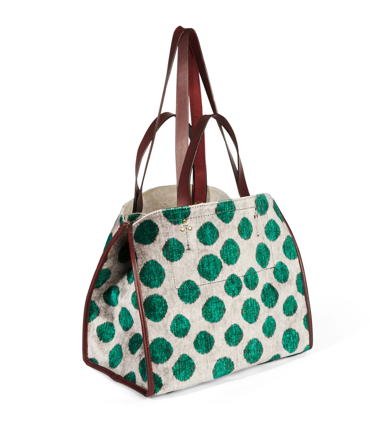 Sac cabas en velours imprimé pois vert et gris. Quatre anses de deux tailles différentes. Volume ajustable par deux soufflets zippés. Intérieur en cuir avec une pochette zippée. Fermeture par boutons pressions.