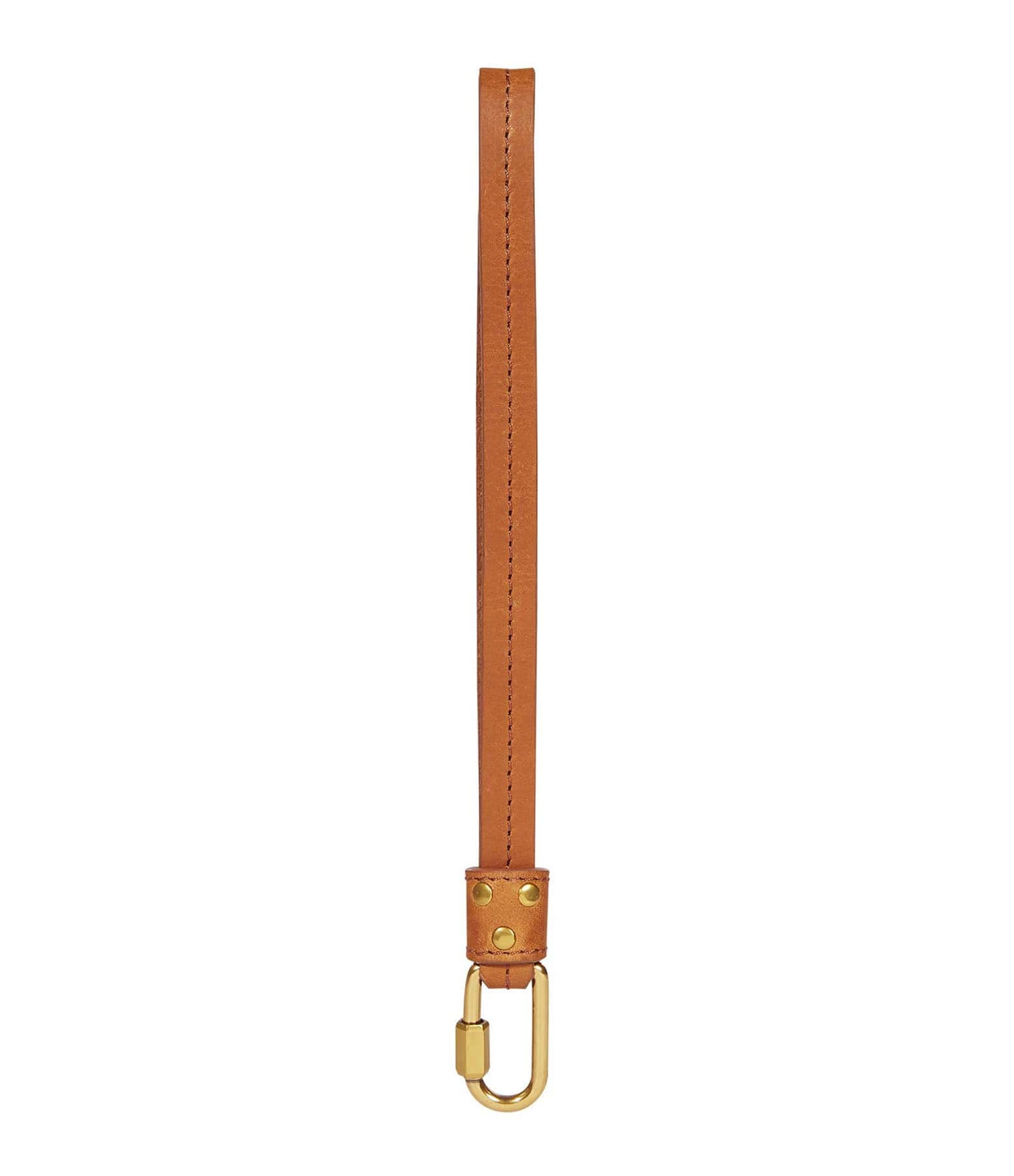 Petite sangle en cuir orange, avec mousqueton vissé pour l’accrocher.
