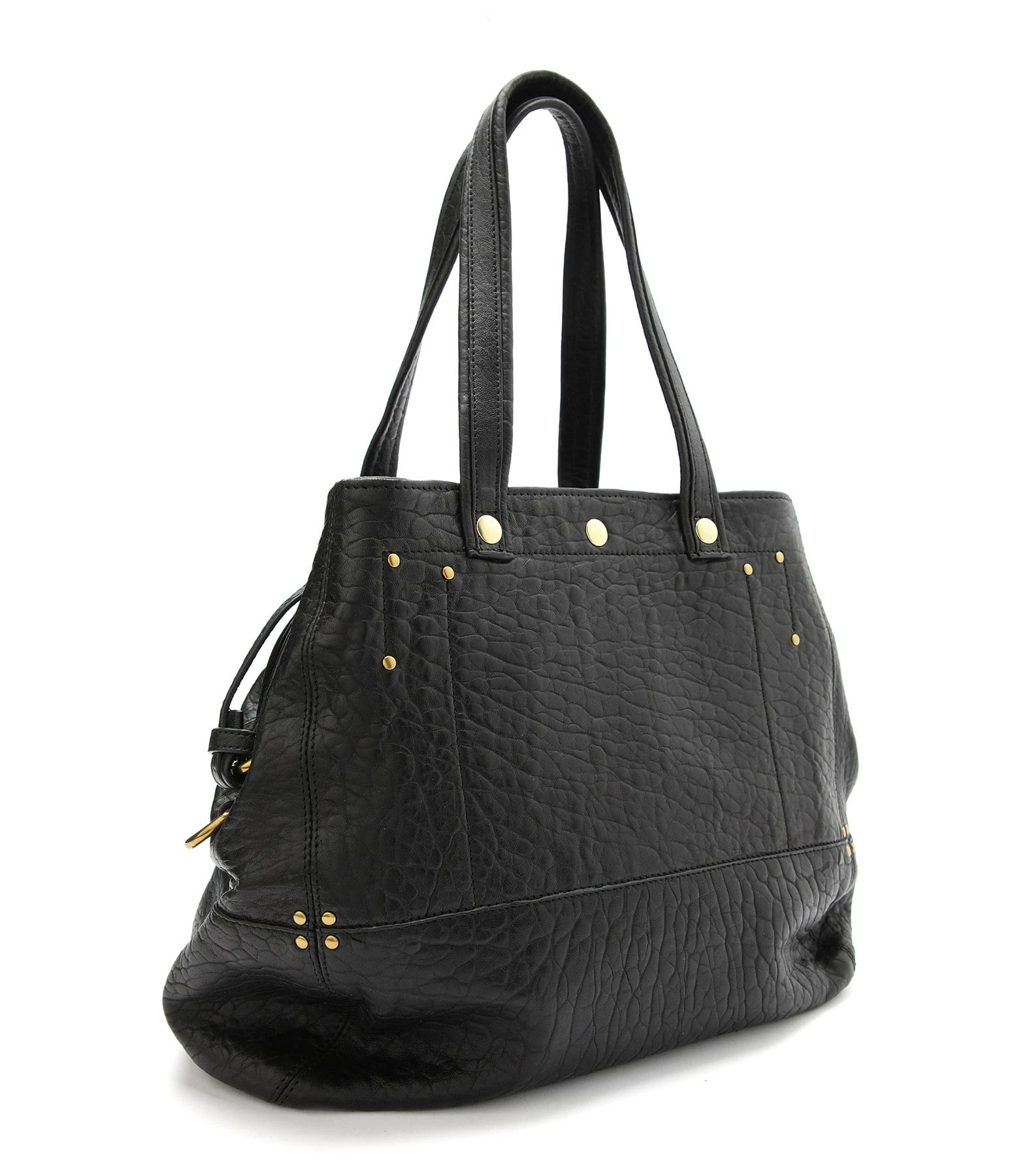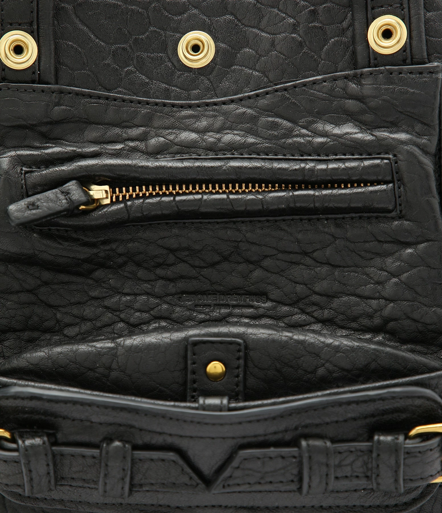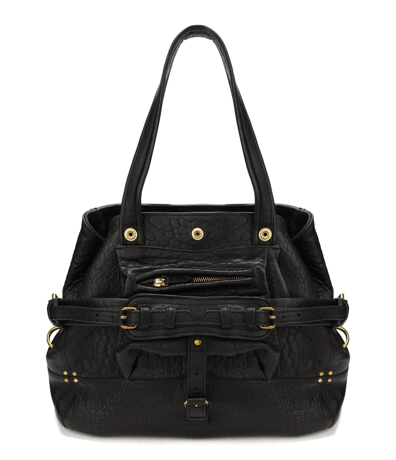 Sac à main en cuir bubble noir avec une poche zippée sur l’avant. Deux anses et une bandoulière courte non ajustable. Fermeture par boutons pressions. Intérieur doublé en coton avec une poche plaquée.