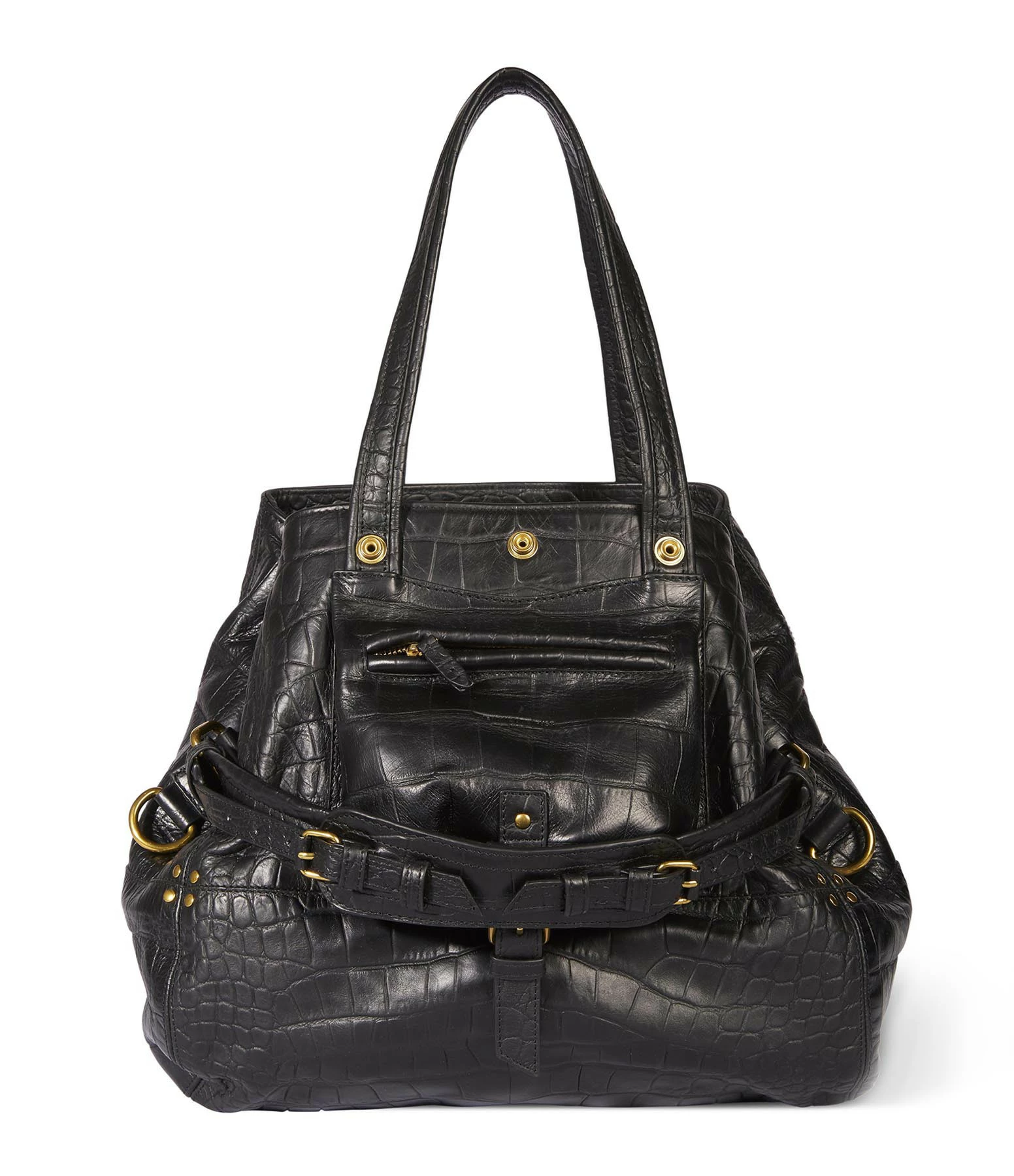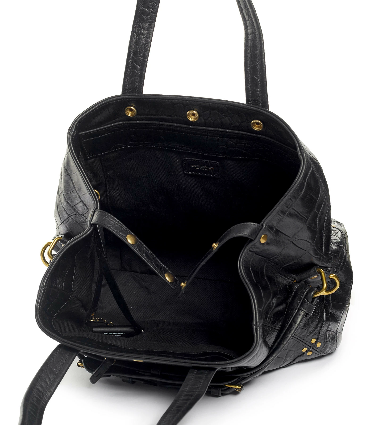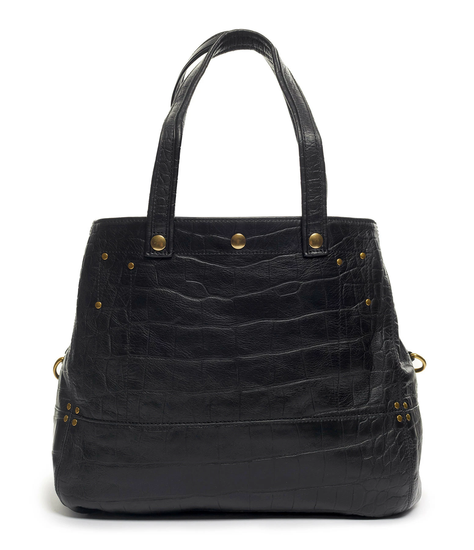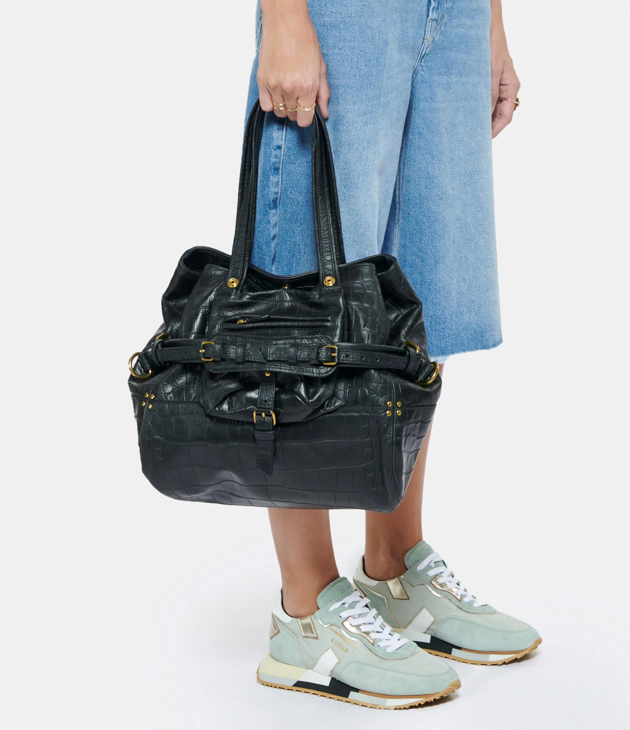 Sac à main en cuir lisse effet croco noir avec une poche zippée sur l’avant. Deux anses et une bandoulière courte non ajustable. Fermeture par boutons pressions. Intérieur doublé en coton avec une poche plaquée.
