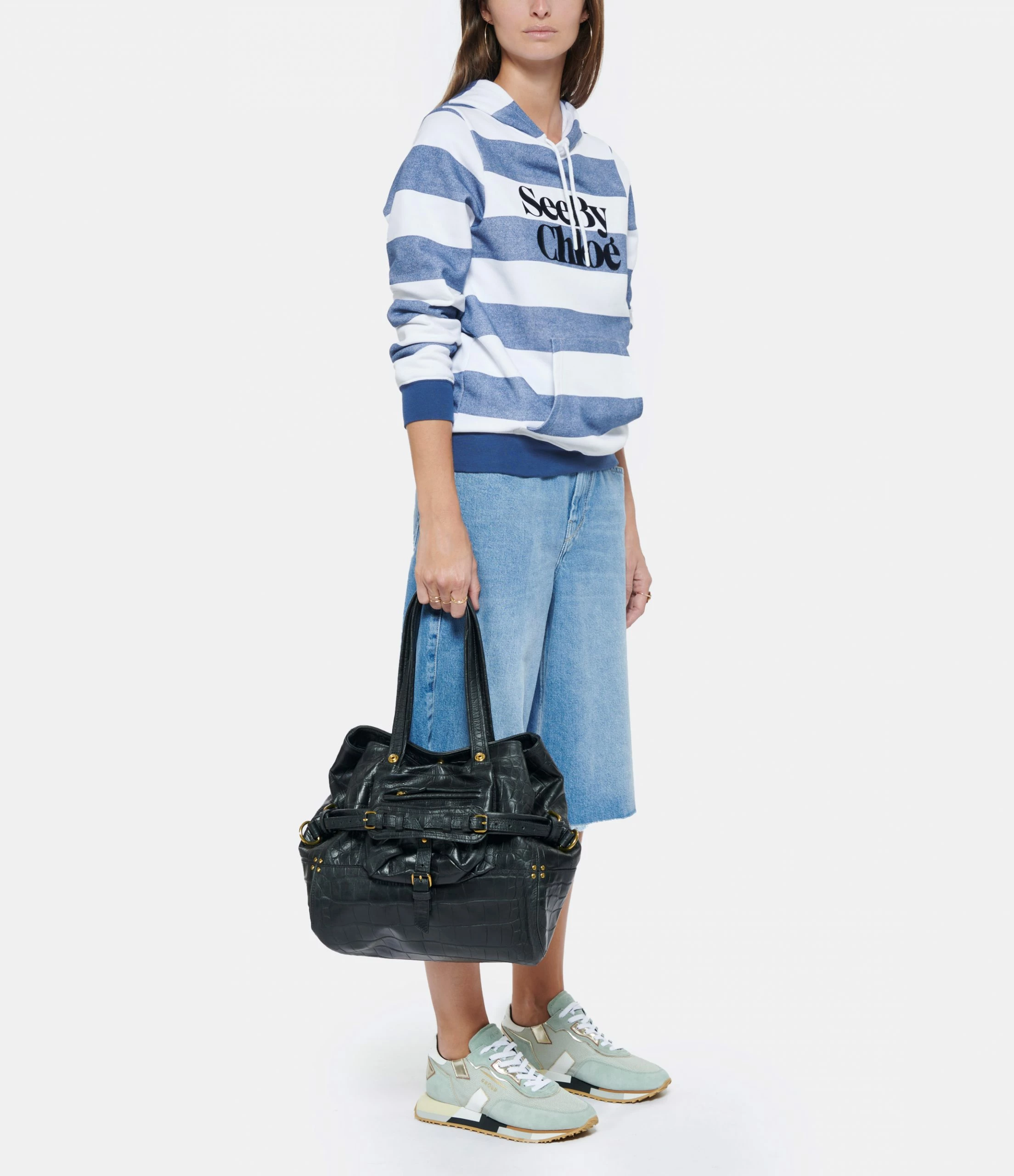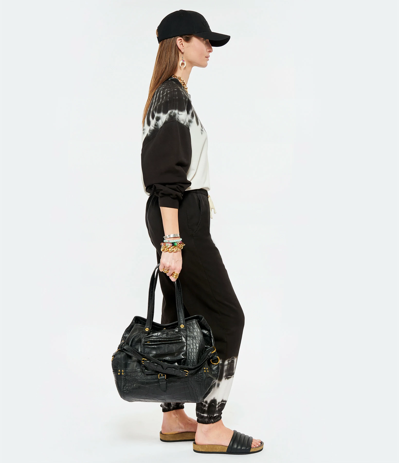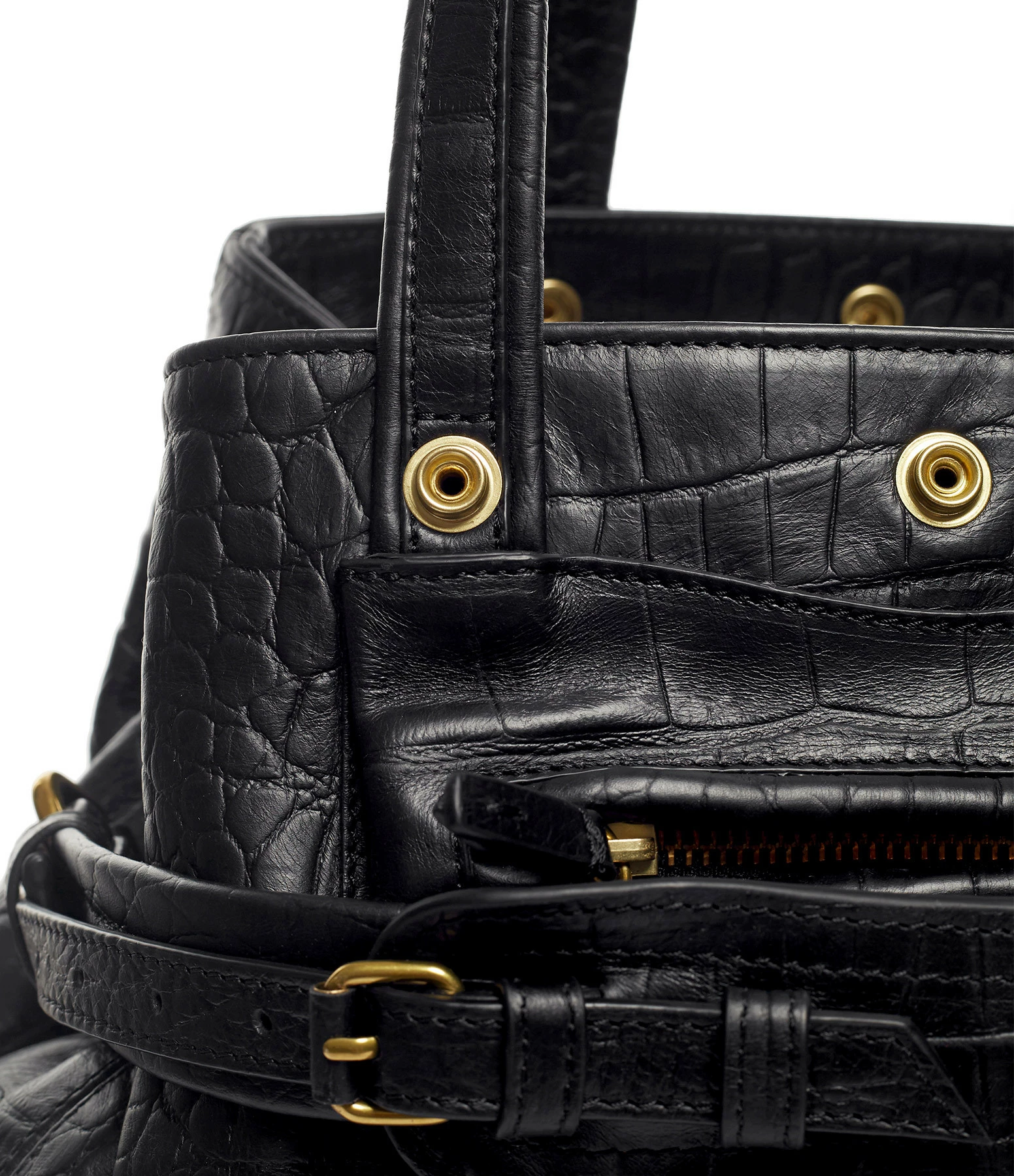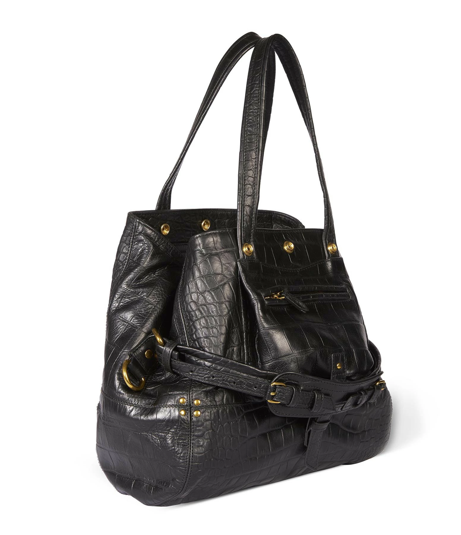 Sac à main en cuir lisse effet croco noir avec une poche zippée sur l’avant. Deux anses et une bandoulière courte non ajustable. Fermeture par boutons pressions. Intérieur doublé en coton avec une poche plaquée.