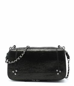 Sac bandoulière en cuir lamé noir. Bandoulière tressée en cuir et chaîne, amovible par mousquetons, et réglable en deux longueurs. Fermeture par rabat aimanté avec miroir sous le rabat. Volume ajustable par deux soufflets zippés. Intérieur doublé avec une poche plaquée.