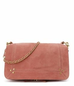 Sac bandoulière en cuir suédé rose. Bandoulière tressée en cuir et chaîne, amovible par mousquetons, et réglable en deux longueurs. Fermeture par rabat aimanté avec miroir sous le rabat. Volume ajustable par deux soufflets zippés. Intérieur doublé avec une poche plaquée.