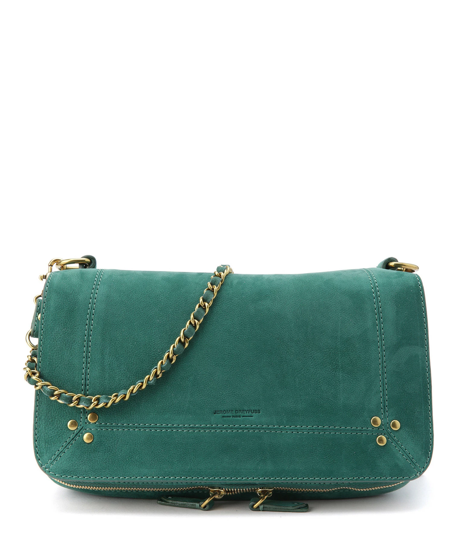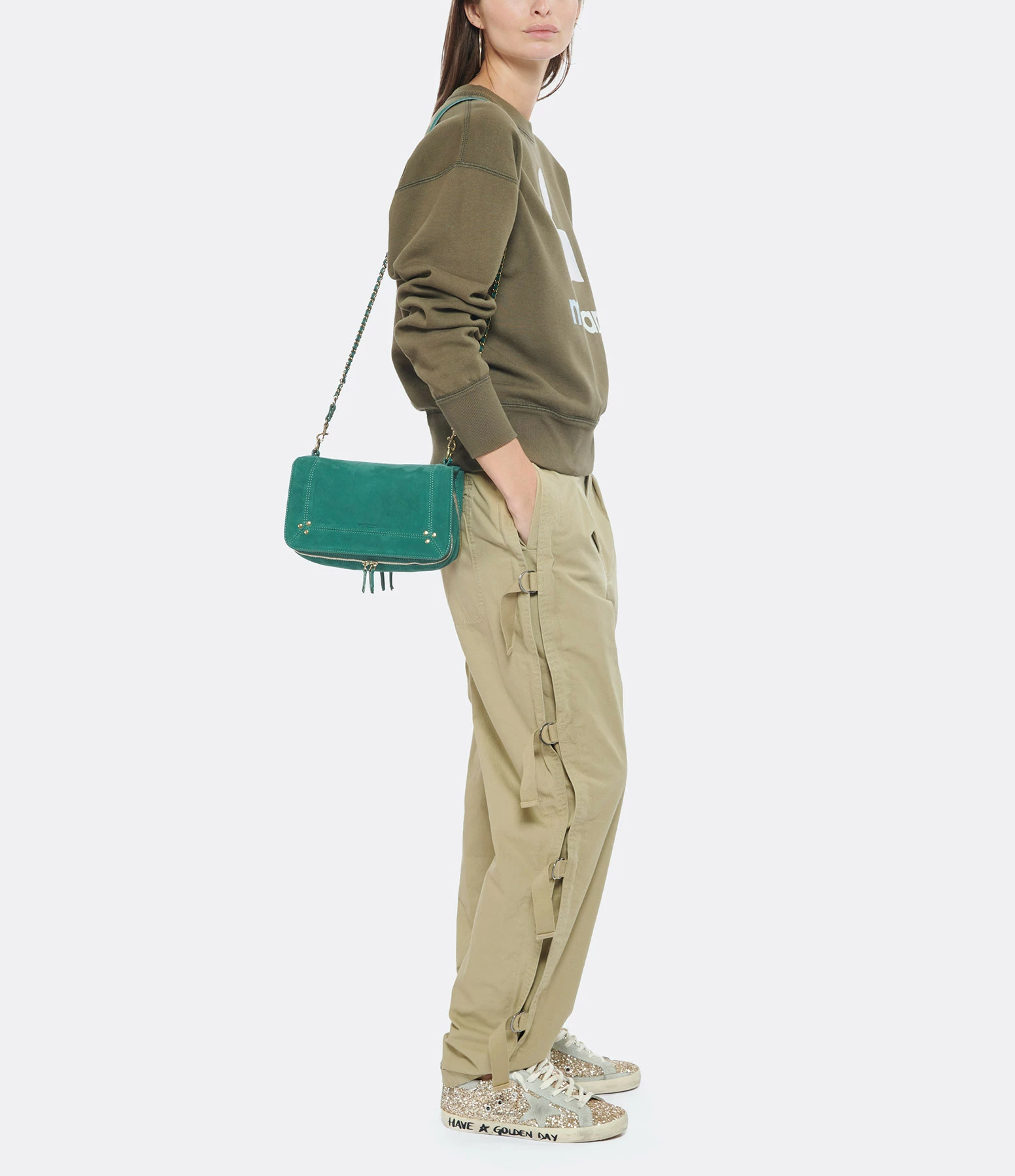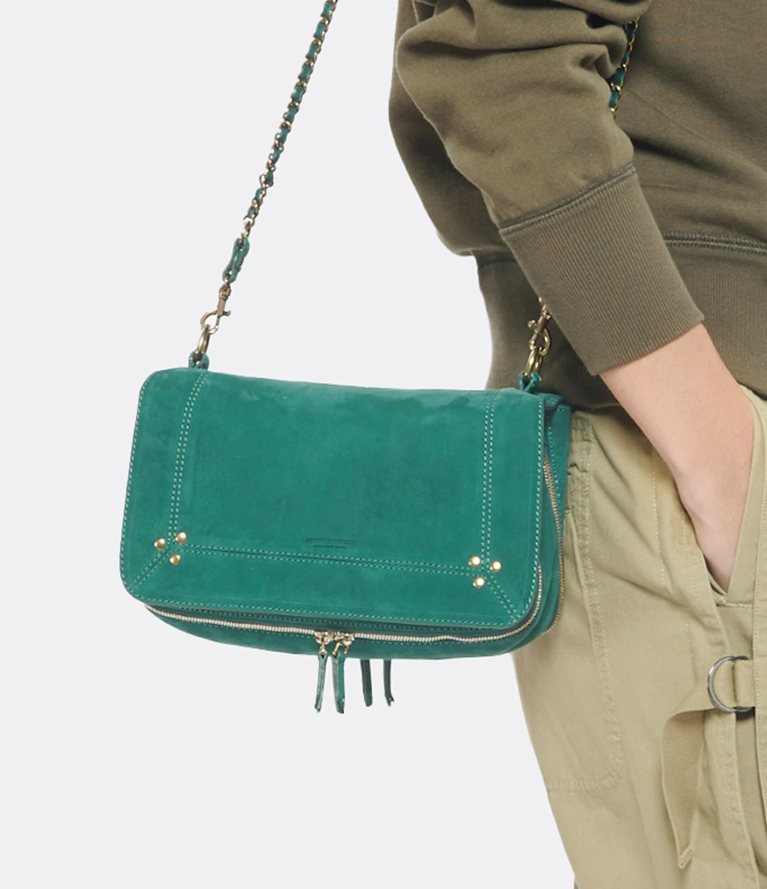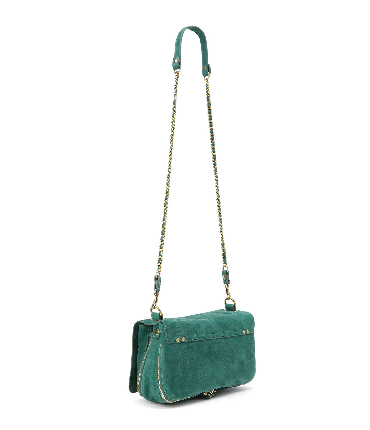 Sac bandoulière en cuir suédé vert jade. Bandoulière tressée en cuir et chaîne, amovible par mousquetons, et réglable en deux longueurs. Fermeture par rabat aimanté avec miroir sous le rabat. Volume ajustable par deux soufflets zippés. Intérieur doublé avec une poche plaquée.