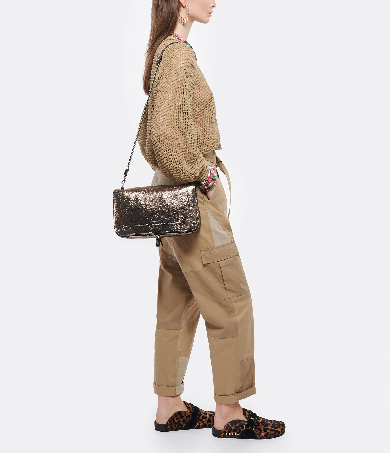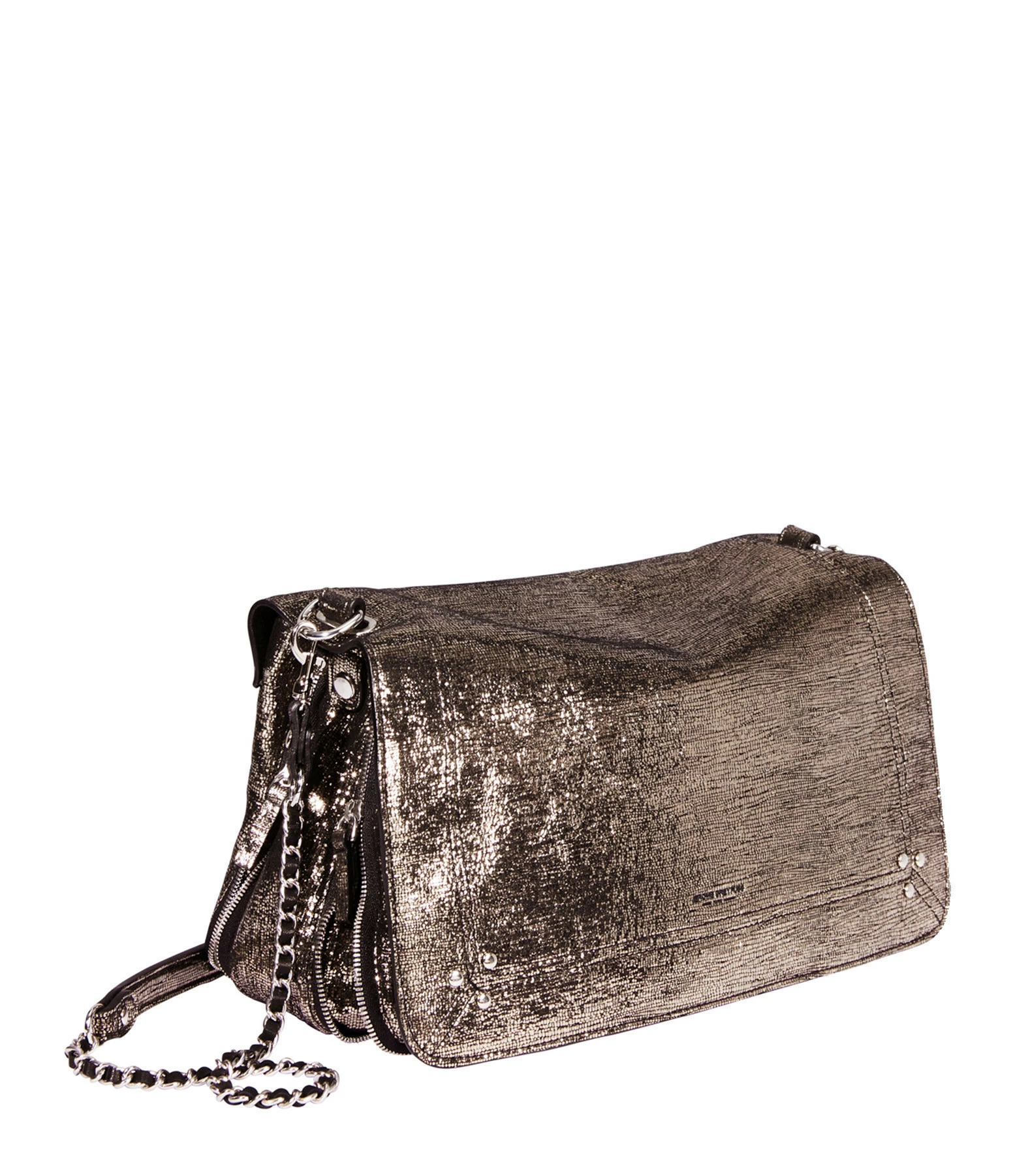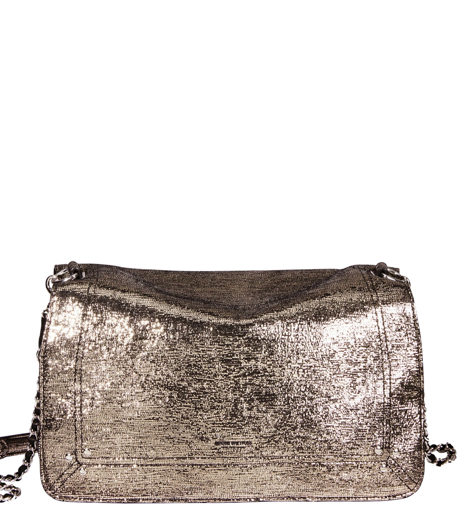 Sac bandoulière en cuir lamé champagne. Bandoulière tressée en cuir et chaîne, amovible par mousquetons, et réglable en deux longueurs. Fermeture par rabat aimanté avec miroir sous le rabat. Volume ajustable par deux soufflets zippés. Intérieur doublé avec une poche plaquée.