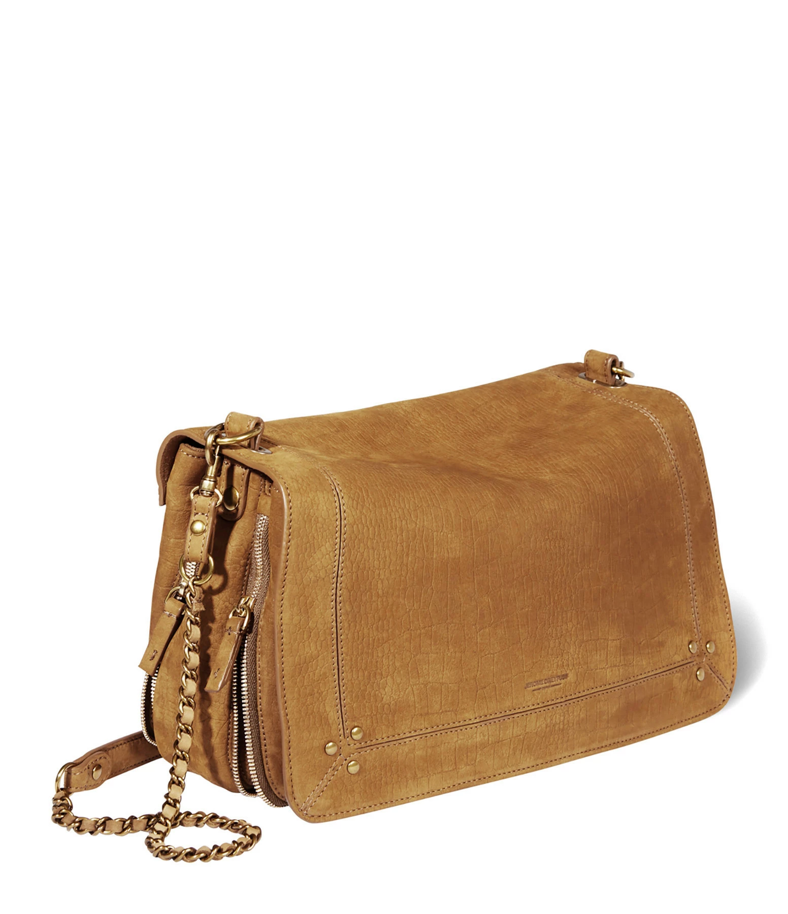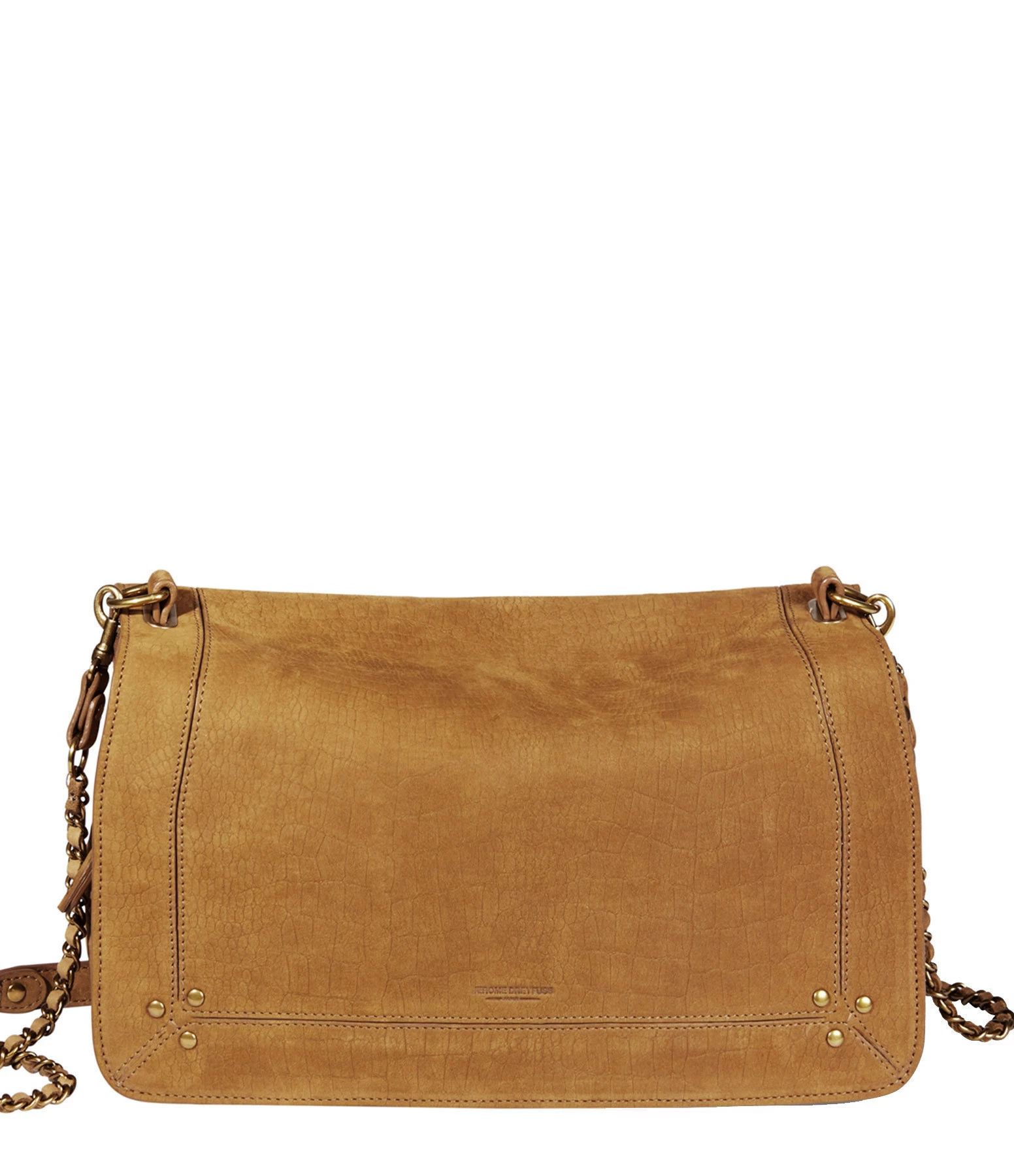 Sac bandoulière en cuir suédé effet croco marron. Bandoulière tressée en cuir et chaîne, amovible par mousquetons, et réglable en deux longueurs. Fermeture par rabat aimanté avec miroir sous le rabat. Volume ajustable par deux soufflets zippés. Intérieur doublé avec une poche plaquée.