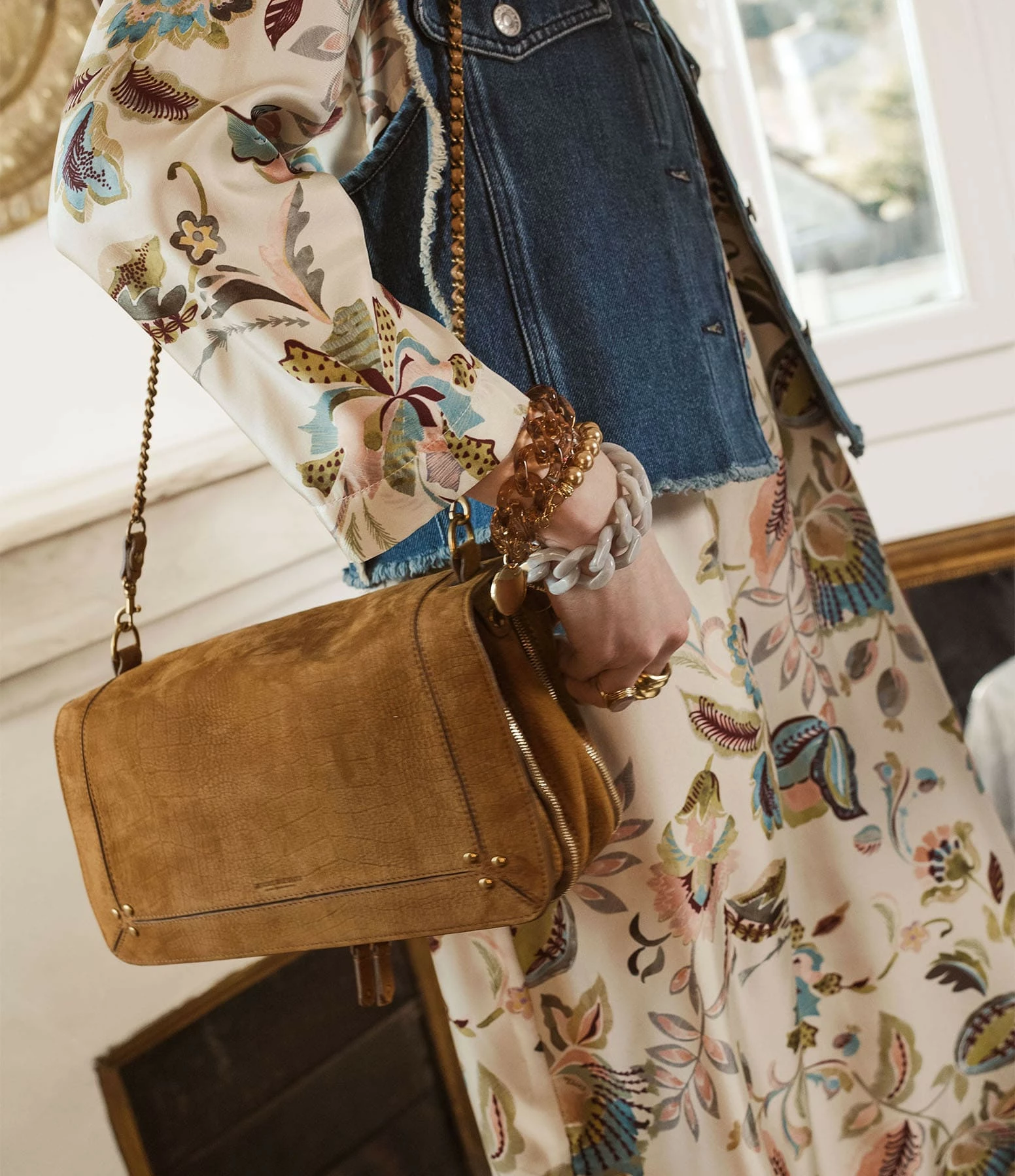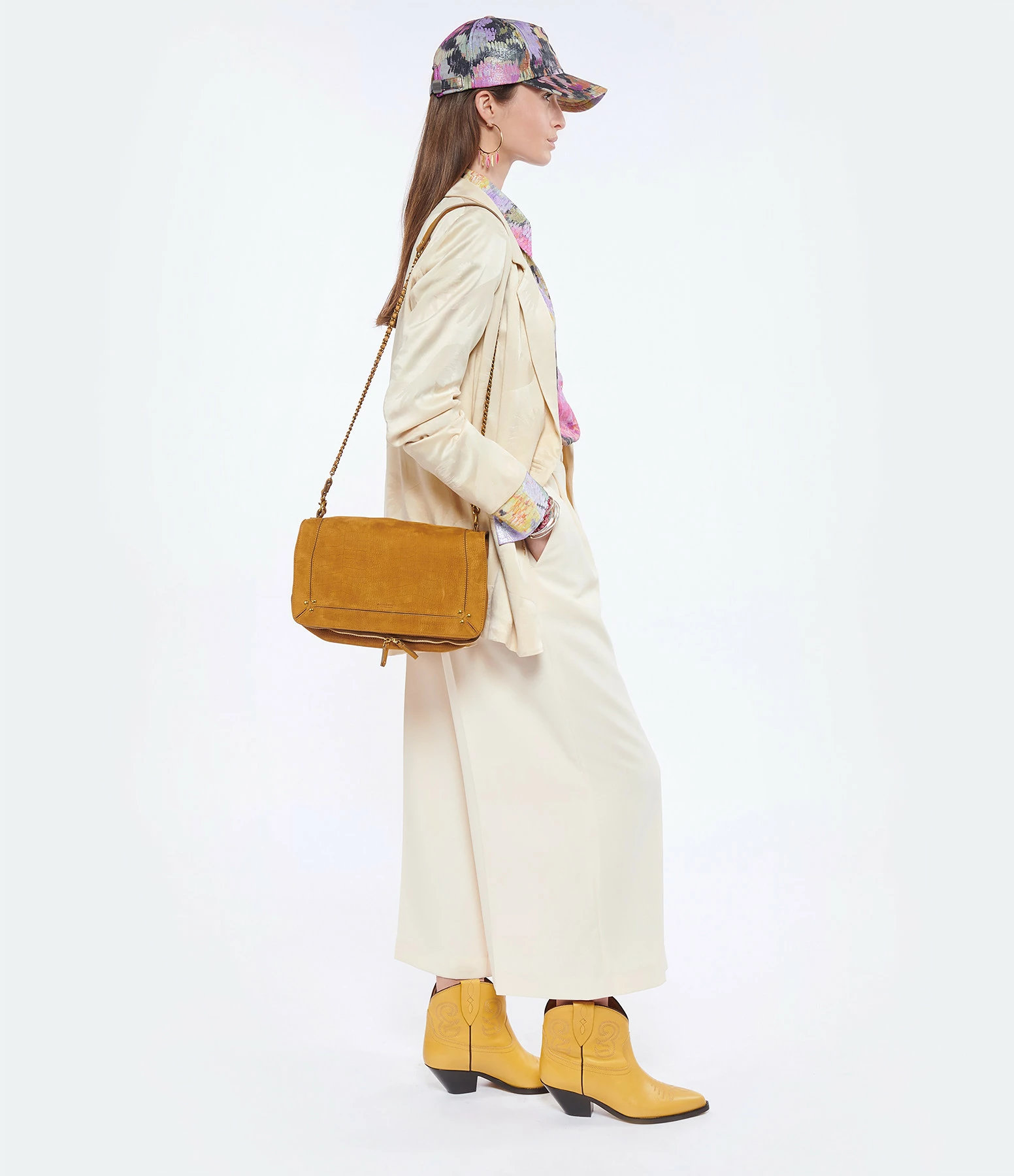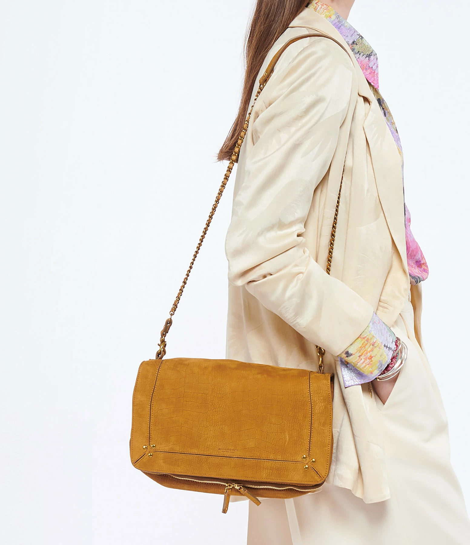 Conseil d’entretien : Avant de porter votre accessoire, brossez les parties en velours avec une brosse souple afin d’éliminer les poussières dues au ponçage et l’imperméabiliser avec un spray (testez le produit à l’intérieur de votre sac). Cette manipulation peut être répétée régulièrement. Veillez à faire attention aux frottements et aux griffures qui pourraient l’abîmer. Les premiers jours, portez votre accessoire avec des vêtements de couleurs similaires pour éviter le dégorgement des couleurs. Évitez les contacts avec l’eau, les sources de chaleur, le soleil, la lumière artificielle et les corps gras qui pourraient altérer la couleur.