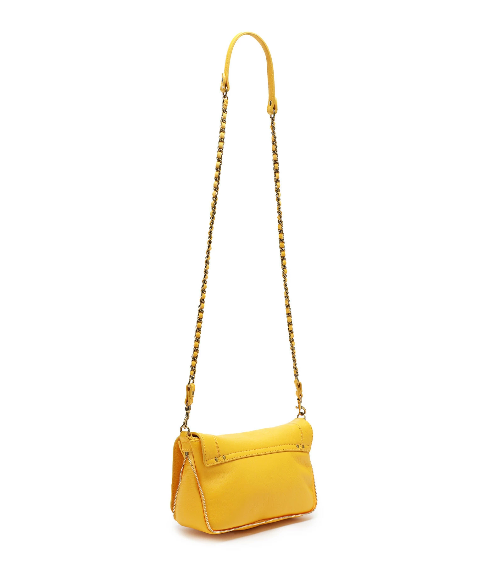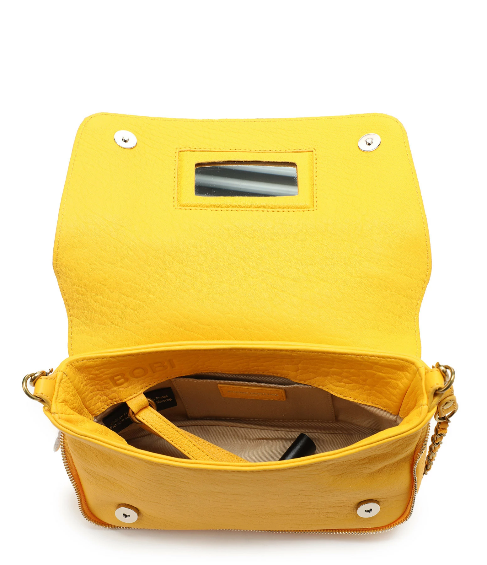 Sac bandoulière en cuir bubble jaune. Bandoulière tressée en cuir et chaîne, amovible par mousquetons. Fermeture par rabat aimanté avec miroir sous le rabat. Volume ajustable par deux soufflets zippés, permettant de transformer le sac en pochette. Intérieur doublé avec une poche plaquée.