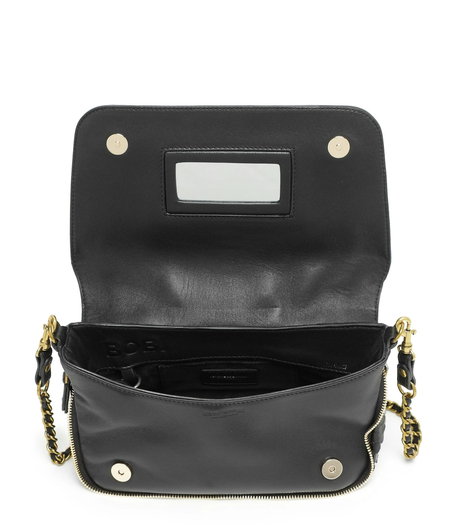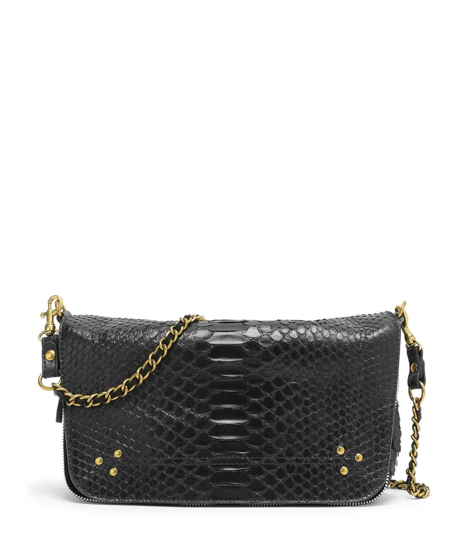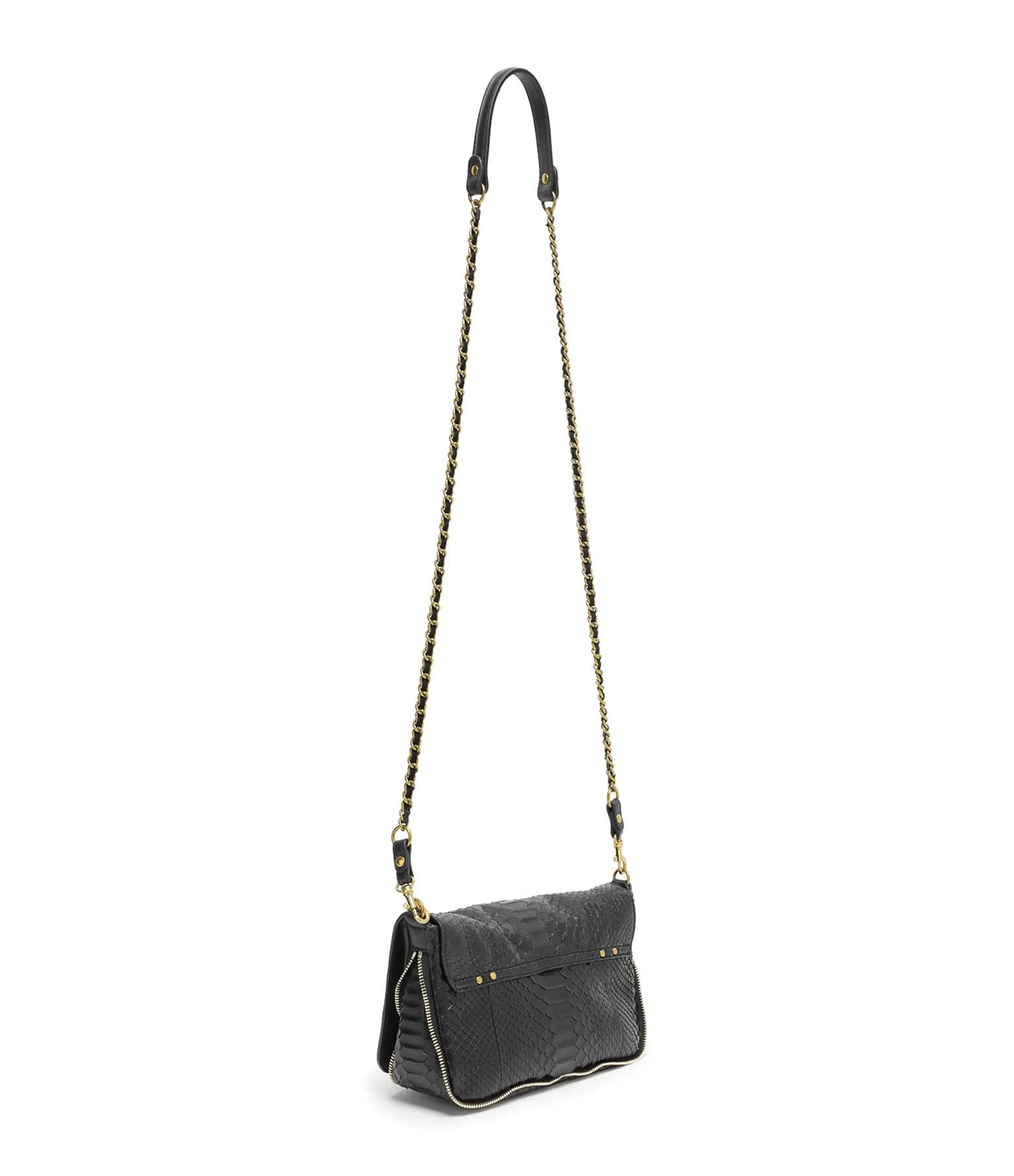 Sac bandoulière en cuir de python noir. Bandoulière tressée en cuir et chaîne, amovible par mousquetons. Fermeture par rabat aimanté avec miroir sous le rabat. Volume ajustable par deux soufflets zippés, permettant de transformer le sac en pochette. Intérieur doublé avec une poche plaquée.