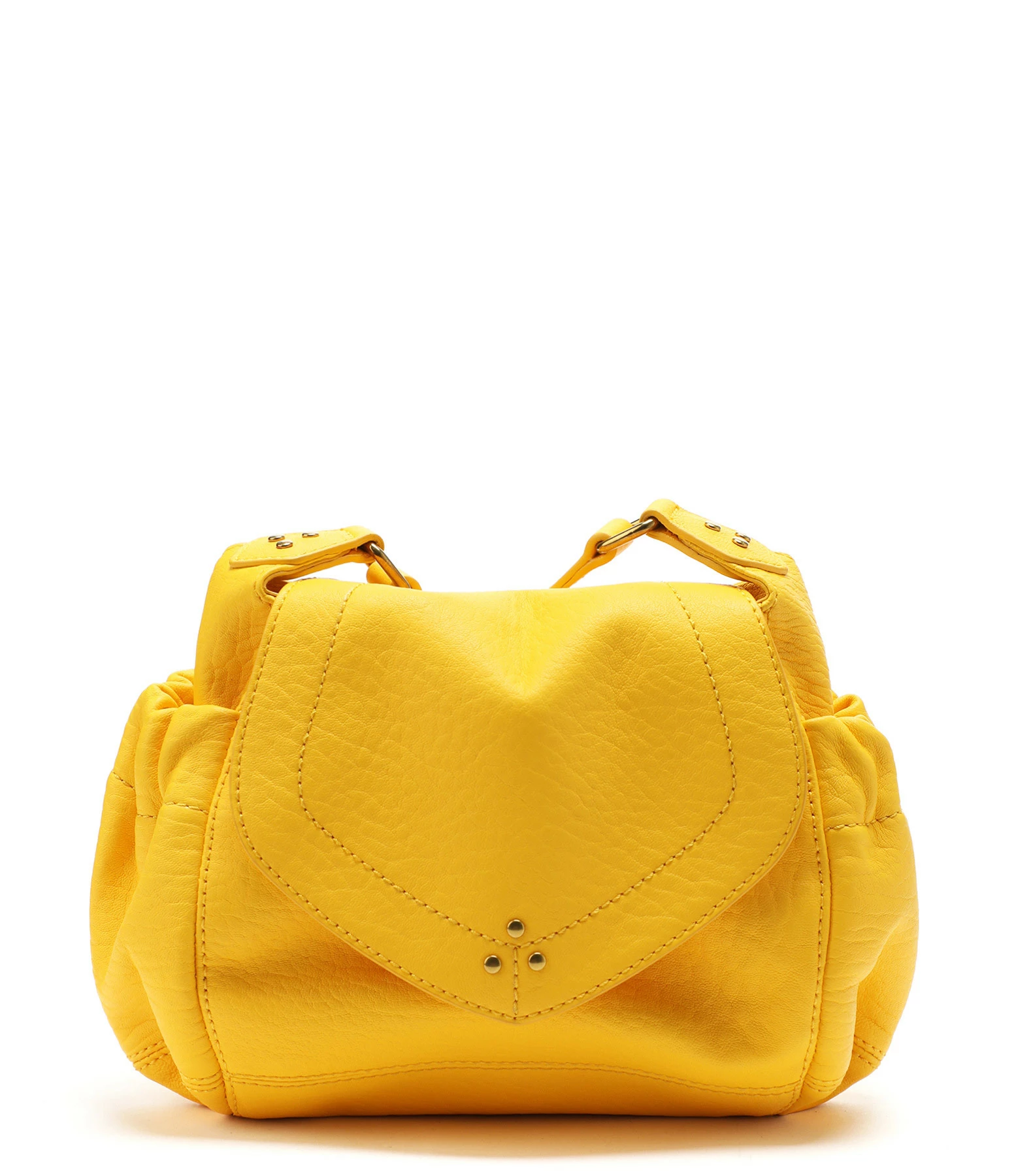 Sac besace en cuir bubble jaune avec deux poches plaquées élastiquées sur les côtés. Bandoulière réglable, non amovible. Fermeture par rabat aimanté. Intérieur doublé avec une poche plaquée zippée.