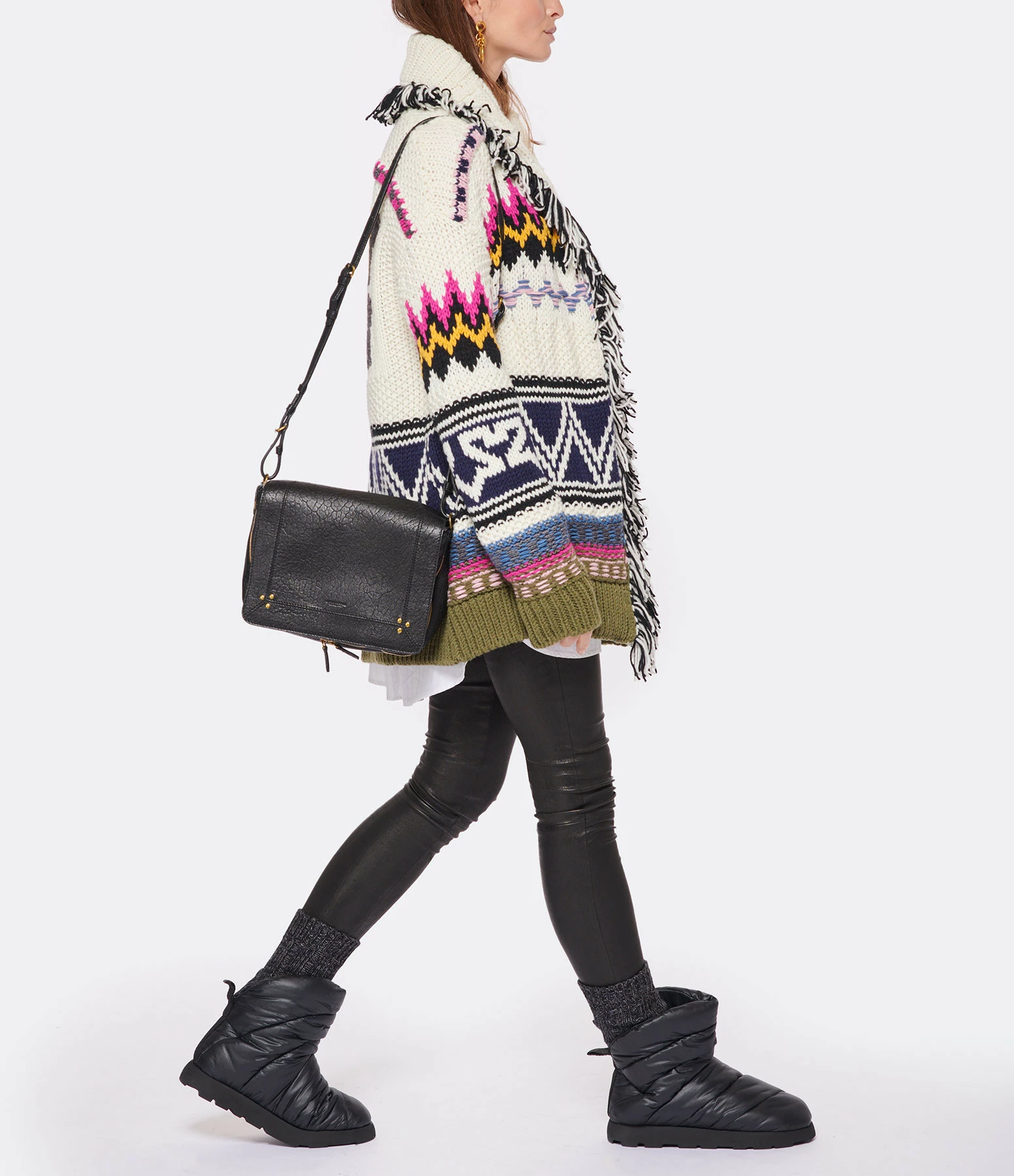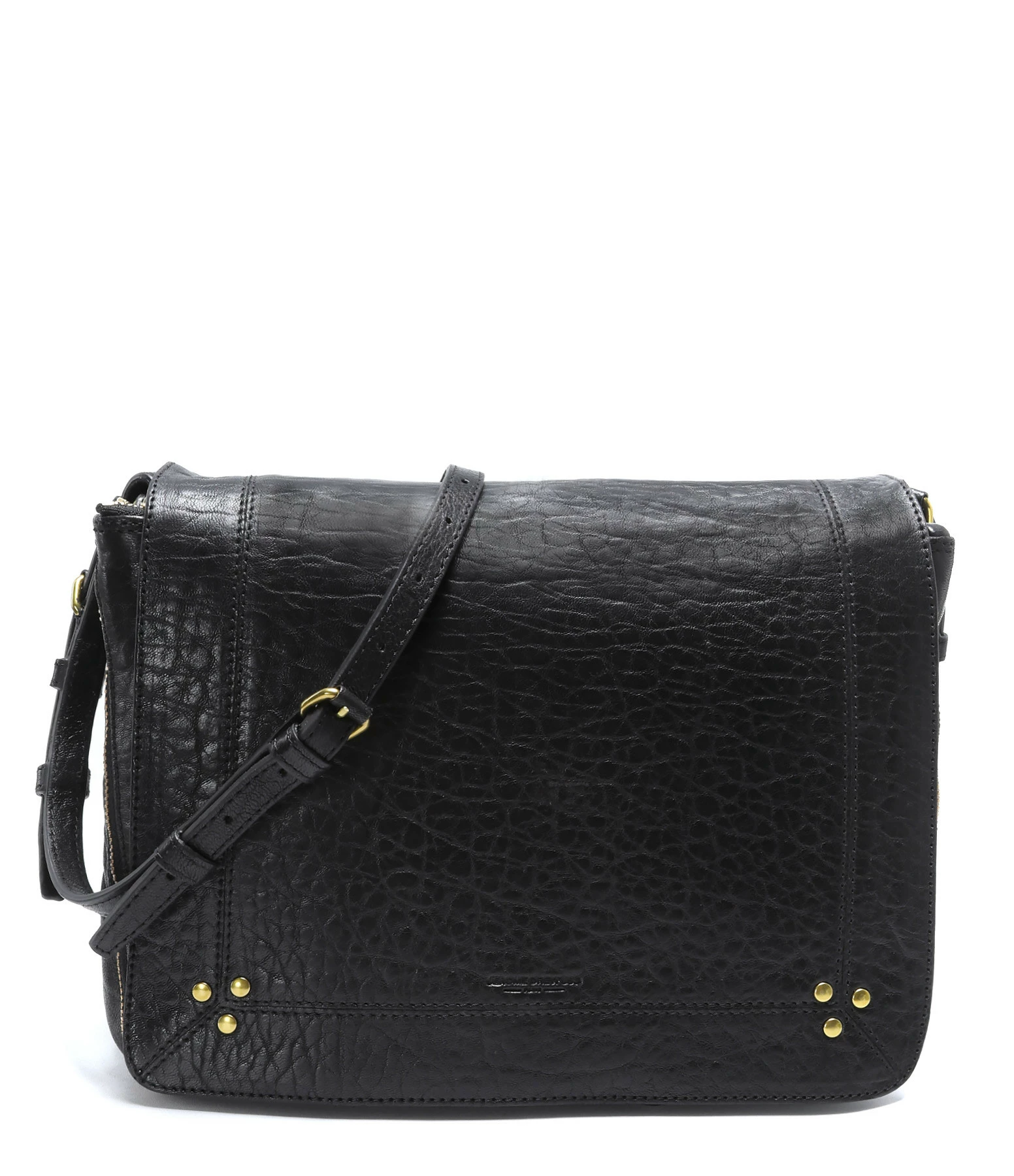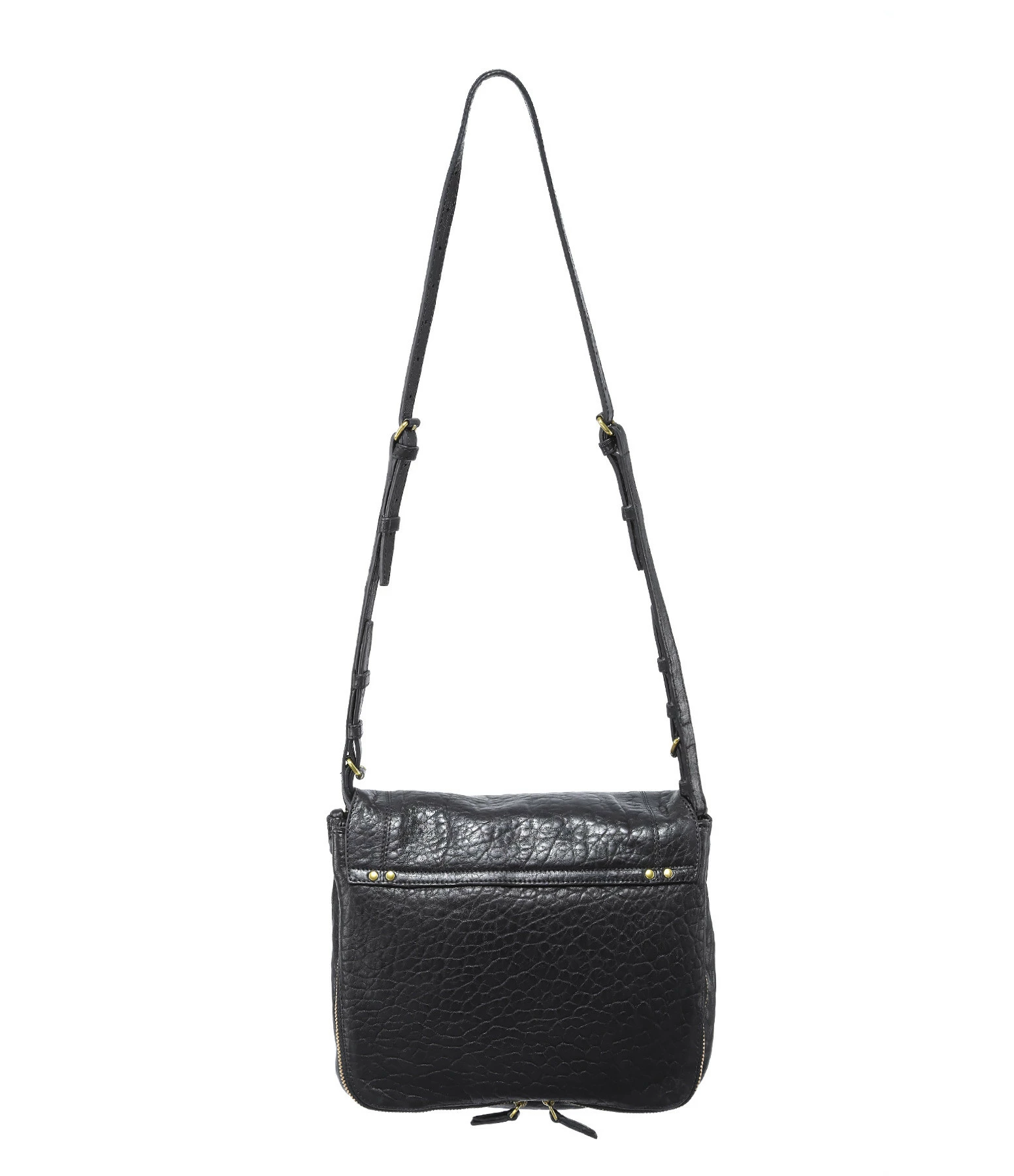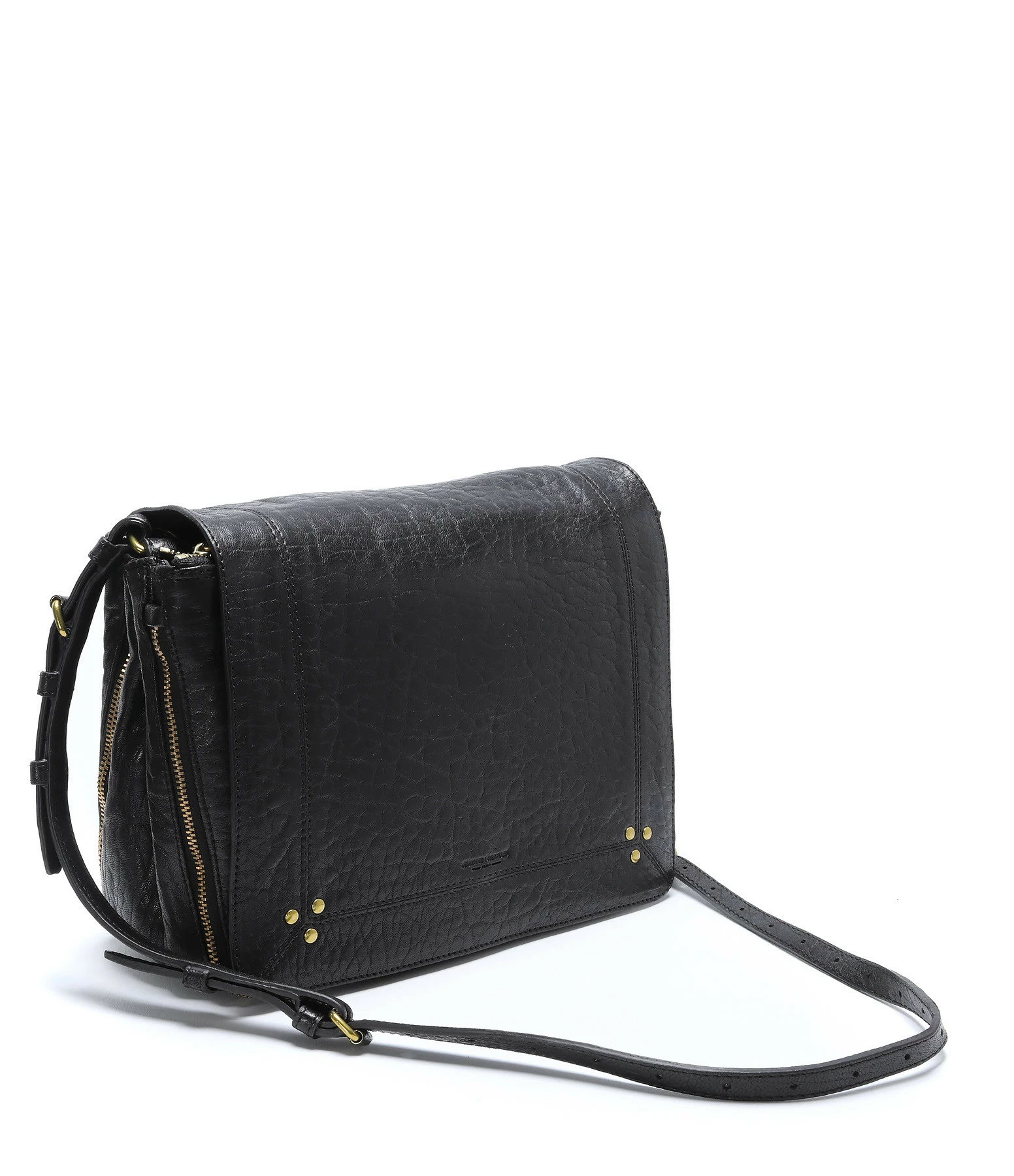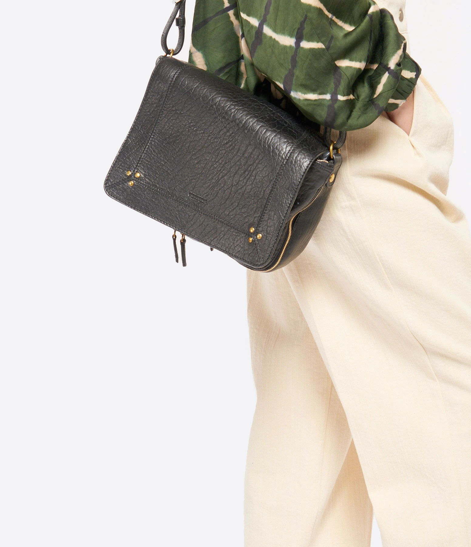 Sac à rabat en cuir bubble noir. Deux soufflets zippés permettant d’ajuster le volume du sac. Bandoulière réglable, non amovible. Intérieur doublé en coton avec trois compartiments dont un zippé et un autre fermé par des pressions.