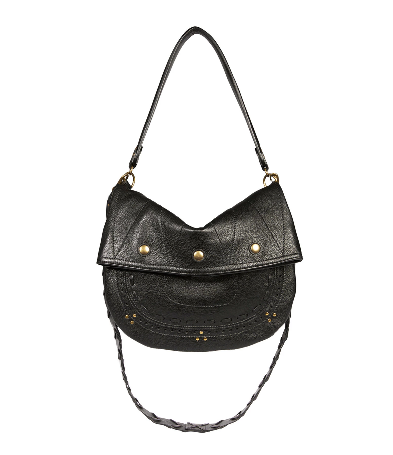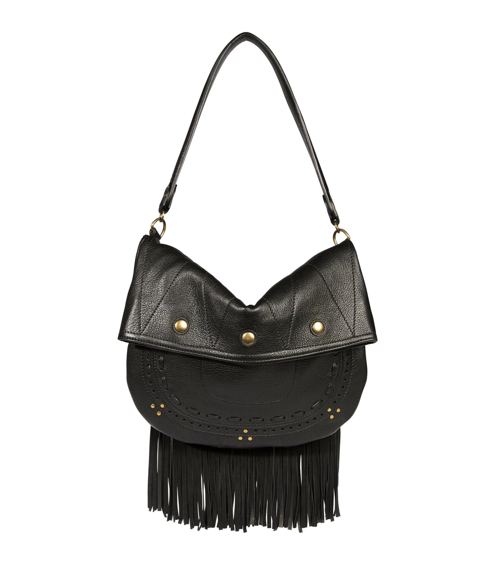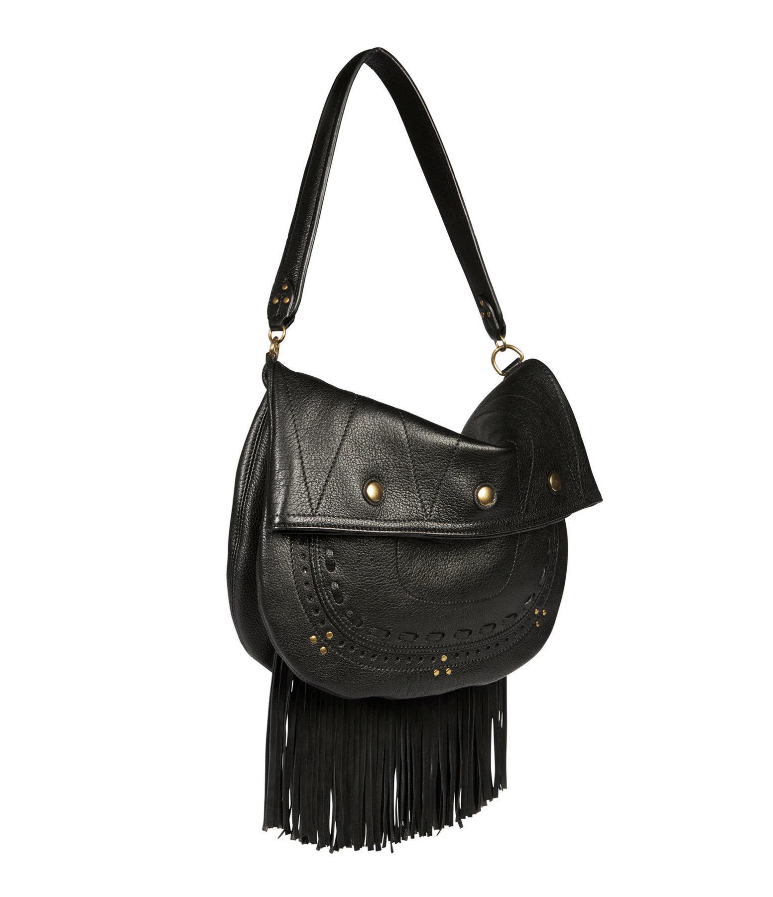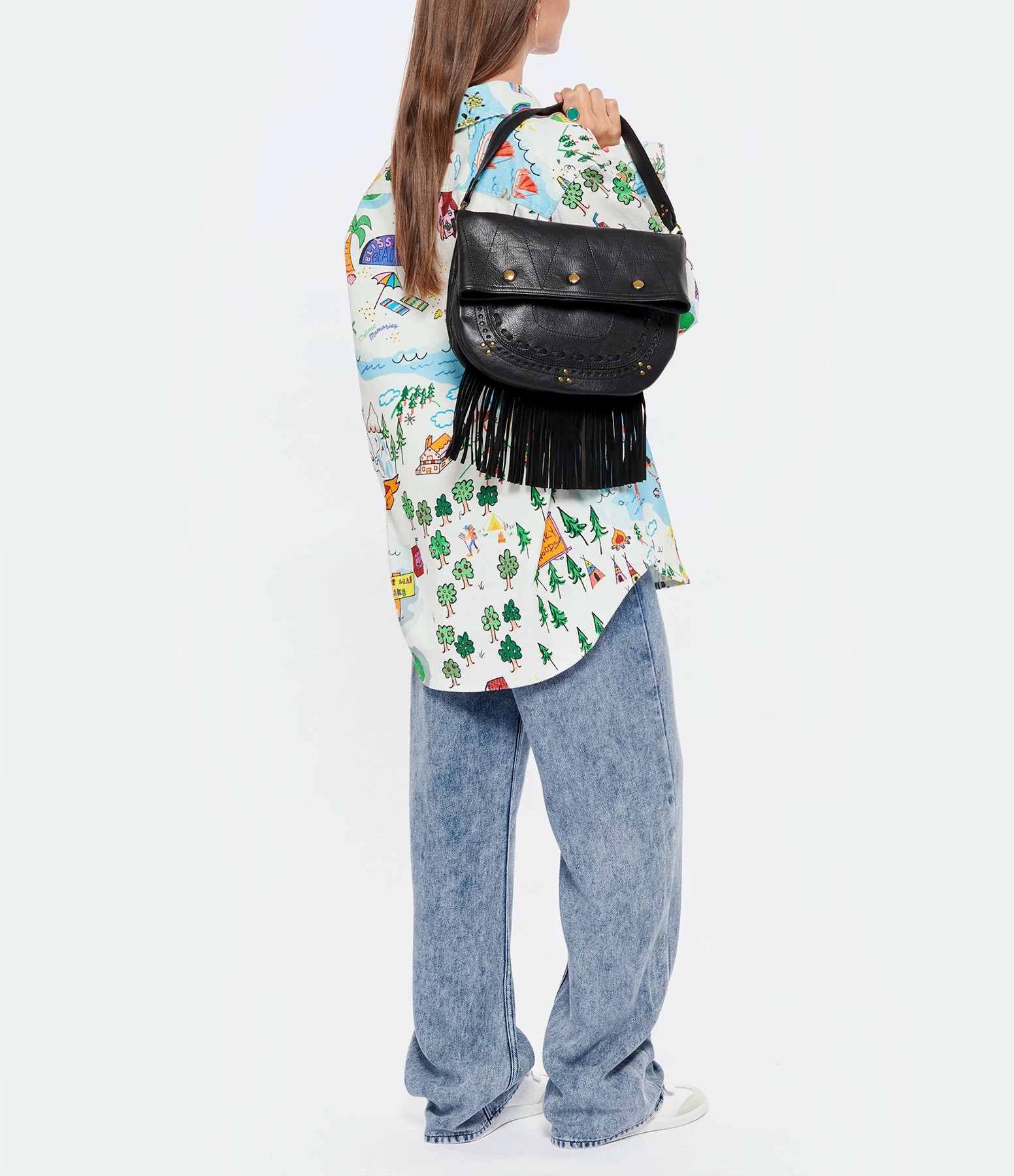 Sac à main en cuir grainé noir, avec franges amovibles par pressions sous le sac. Une anse et une bandoulière tressée amovible. Intérieur doublé en coton avec un compartiment dans le rabat, un sous le rabat, et une petite poche plaquée.