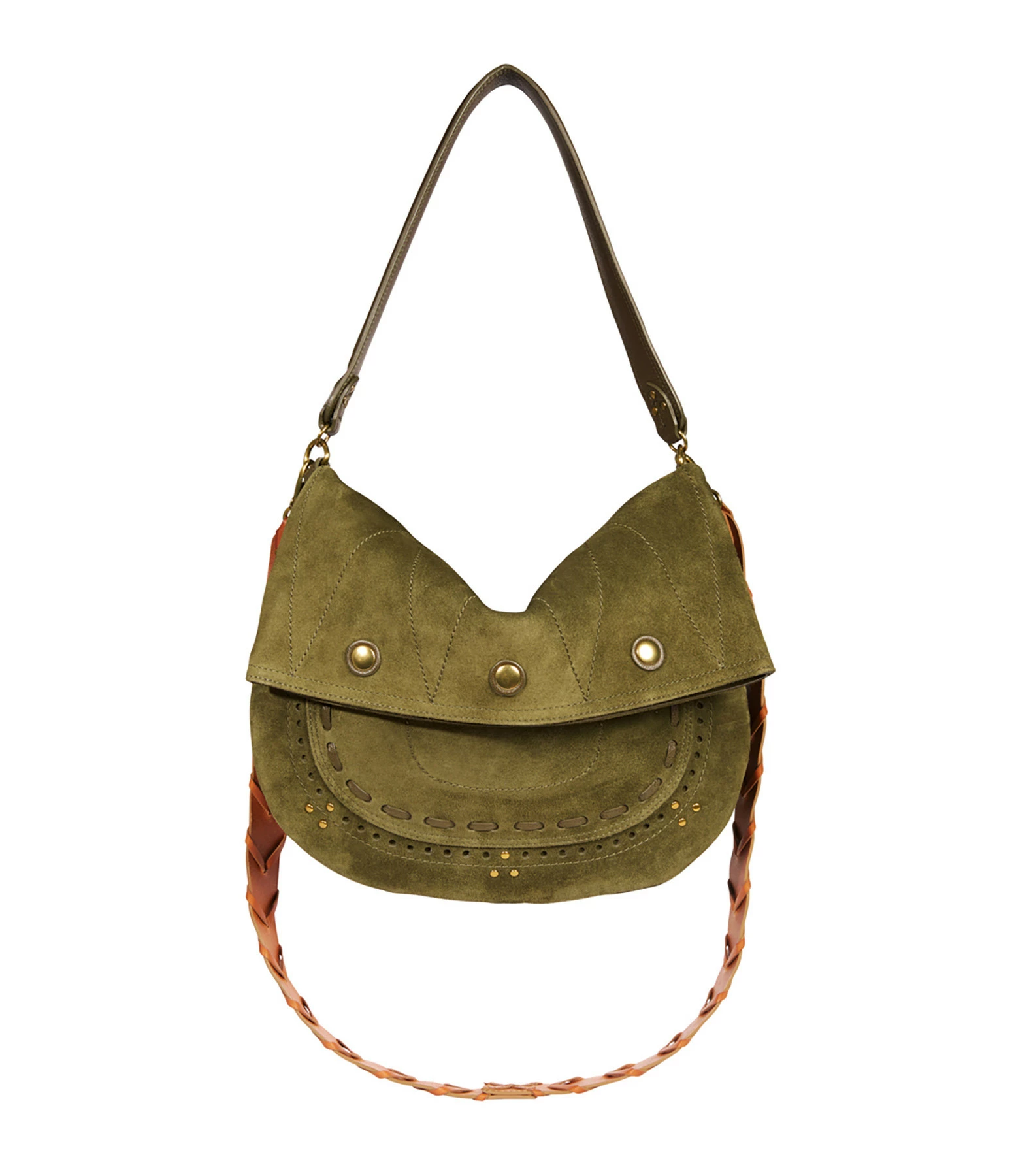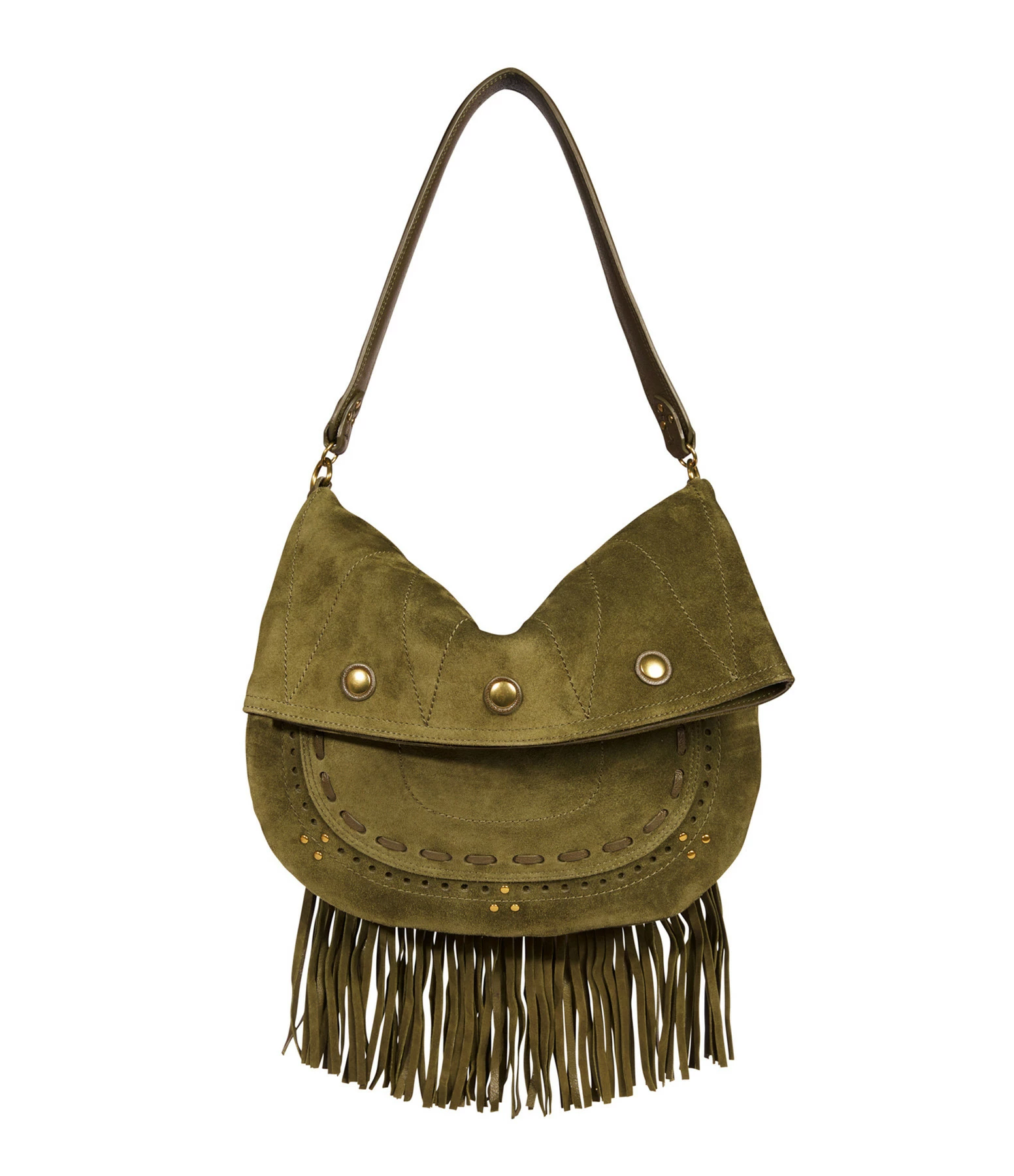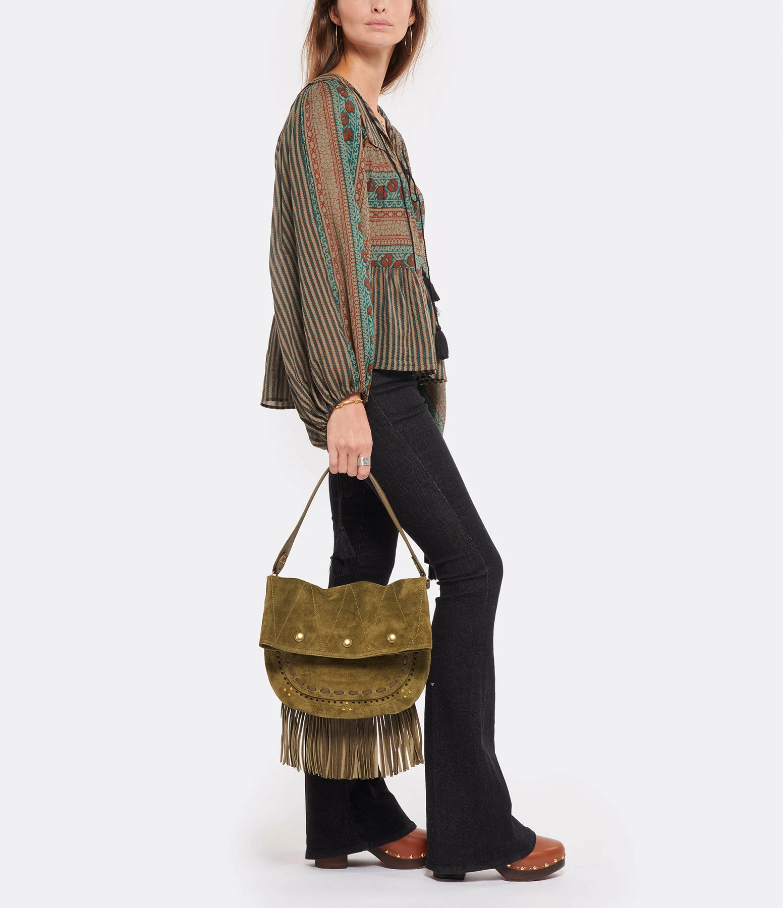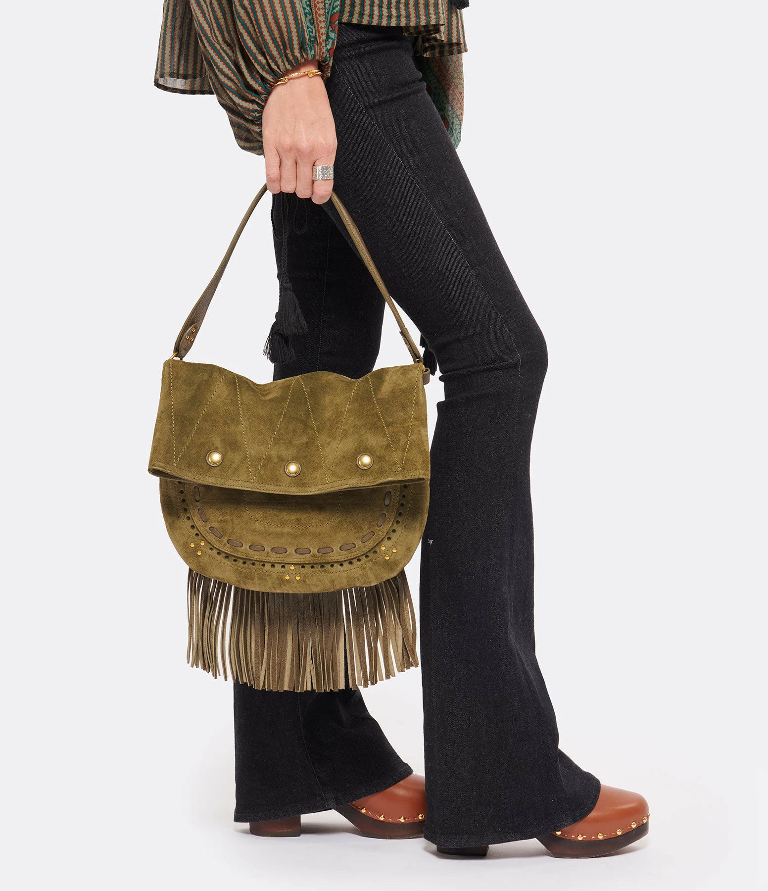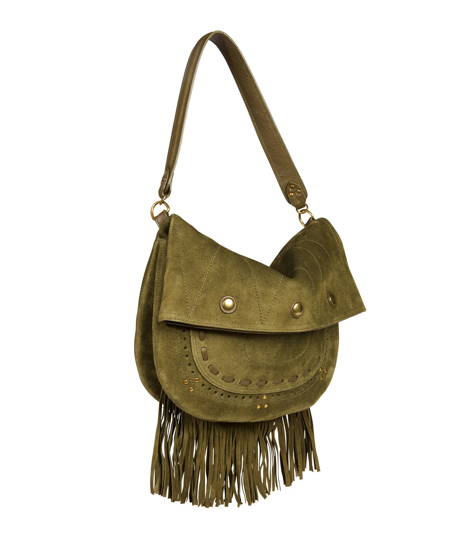 Sac à main en cuir suédé vert, avec franges amovibles par pressions sous le sac. Une anse et une bandoulière tressée amovible. Intérieur doublé en coton avec un compartiment dans le rabat, un sous le rabat, et une petite poche plaquée.