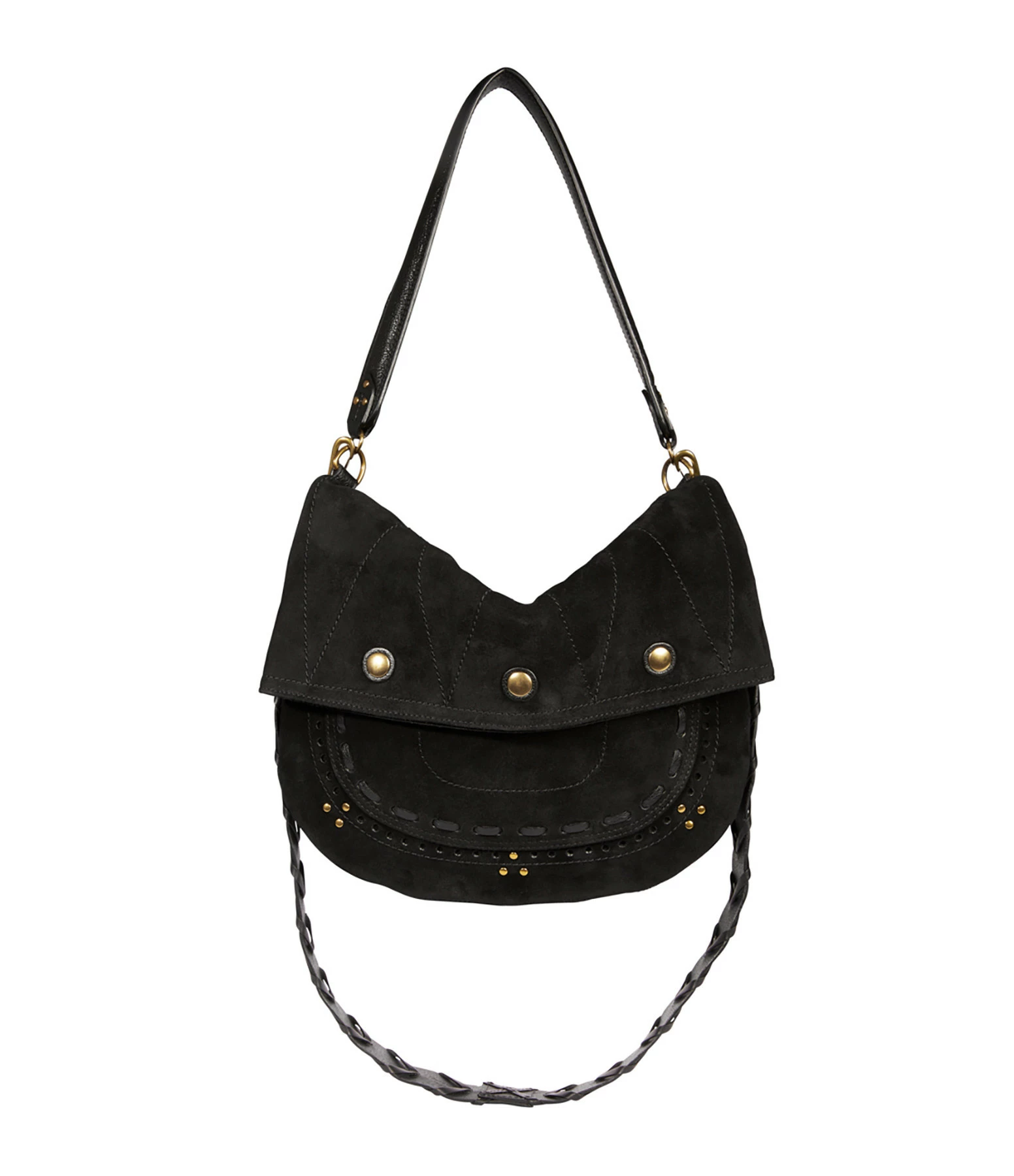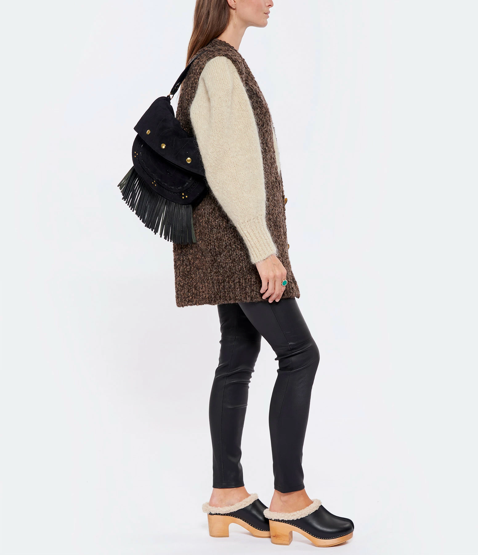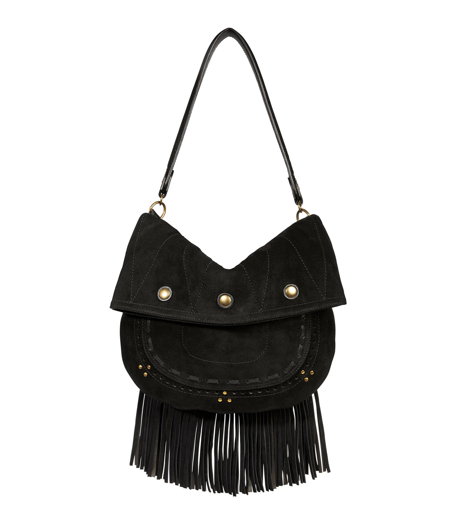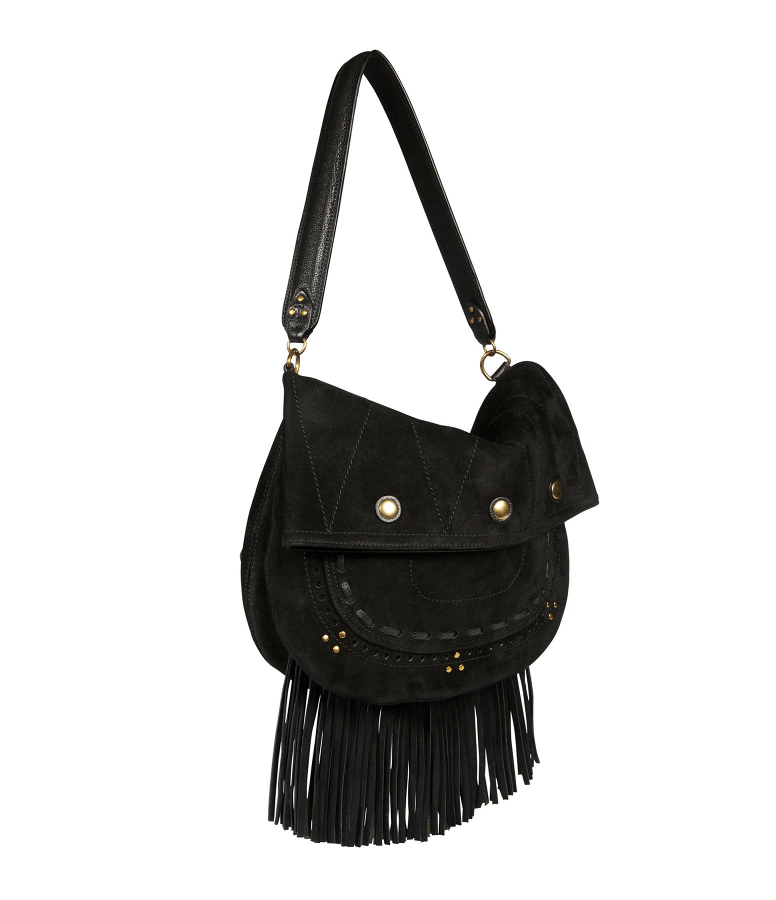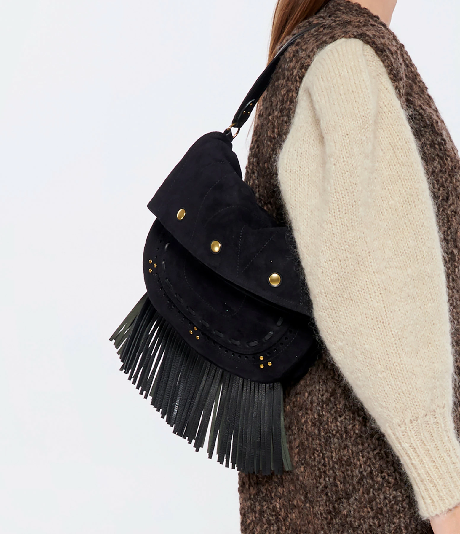 Sac à main en cuir suédé noir, avec franges amovibles par pressions sous le sac. Une anse et une bandoulière tressée amovible. Intérieur doublé en coton avec un compartiment dans le rabat, un sous le rabat, et une petite poche plaquée.