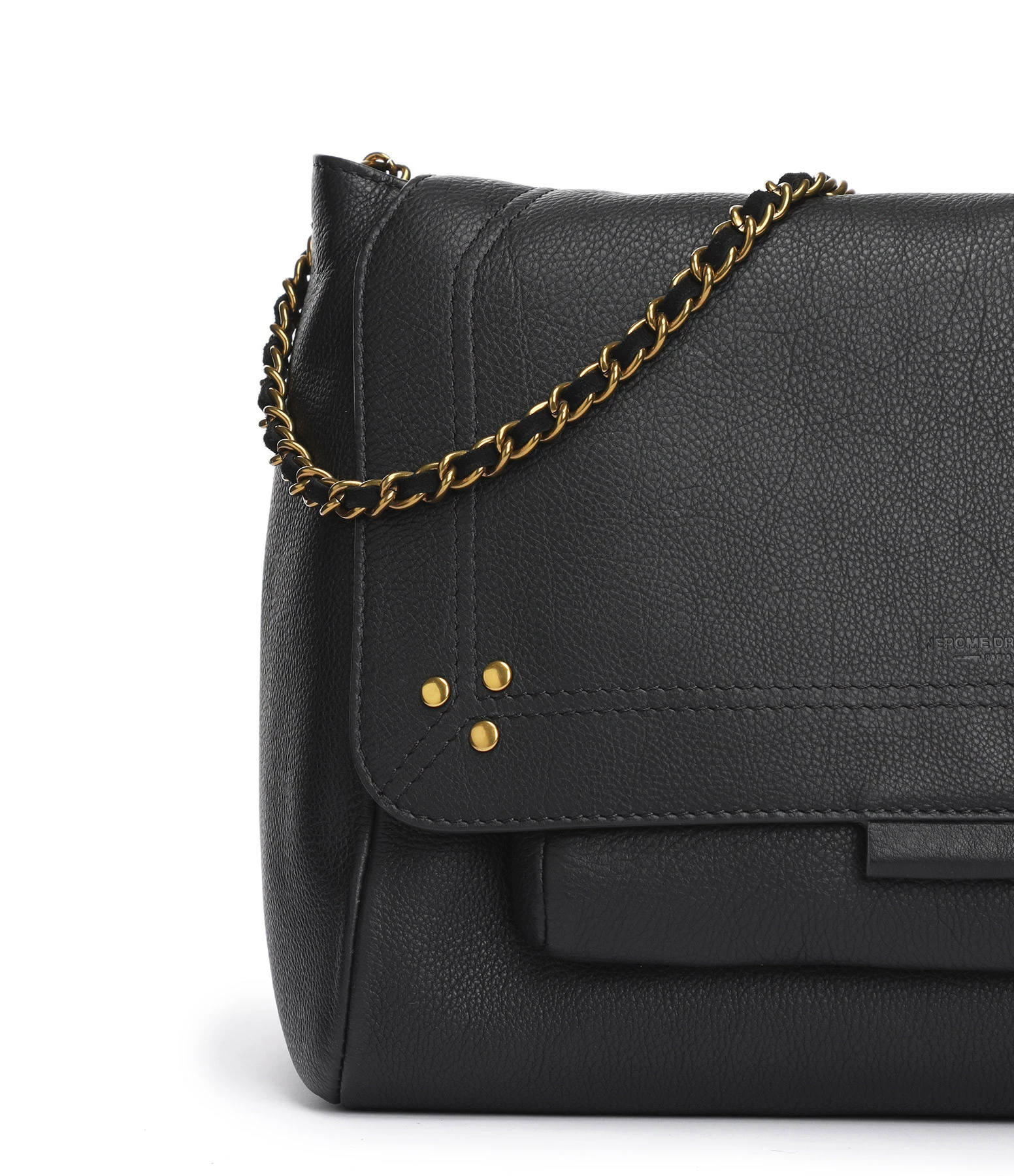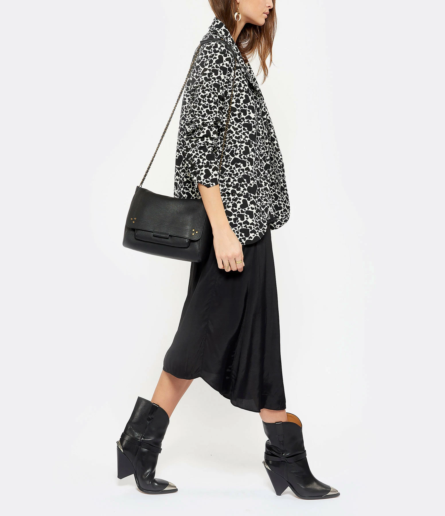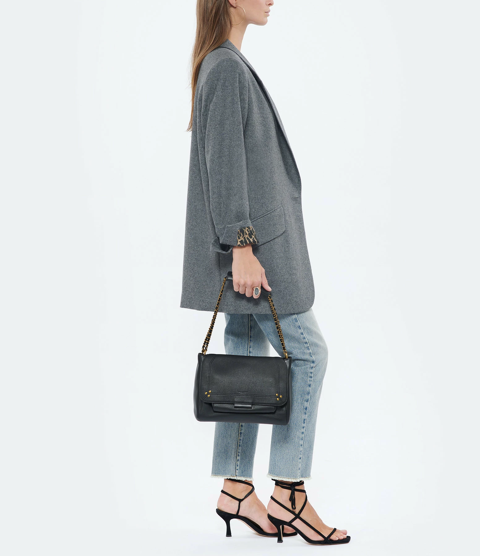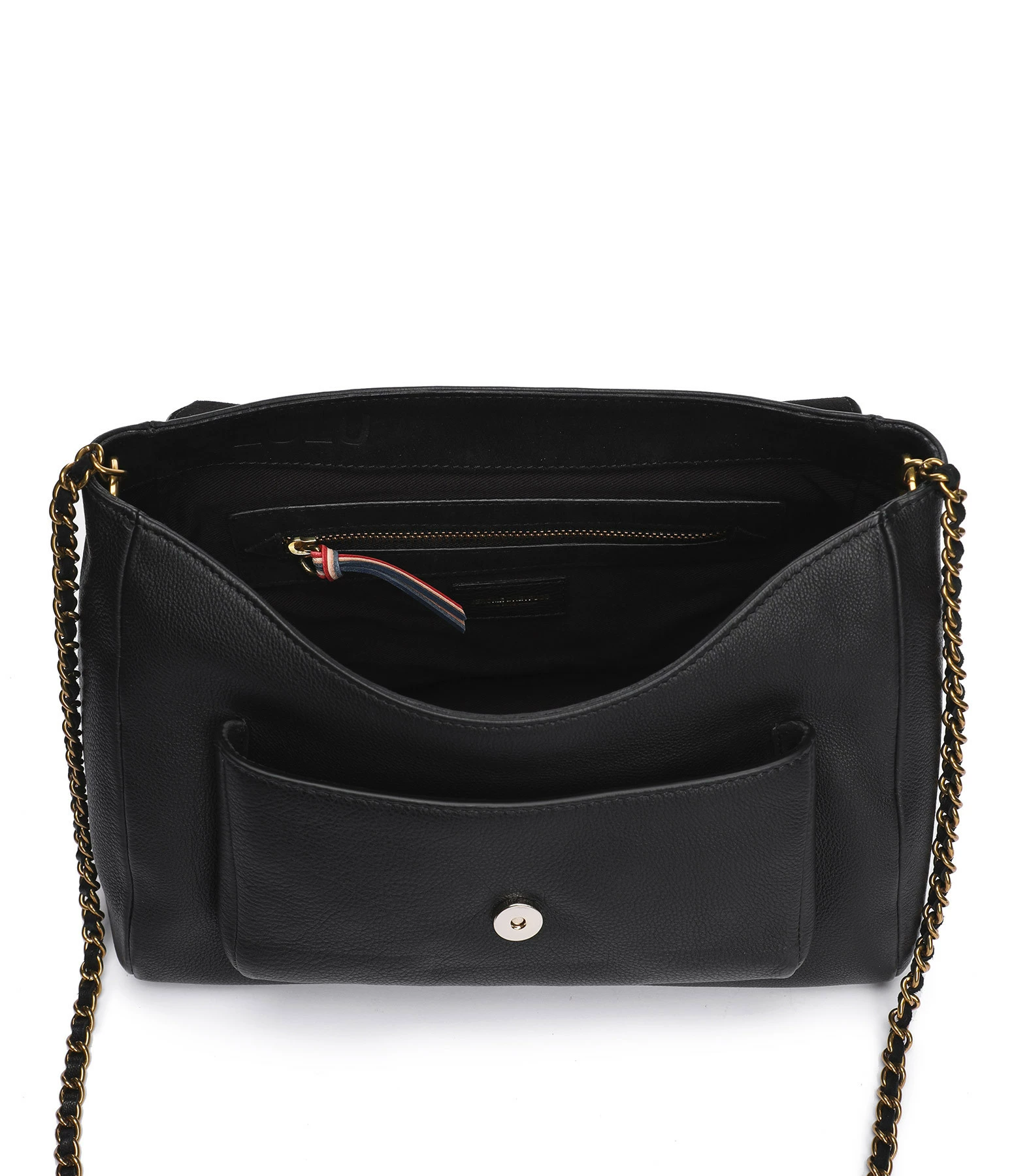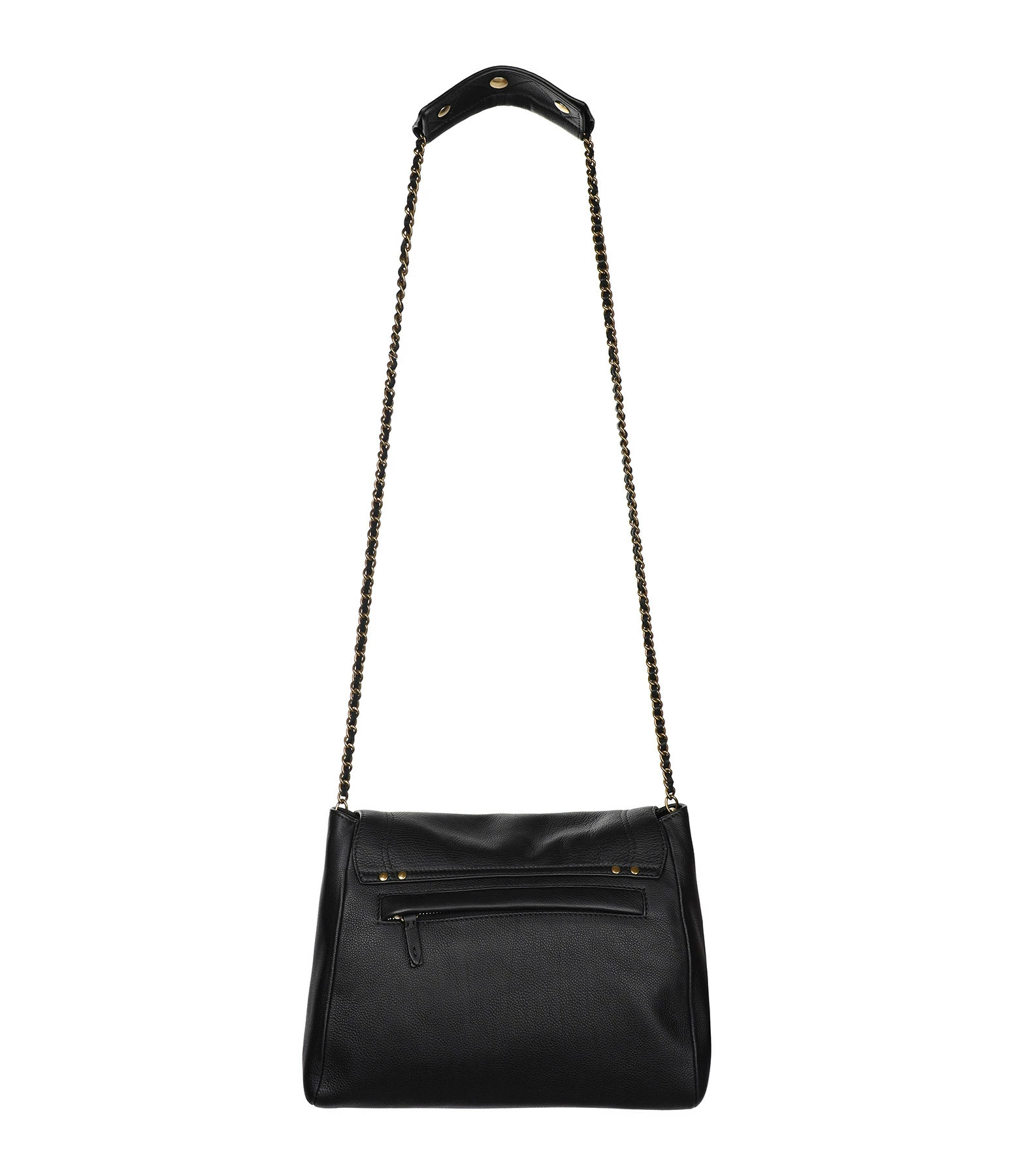Sac en cuir grainé noir avec poche zippée au dos. Bandoulière tressée en cuir et chaîne, amovible par mousquetons, et réglable en deux longueurs. Fermeture par rabat aimanté avec poche plaquée sous le rabat. Intérieur doublé en coton avec une poche zippée.