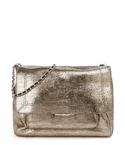 Sac en cuir lamé champagne avec poche zippée au dos. Bandoulière tressée en cuir et chaîne, amovible par mousquetons, et réglable en deux longueurs. Fermeture par rabat aimanté avec poche plaquée sous le rabat. Intérieur doublé en coton avec une poche zippée.
