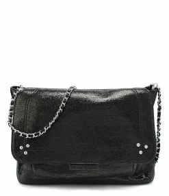Sac en cuir lamé noir avec poche zippée au dos. Bandoulière tressée en cuir et chaîne, amovible par mousquetons, et réglable en deux longueurs. Fermeture par rabat aimanté avec poche plaquée sous le rabat. Intérieur doublé en coton avec une poche zippée.