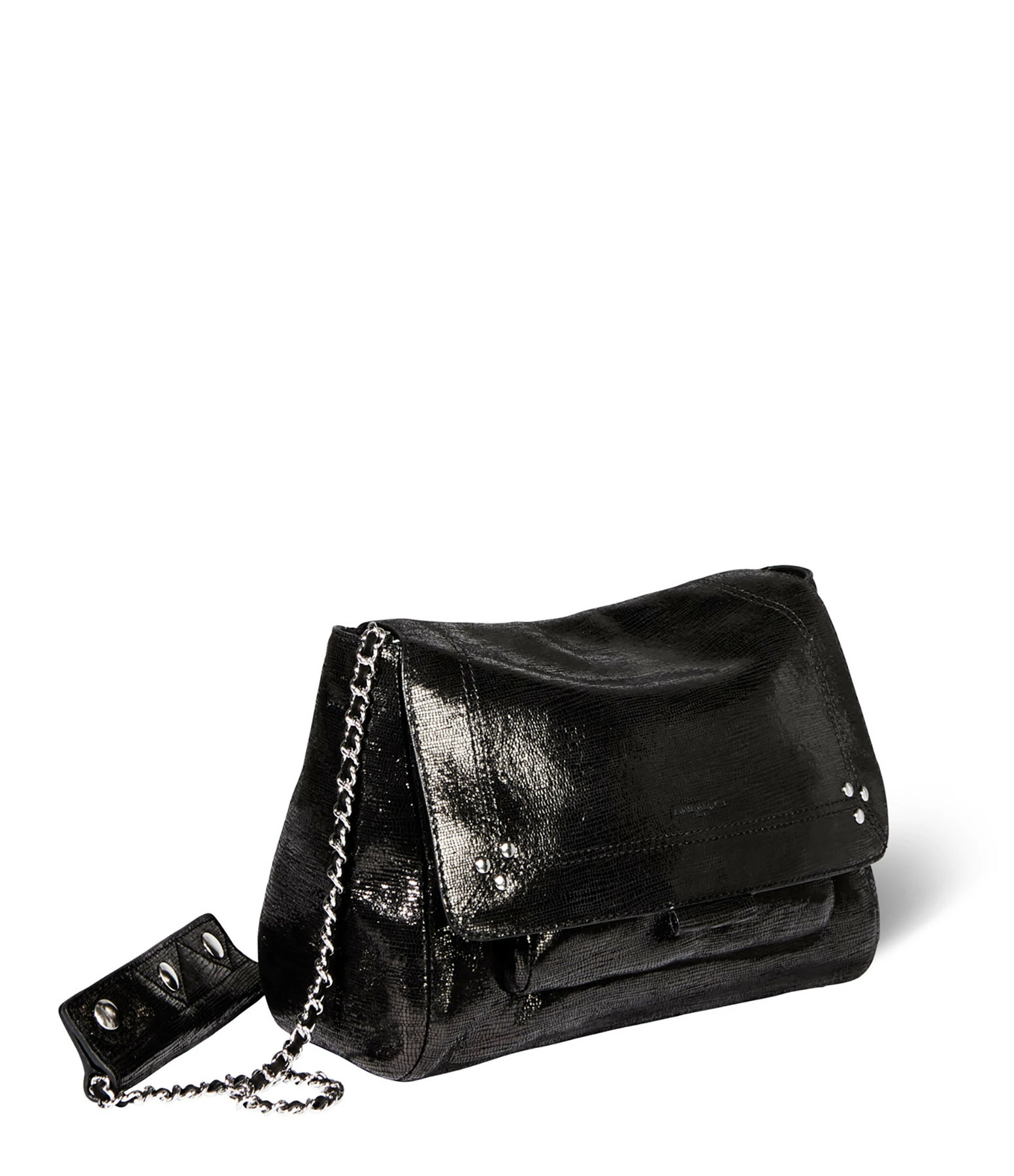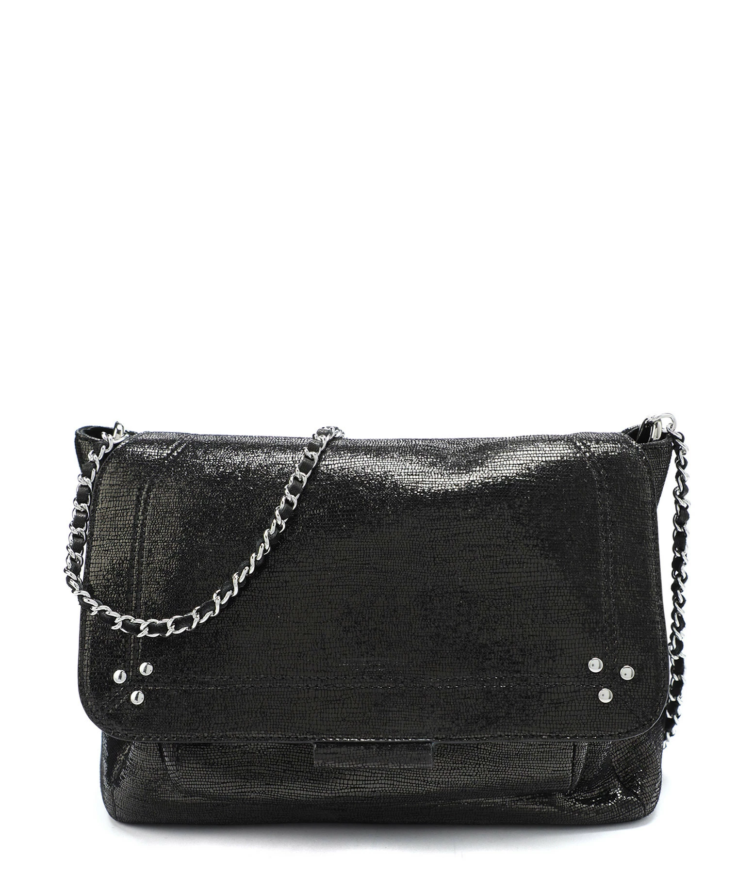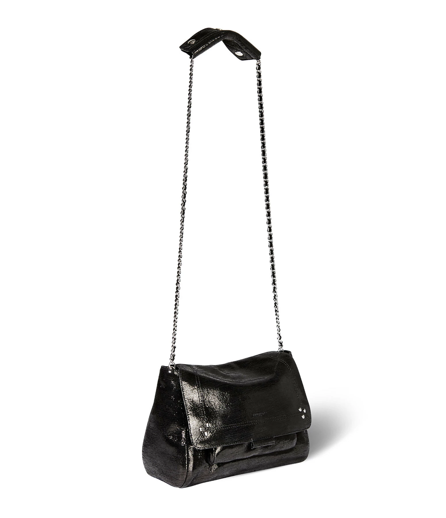 Sac en cuir lamé noir avec poche zippée au dos. Bandoulière tressée en cuir et chaîne, amovible par mousquetons, et réglable en deux longueurs. Fermeture par rabat aimanté avec poche plaquée sous le rabat. Intérieur doublé en coton avec une poche zippée.
