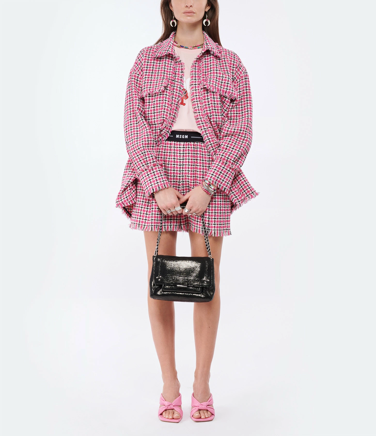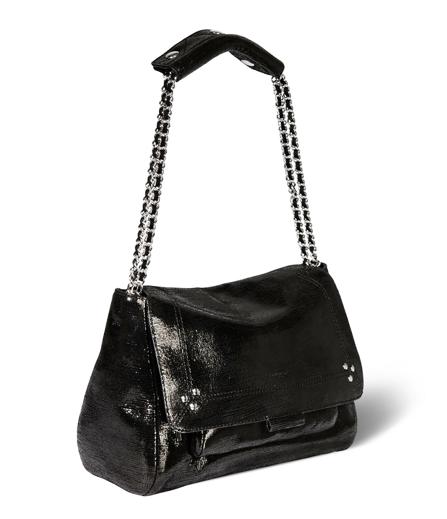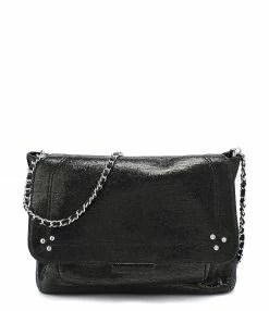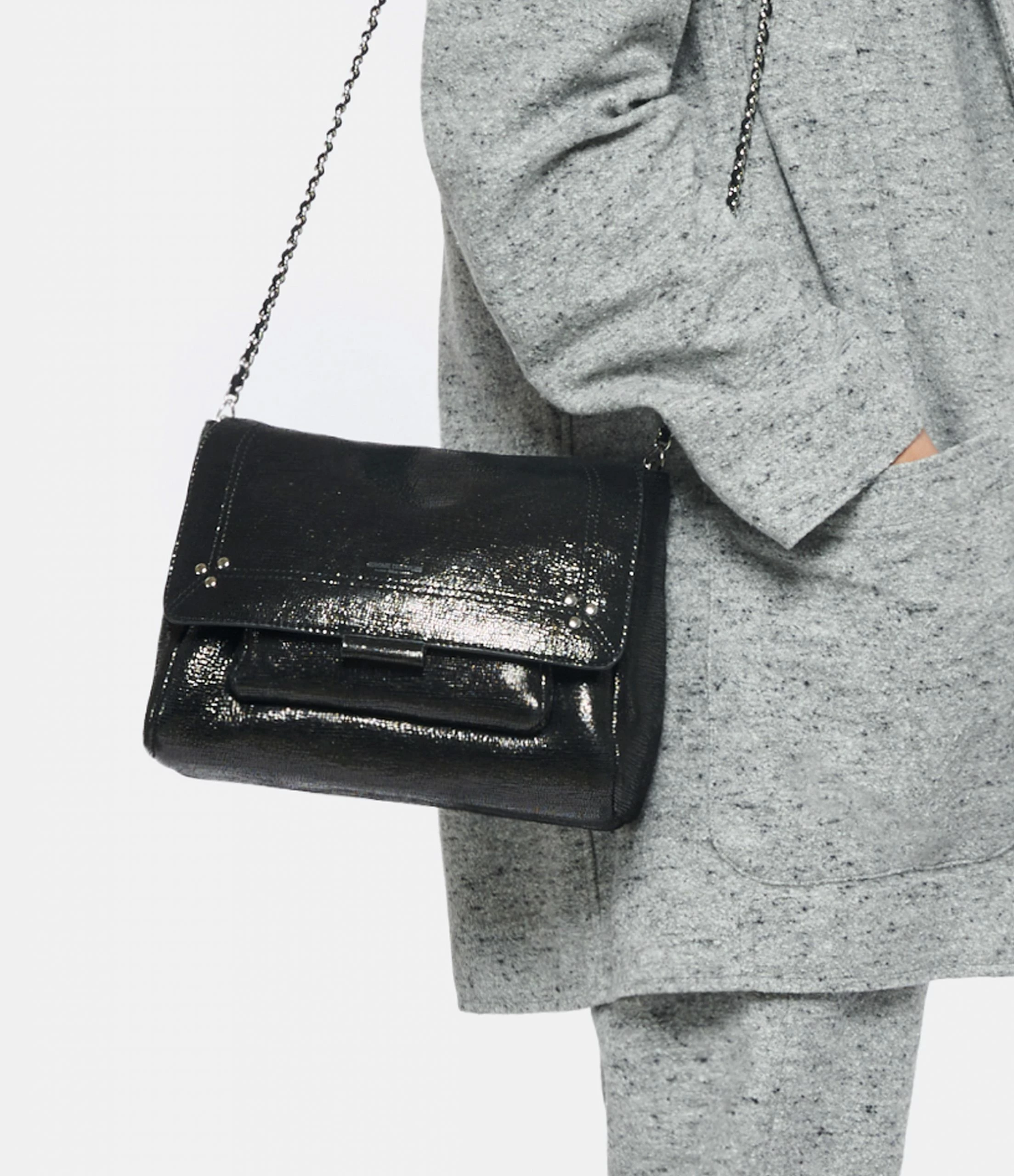 Sac en cuir lamé noir avec poche zippée au dos. Bandoulière tressée en cuir et chaîne, amovible par mousquetons, et réglable en deux longueurs. Fermeture par rabat aimanté avec poche plaquée sous le rabat. Intérieur doublé en coton avec une poche zippée.