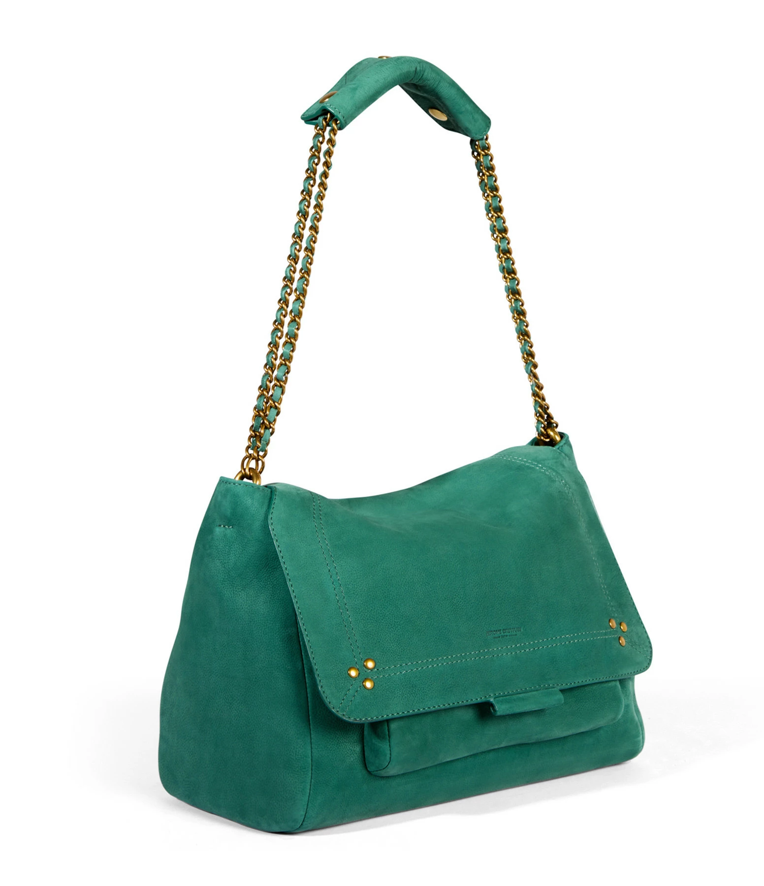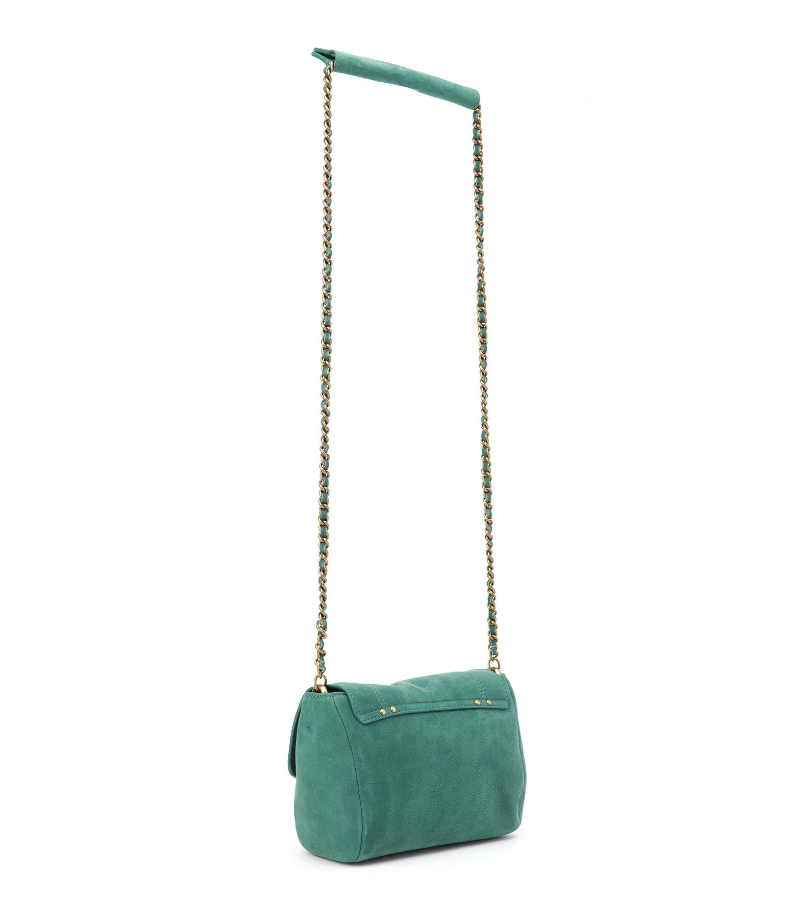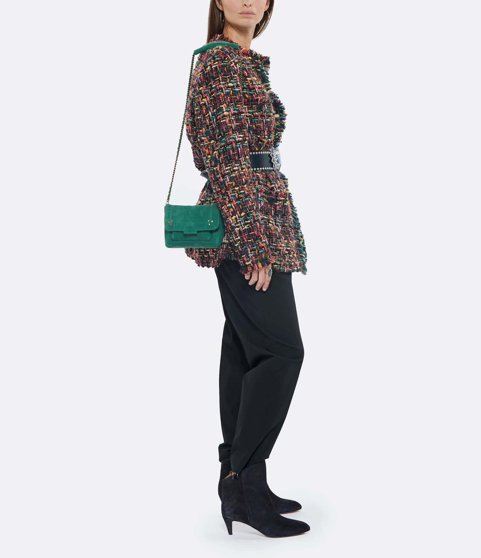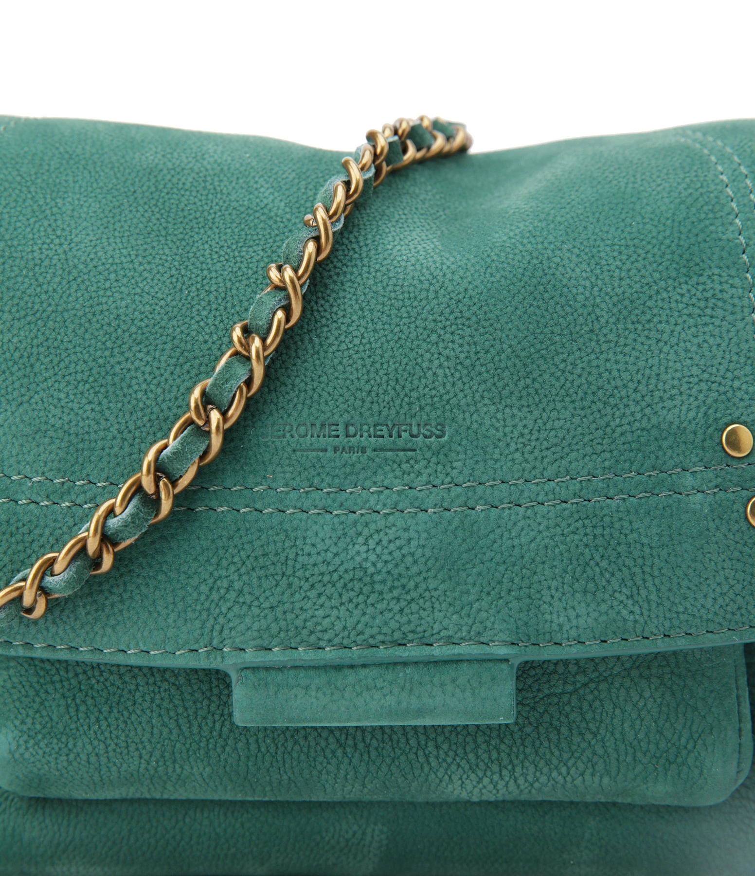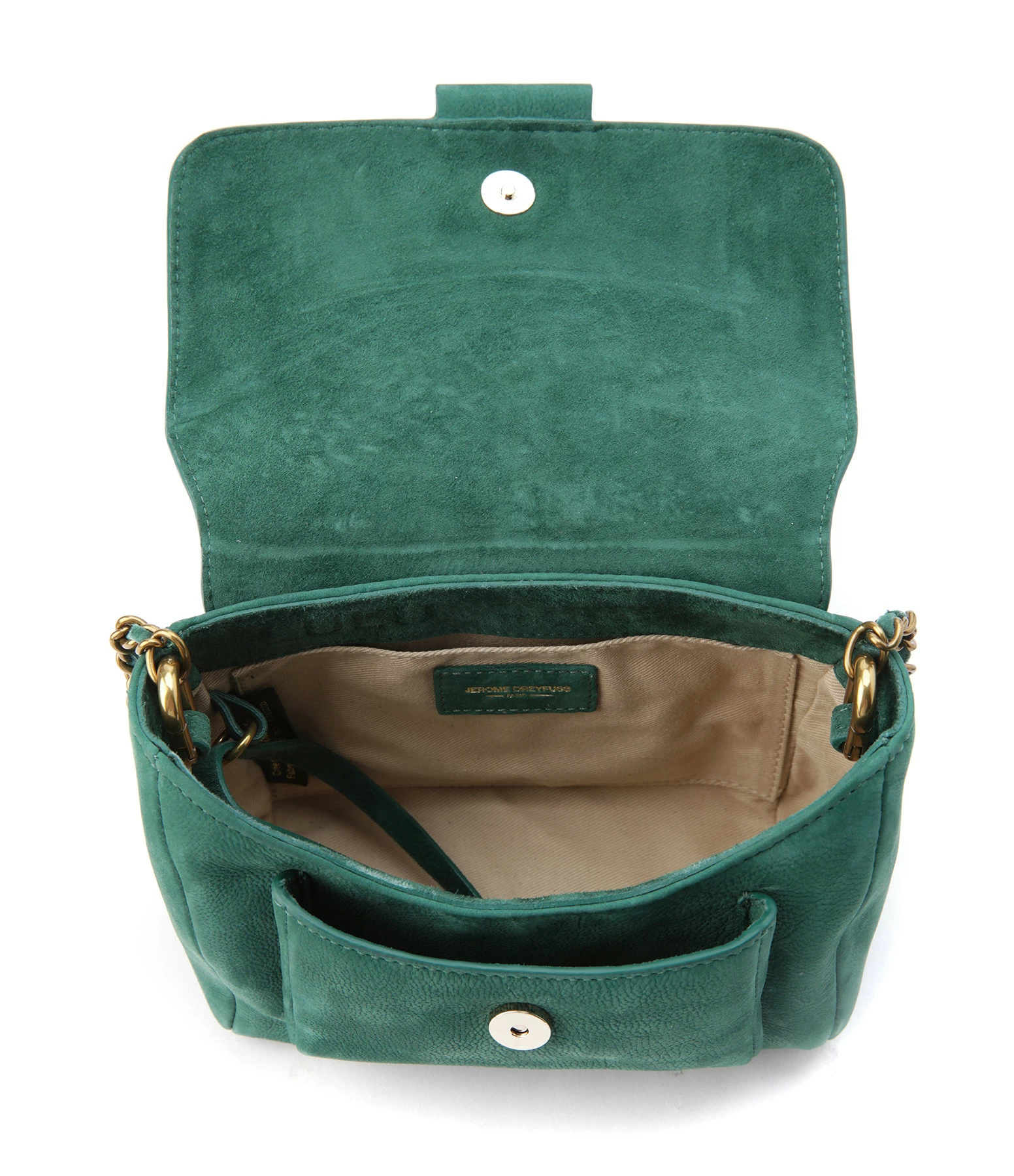 Sac en cuir suédé vert jade, avec poche zippée au dos. Bandoulière tressée en cuir et chaîne, amovible par mousquetons, et réglable en deux longueurs. Fermeture par rabat aimanté avec poche plaquée sous le rabat. Intérieur doublé en coton avec une poche zippée.