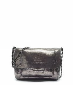 Sac en cuir lamé champagne avec poche zippée au dos. Bandoulière tressée en cuir et chaîne, amovible par mousquetons, et réglable en deux longueurs. Fermeture par rabat aimanté avec poche plaquée sous le rabat. Intérieur doublé en coton avec une poche zippée.