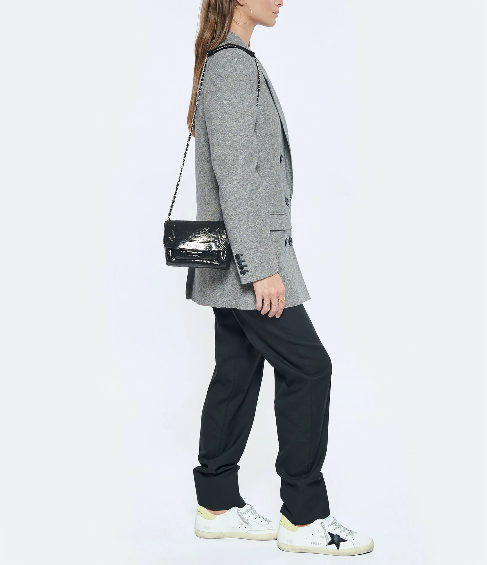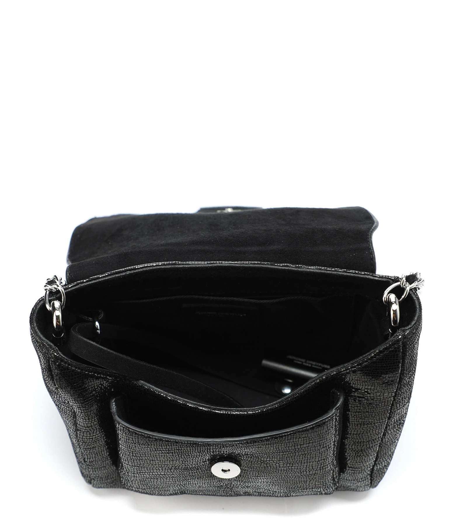 Sac en cuir lamé doré avec poche zippée au dos. Bandoulière tressée en cuir et chaîne, amovible par mousquetons, et réglable en deux longueurs. Fermeture par rabat aimanté avec poche plaquée sous le rabat. Intérieur doublé en coton avec une poche zippée.