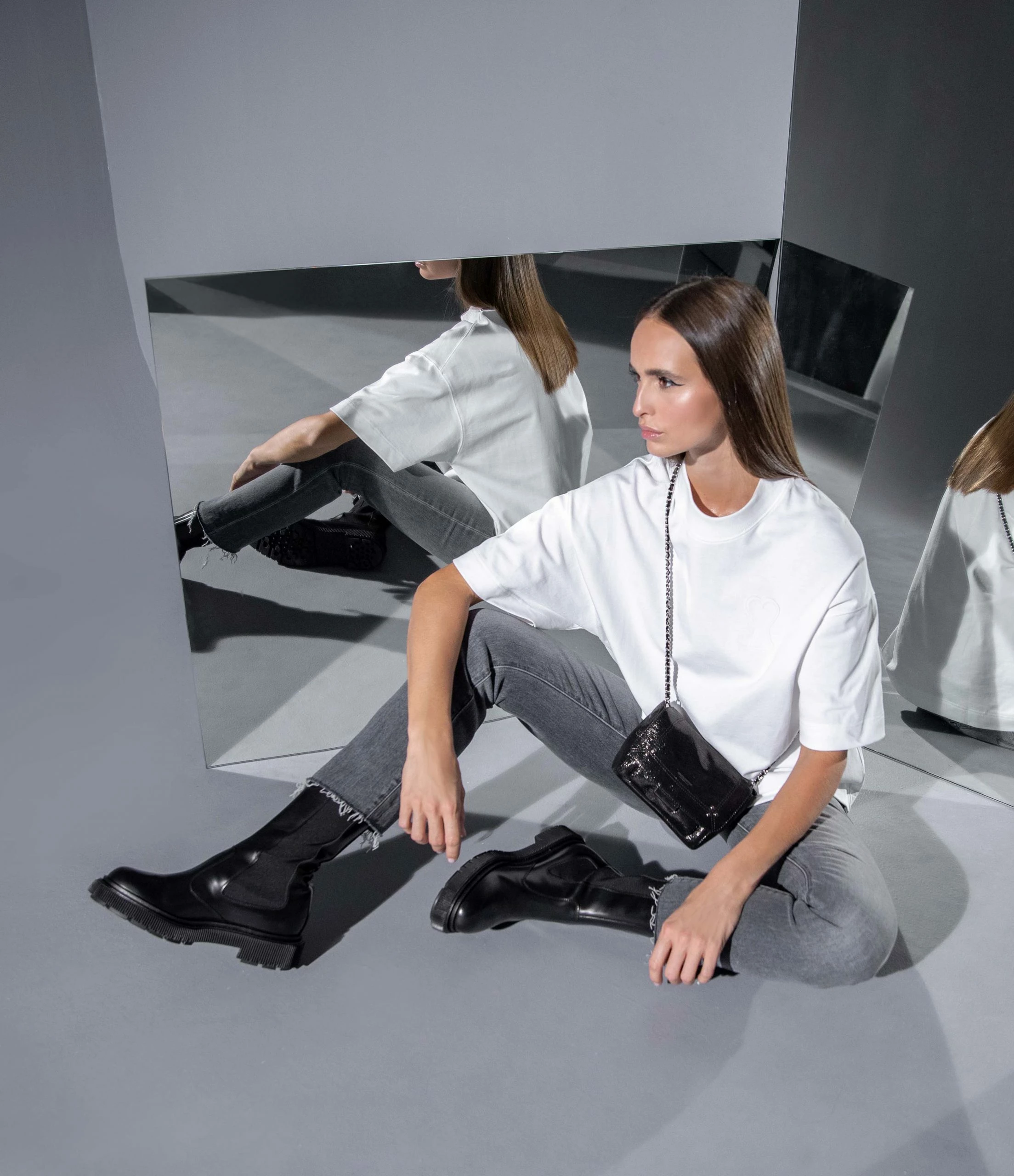 Plus d’infos : Pour obtenir ce rendu, les peaux de chèvre sont tannées, puis un film lamé coloré est appliqué sur le côté velours du cuir pour adhérer à la matière.