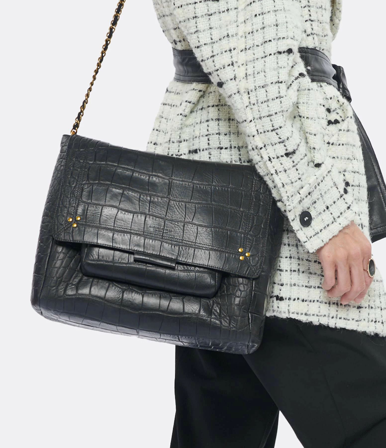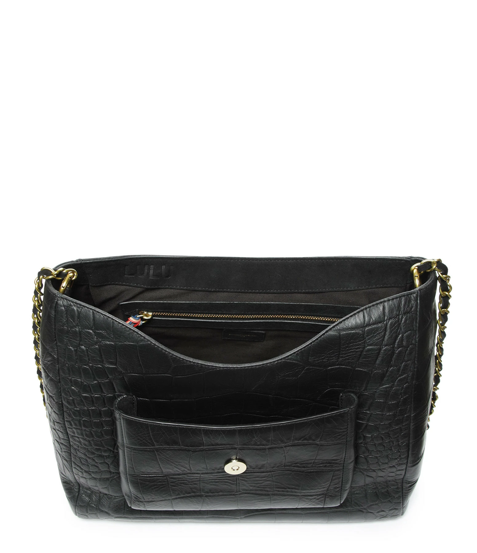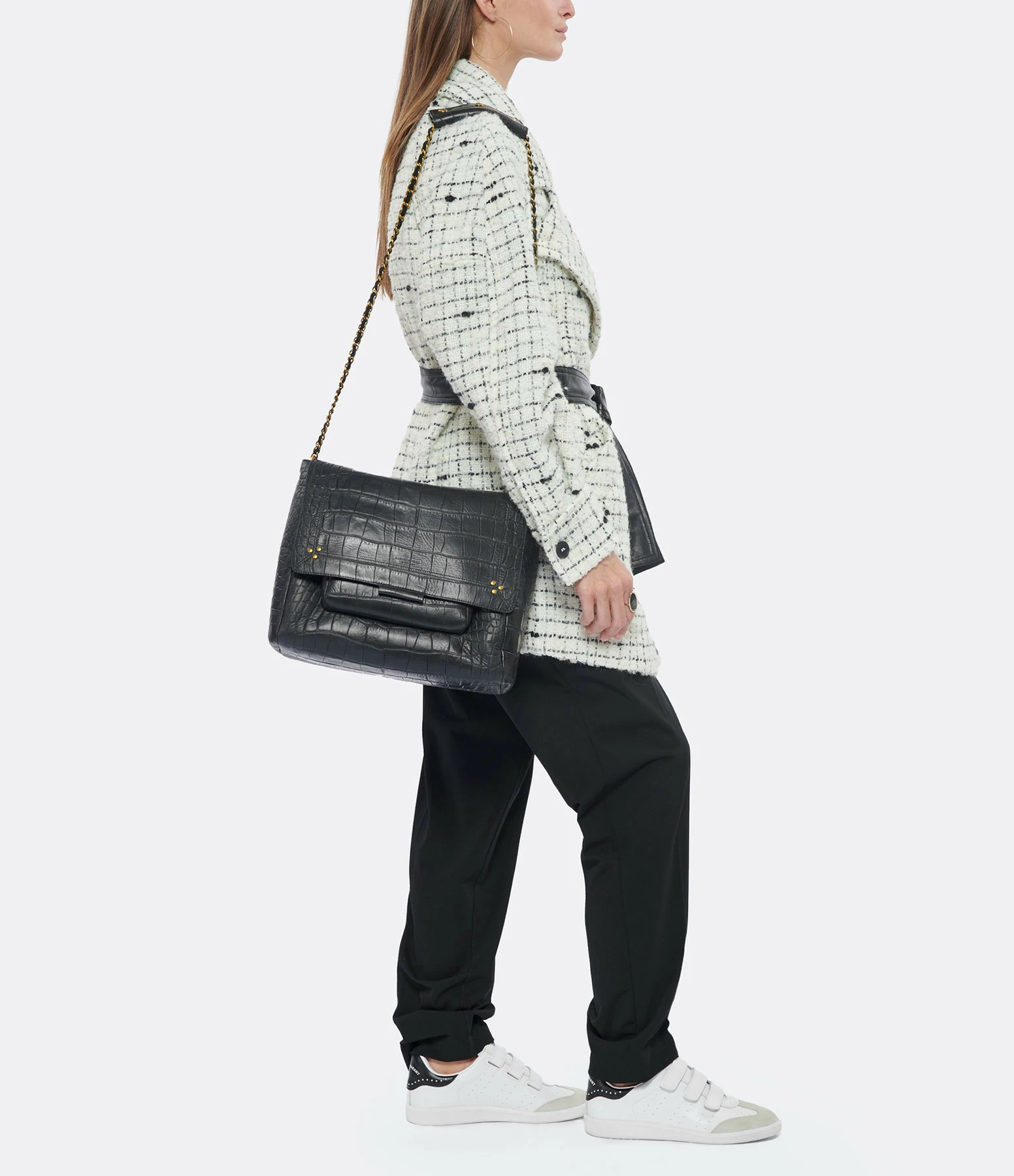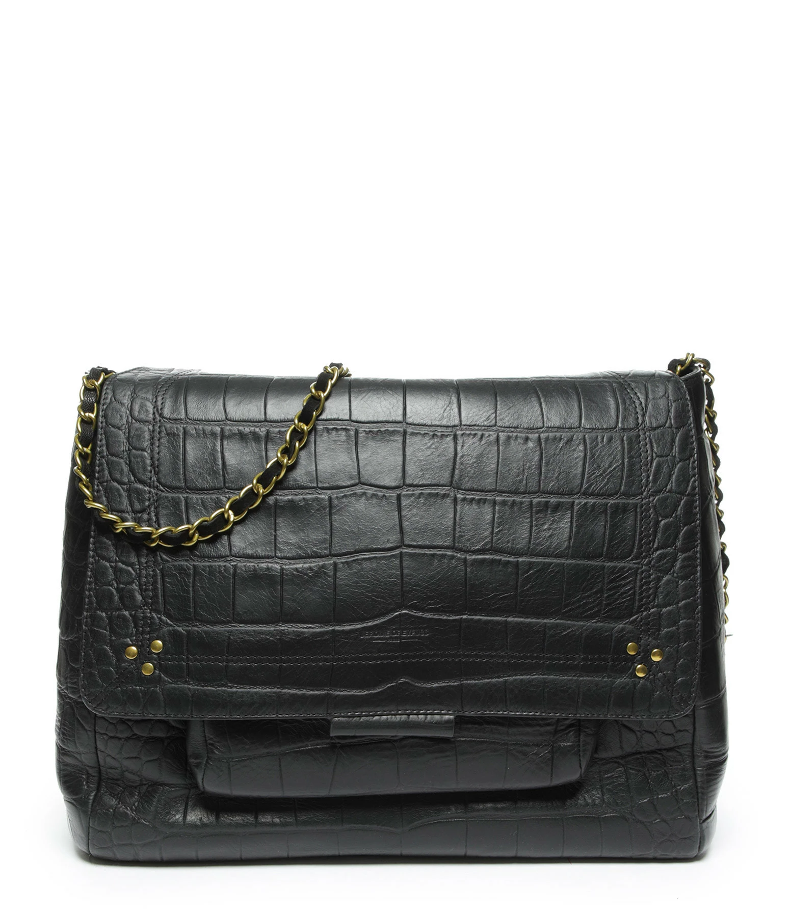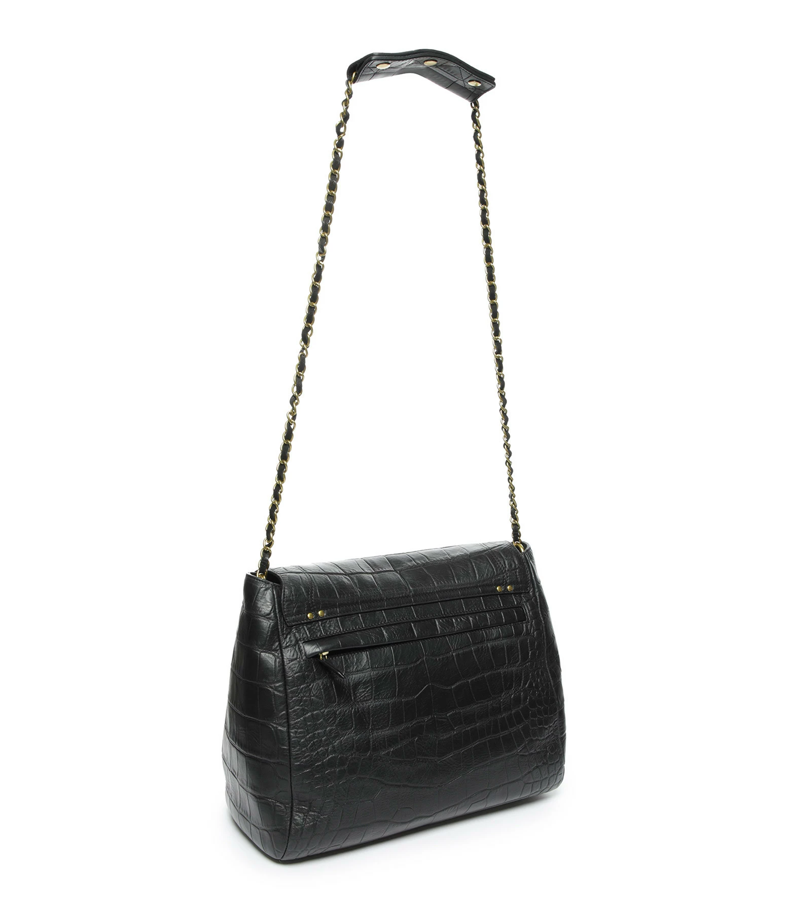 Sac en cuir effet croco noir, avec poche zippée au dos. Bandoulière tressée en cuir et chaîne, amovible par mousquetons, et réglable en deux longueurs. Fermeture par rabat aimanté avec poche plaquée sous le rabat. Intérieur doublé en coton avec une poche zippée.